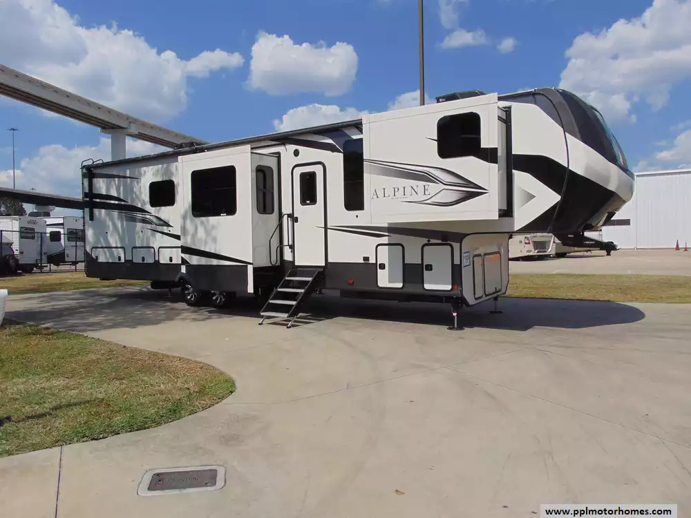 This 2022 Alpine 3790FK is a luxurious fifth-wheel RV designed for comfort,style, and high-end living on the road.Features Include...Hydraulic Landing Gear, 5 Slide-outs, 2 Ducted Air Conditioners, 110v Residential Samsung Refrigerator, Stand-Alone Ice Maker, Automatic Main Awning, Washer/Dryer, Solar Panel, Outside Entertainment System, TV, Outside Shower, Central Vacuum, Convection Microwave, 3 Burner Range,and Oven.It offers a high-end, residential experience on the road with its distinctive front kitchen layout, premium finishes, and spacious design.