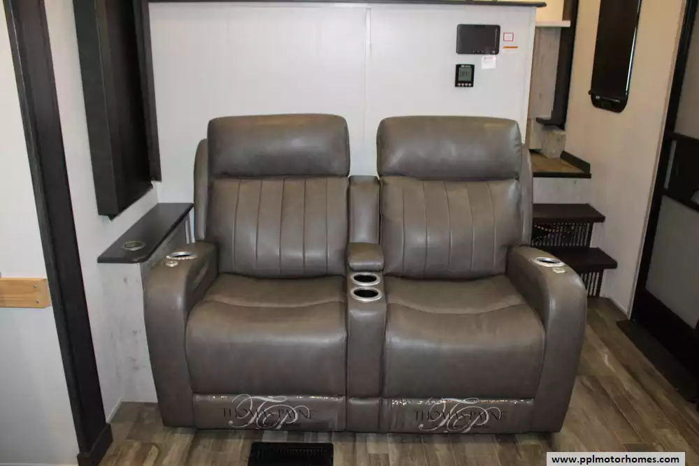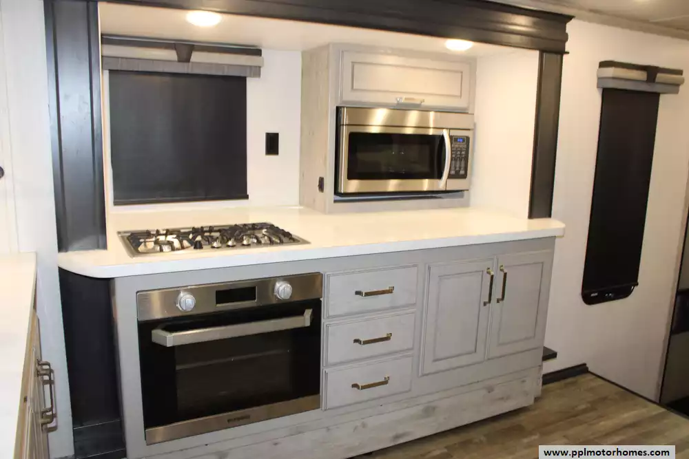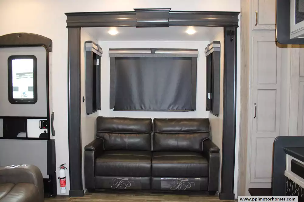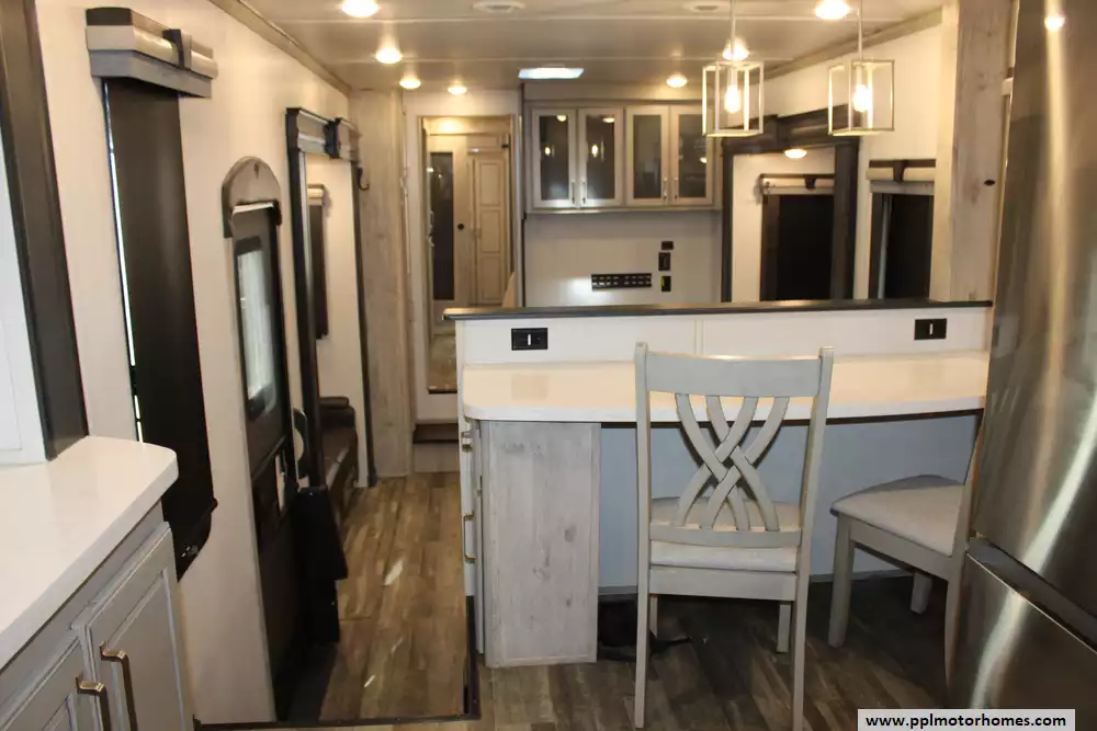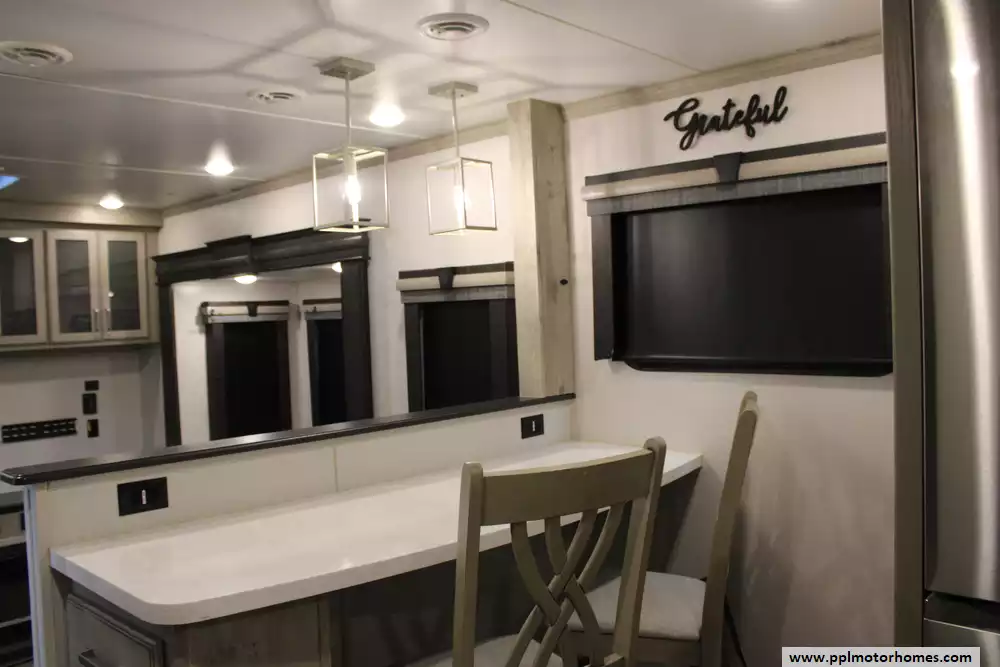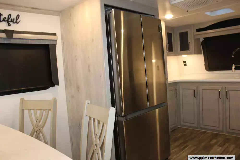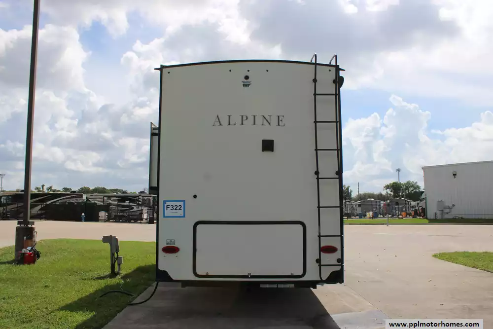 This 2022 Alpine 3790FK has a very home-like feel thanks to wide body, tall slides, high ceilings, large windows. Feels less like camping and more like a house on wheels. Features Include...Hydraulic Landing Gear, 4 Slide-outs, 2 Ducted Air Conditioners, 110v Residential Samsung Refrigerator, In-Fridge Ice Maker, Automatic Main Awning, Washer/Dryer, Outside Speakers, 2 TVs, Outside Shower, Fireplace, Central Vacuum, Microwave, 3 Burner Range, and Oven.