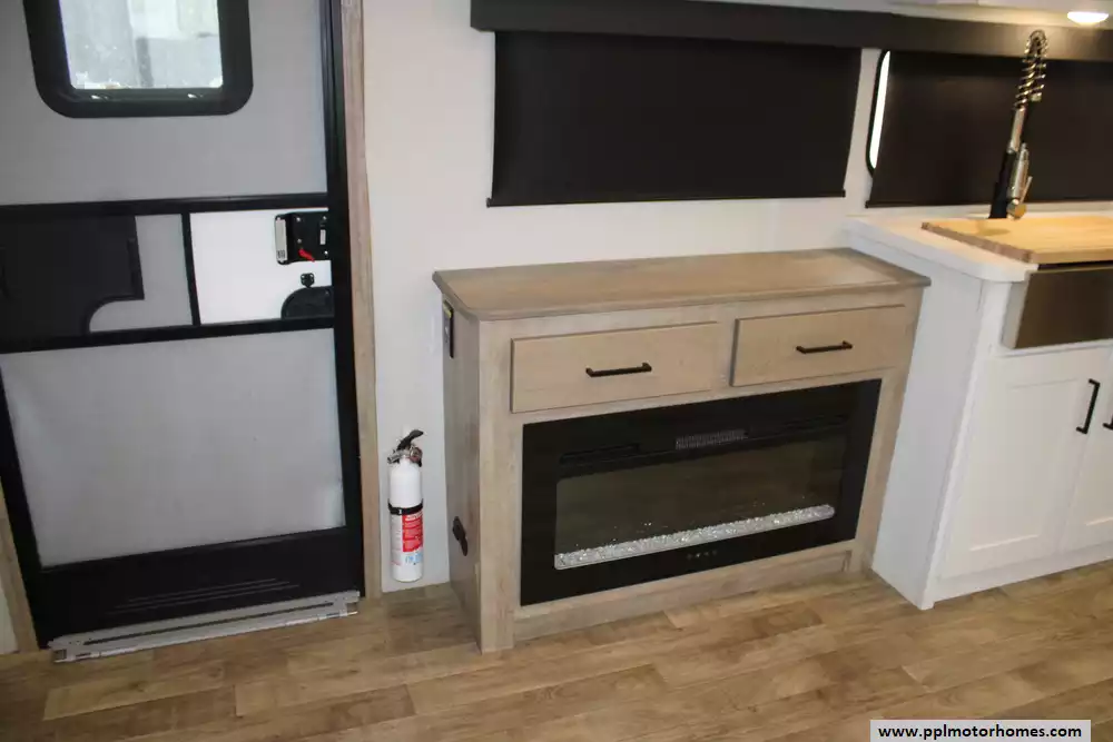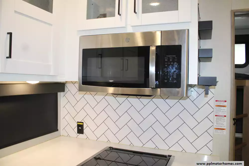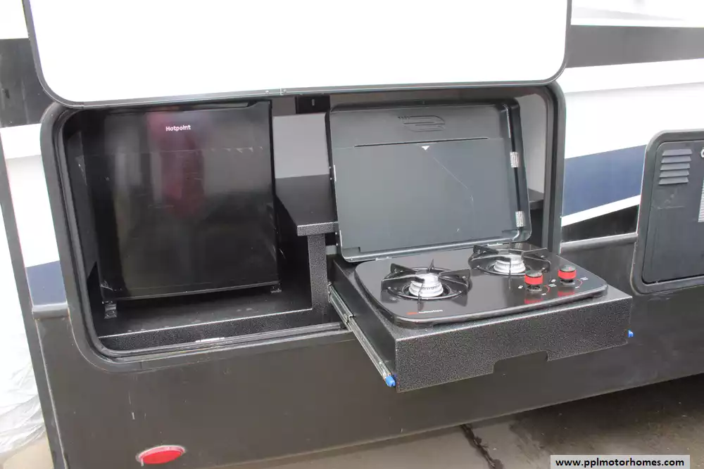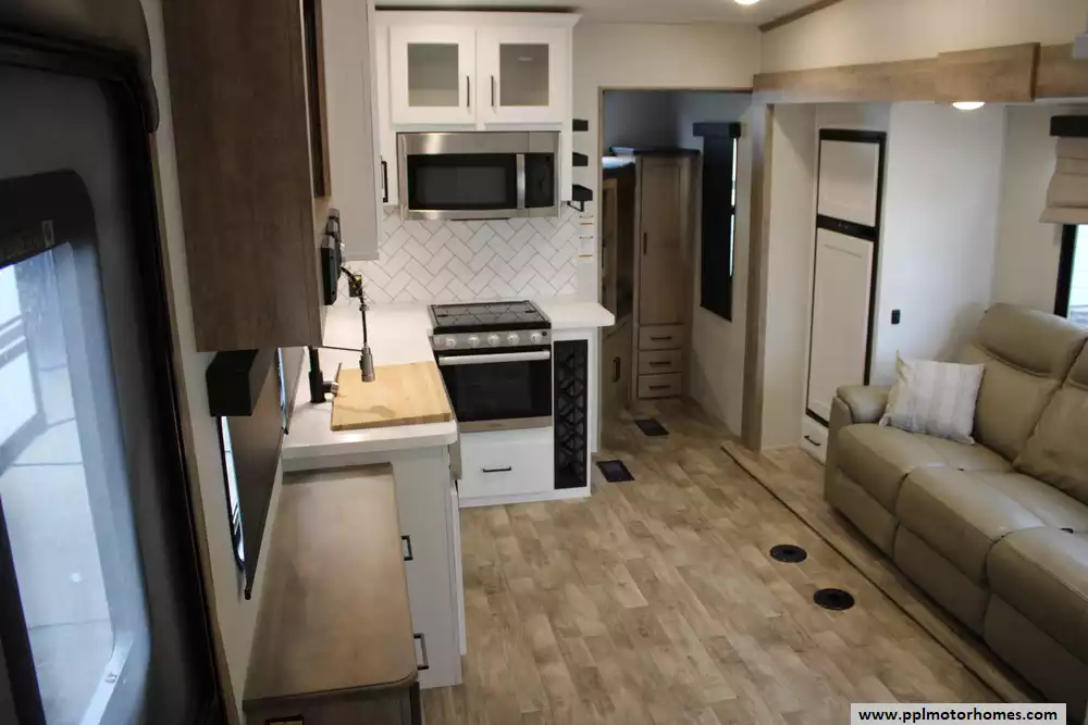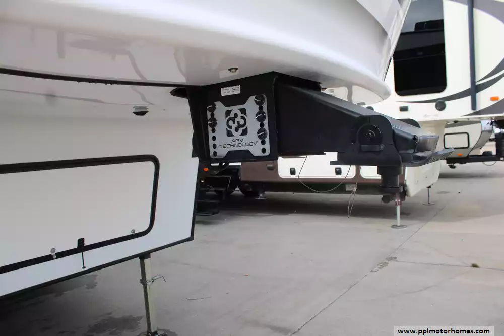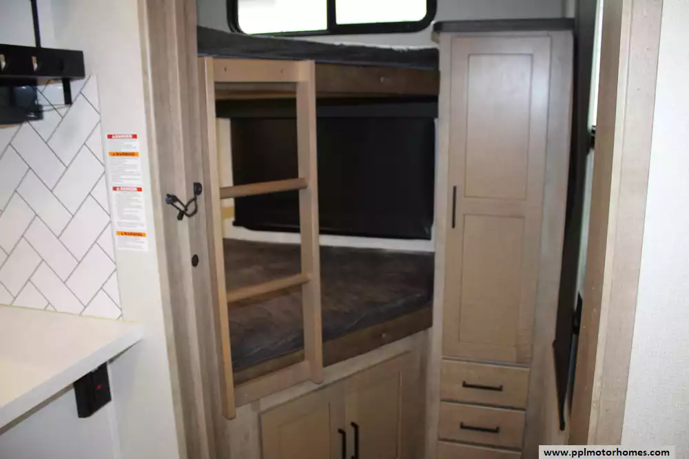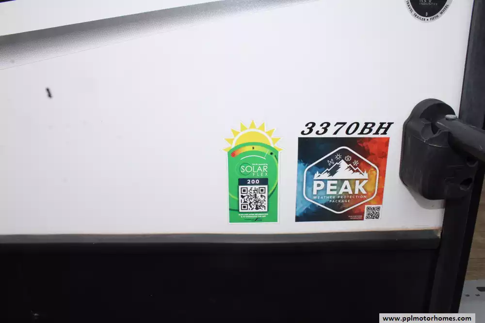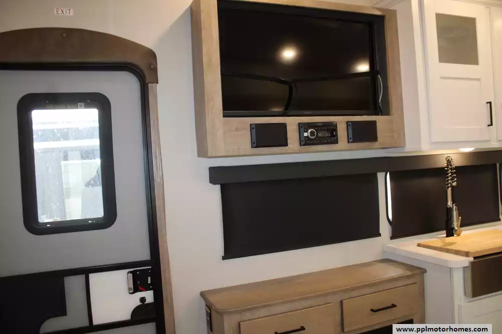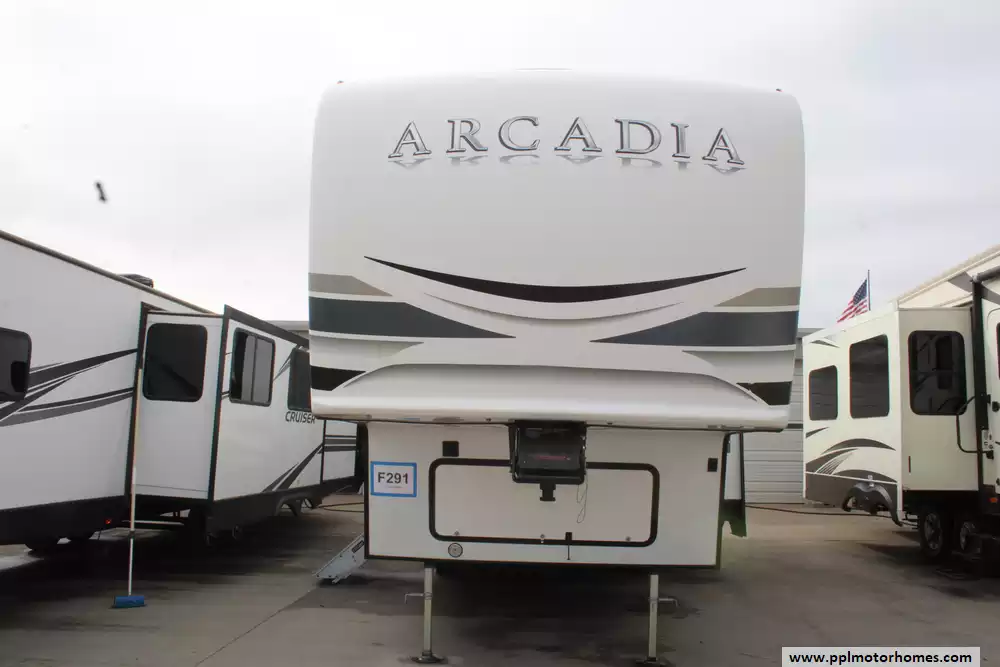 The 2022 Keystone Arcadia 3370BH is a family-friendly bunkhouse fifth wheel that combines practical towing weight for half-ton trucks with spacious, comfortable living and camping amenities. Featuring a private front queen bedroom, a rear bunkroom with double-over-double bunks, and a large slide-out living area with theater seating and an HD TV with fireplace, it's designed to sleep six to eight people with style and comfort. The well-appointed kitchen and dinette provide residential conveniences inside, while the "Grill-N-Chill" outdoor kitchenette under a 17' LED-lit power awning lets you cook and entertain outside; construction includes Keystone's NGC2 chassis with auto-leveling, heated enclosed tanks, generous storage, and solar prep for extended trips.