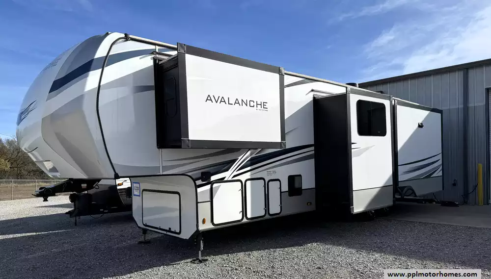 This 2022 Avalanche 372MB has a Hydraulic Landing Gear, 4 Slide-outs, 3 Ducted Air Conditioners, Ge Refrigerator, In-Fridge Ice Maker, Automatic Main Awning And Window/Door Awnings, Washer/Dryer Connections, Solar Panel, Outside Speakers, TV, DVD Player, Fireplace, Microwave, 3 Burner Range, Oven