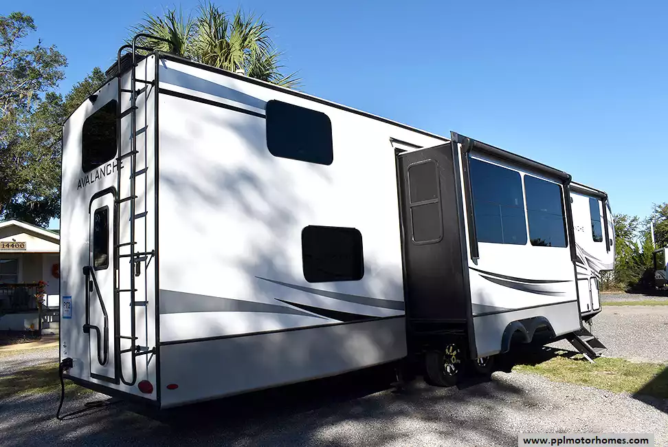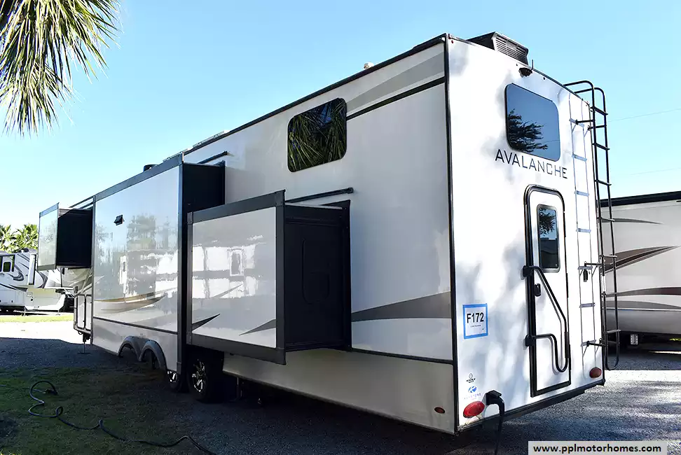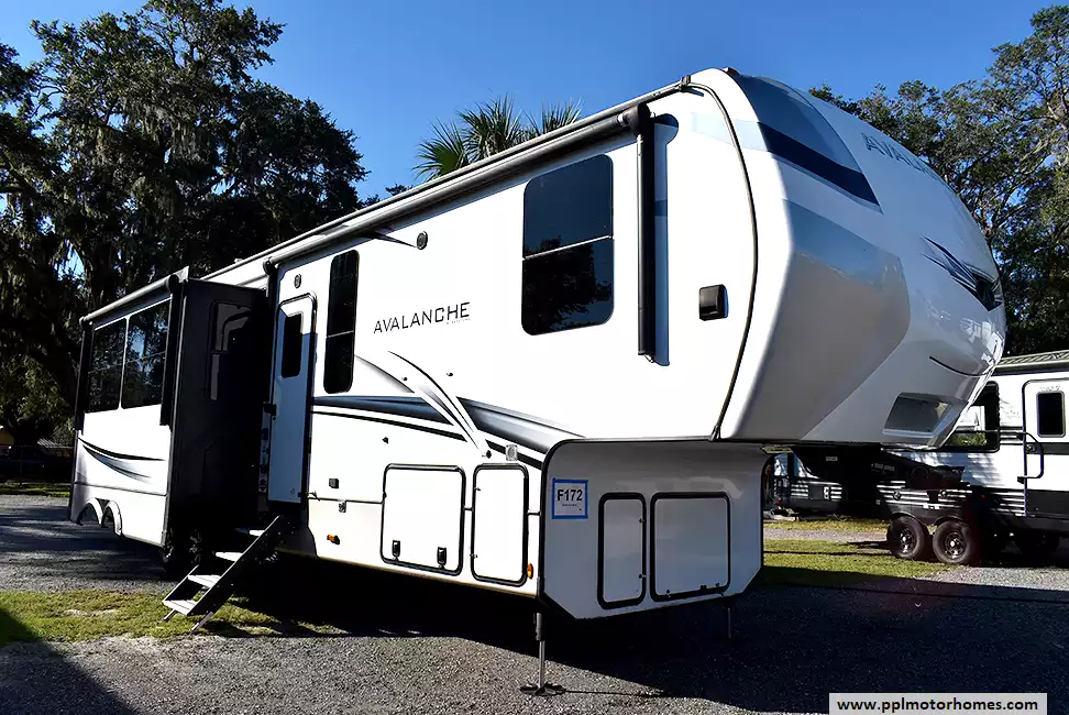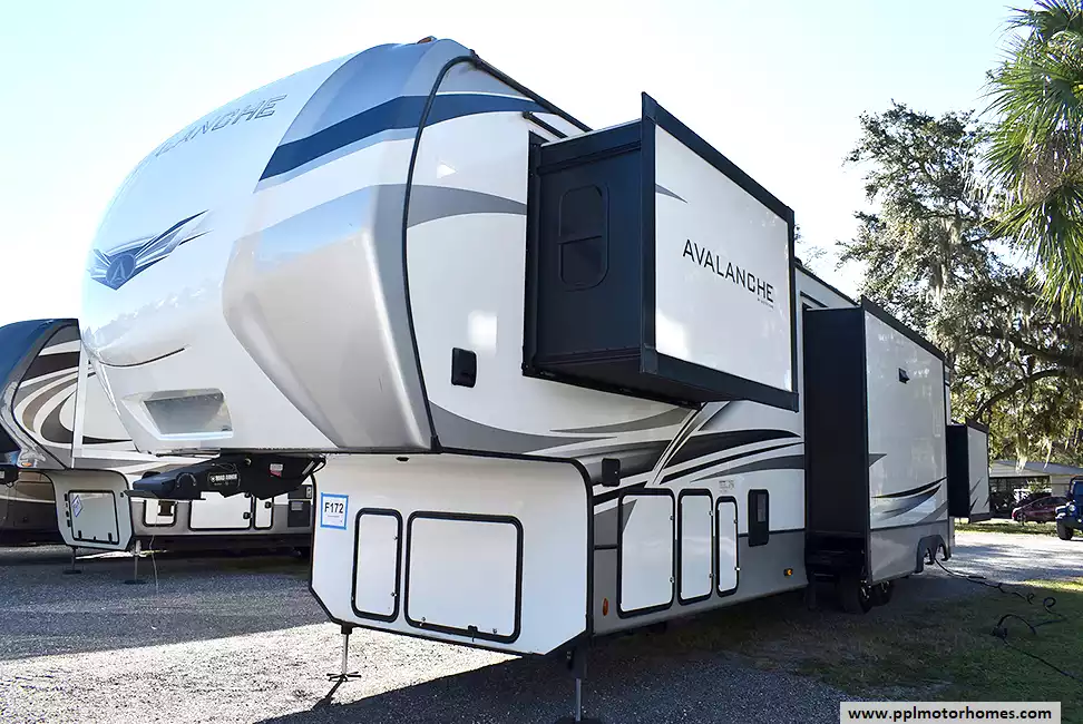 This 2022 Avalanche 390DS has a Hydraulic Landing Gear, 4 Slide-outs, 3 Ducted Air Conditioners, Residential Samsung Refrigerator, In-Fridge Ice Maker, Automatic Main Awning And Window Awning, Washer/Dryer, Solar Panel, Heated Tanks, Satellite Receiver, Outside Speakers, 3 TVs, DVD Player, Outside Shower, Fireplace, Microwave, 3 Burner Range, Oven