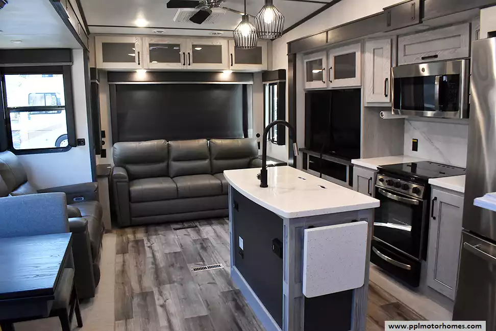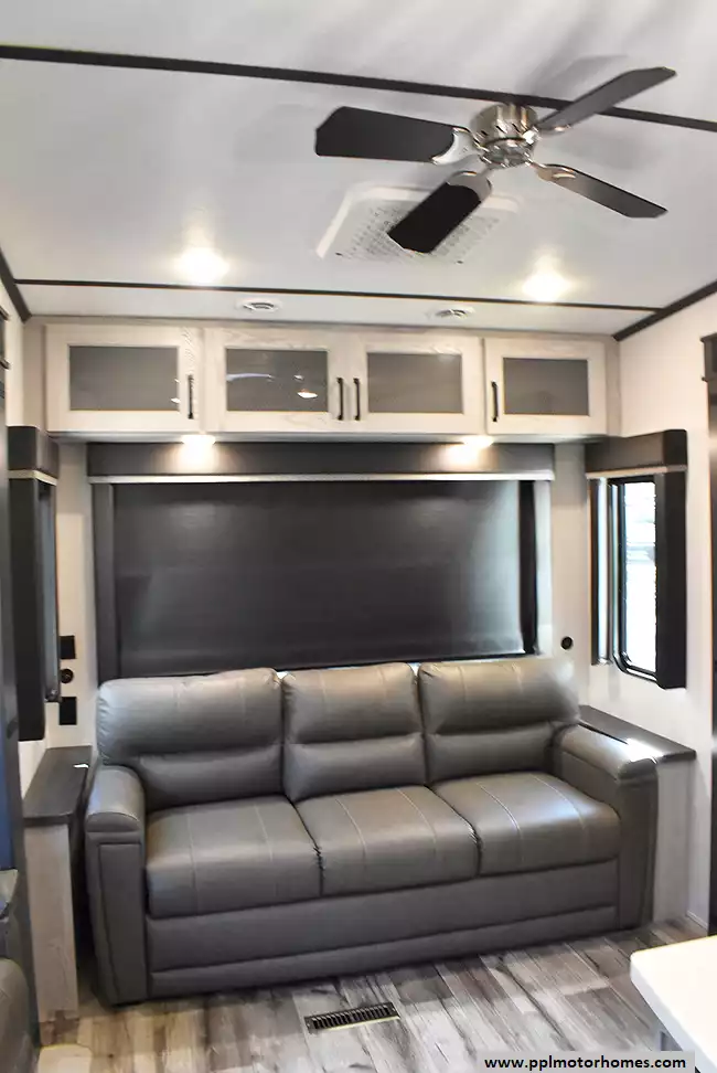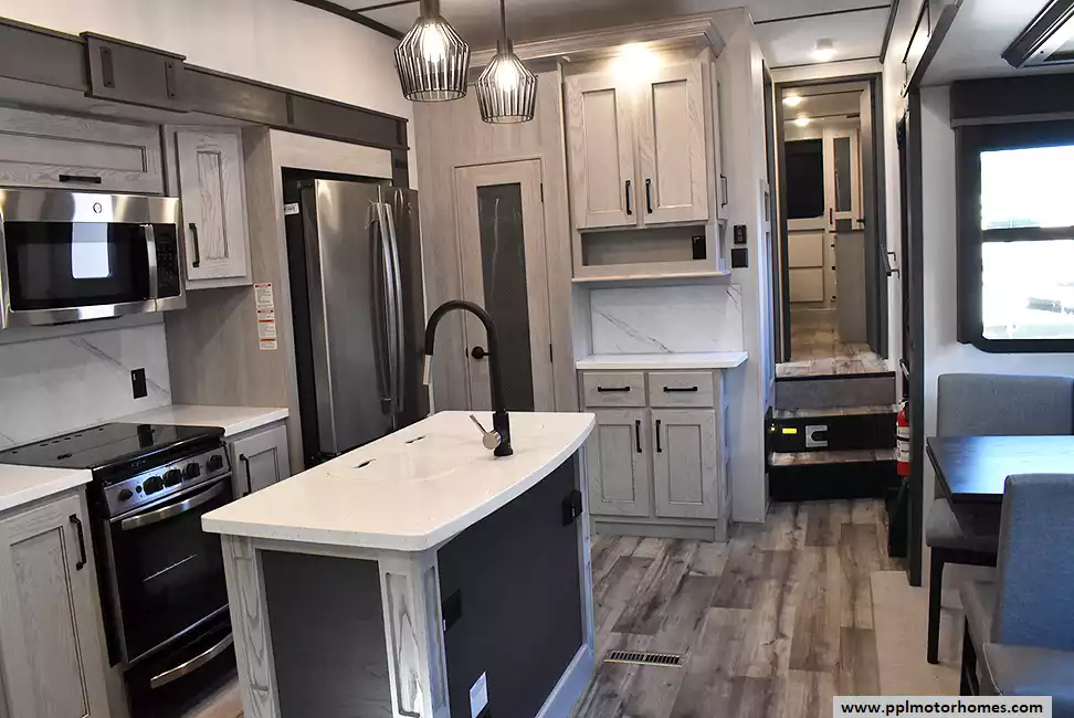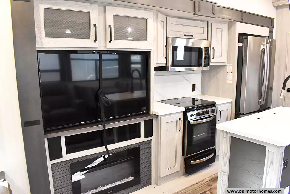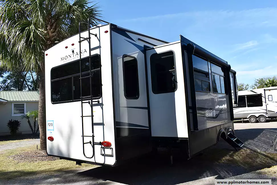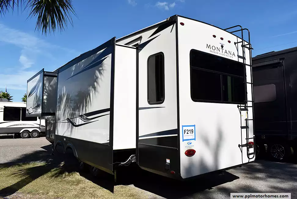 This 2022 Montana High Country 295RL has an Electric Landing Gear, 3 Slide-outs, 2 Ducted Air Conditioners, Residential Ge Refrigerator, Automatic Main Awning And Window Awning, Solar Panel, Heated Tanks, Satellite Receiver, Outside Speakers, TV, Outside Shower, Fireplace, Central Vacuum, Microwave, 3 Burner Range, Oven