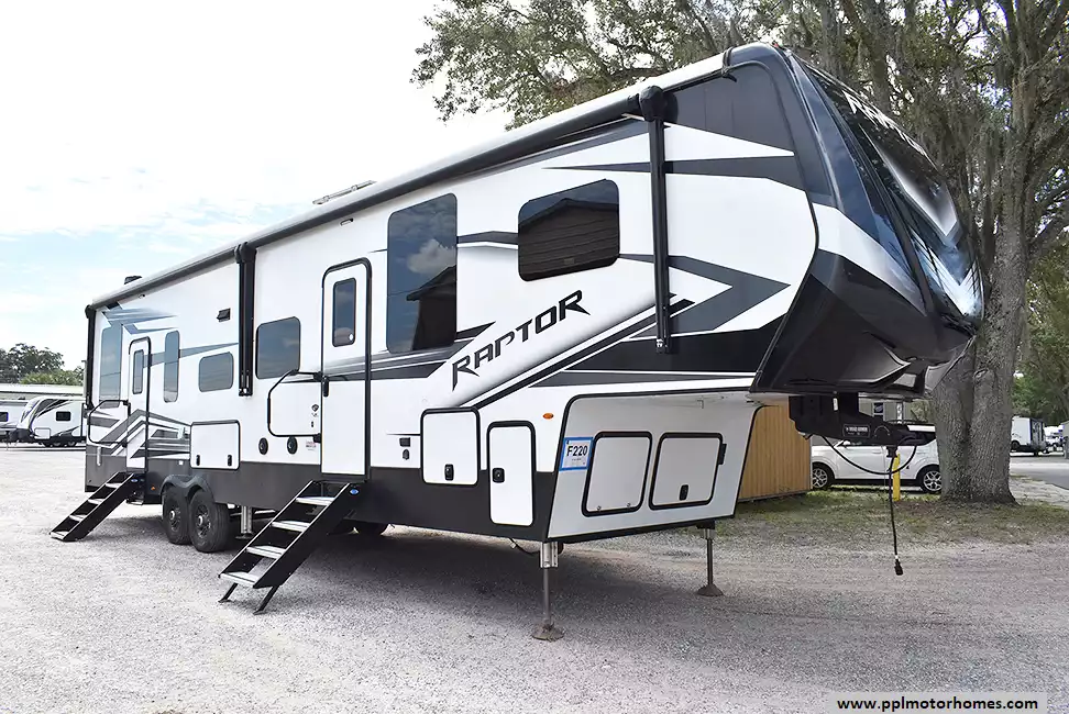 This 2022 Raptor by Keystone 362 has a Hydraulic Landing Gear, 2 Slide-outs, Onan Gas Generator, 3 Ducted Air Conditioners, 4 Door Refrigerator (Additional Refrigerator Present), Automatic Main Awning And Slide/Door Awnings, Washer/Dryer, Solar Panel, Satellite Receiver, Outside Entertainment System, 3 TVs, Outside Shower, Central Vacuum, Convection Microwave, 3 Burner Range, Oven