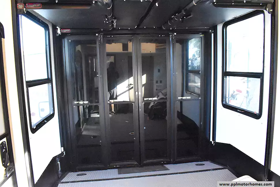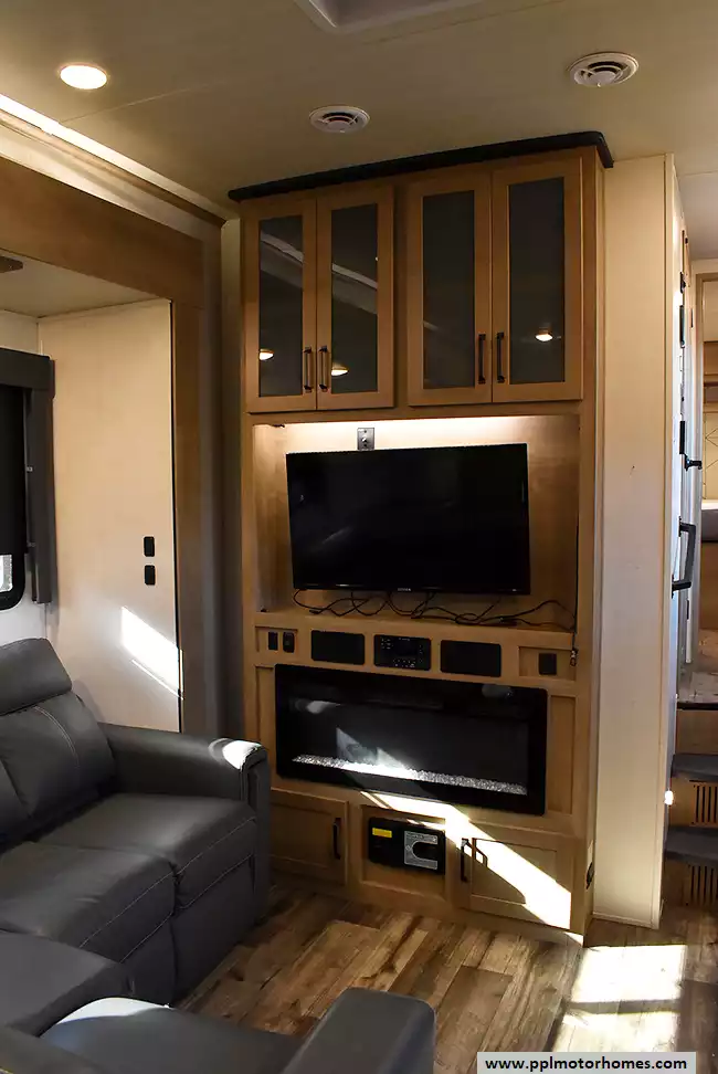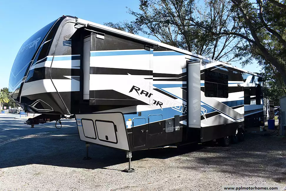 This 2022 Raptor by Keystone 413 has a Hydraulic Landing Gear, 3 Slide-outs, Onan Gas Generator, 3 Ducted Air Conditioners, 4 Door 110v Refrigerator, Automatic Main Awning And Slide Awning, Solar Panel, Heated Tanks, Satellite Receiver, Outside Speakers, 2 TVs, Outside Shower, Fireplace, Convection Microwave, 3 Burner Range, Oven
