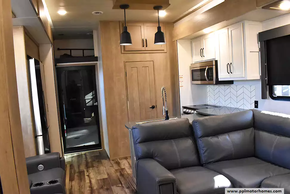 This 43'6" triple-slide Raptor is built for serious fun and comfort. It features full body paint, a 13' garage, fueling station, and onboard generator so you can stay off-grid longer. Inside, you'll find a spacious living area with a full kitchen, dual bathrooms, and sleeping for up to 7. Heavy-duty upgraded tires, insulated underbelly, and high-end finishes throughout make this fifth-wheel both rugged and refined. Ready to haul your toys and hit the open road!