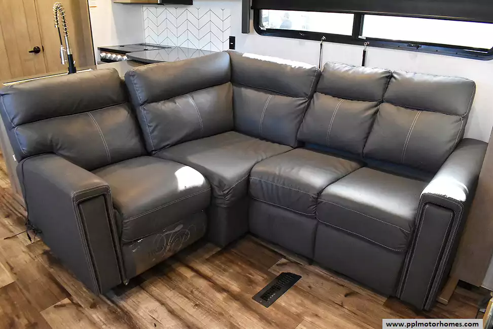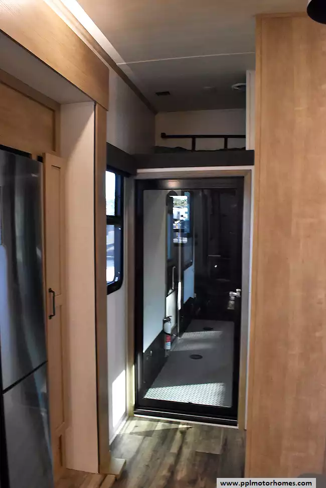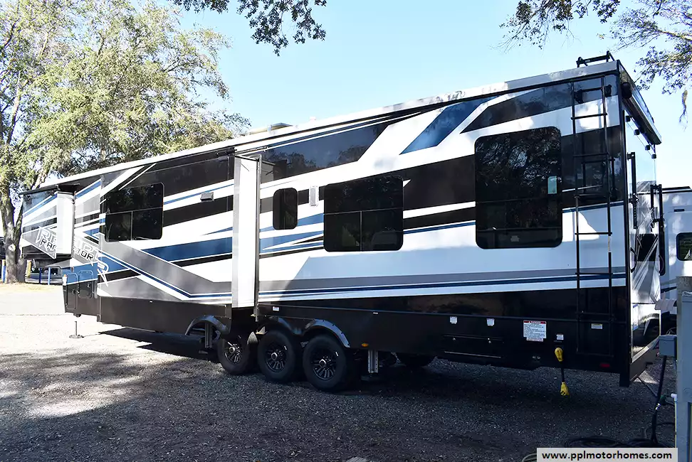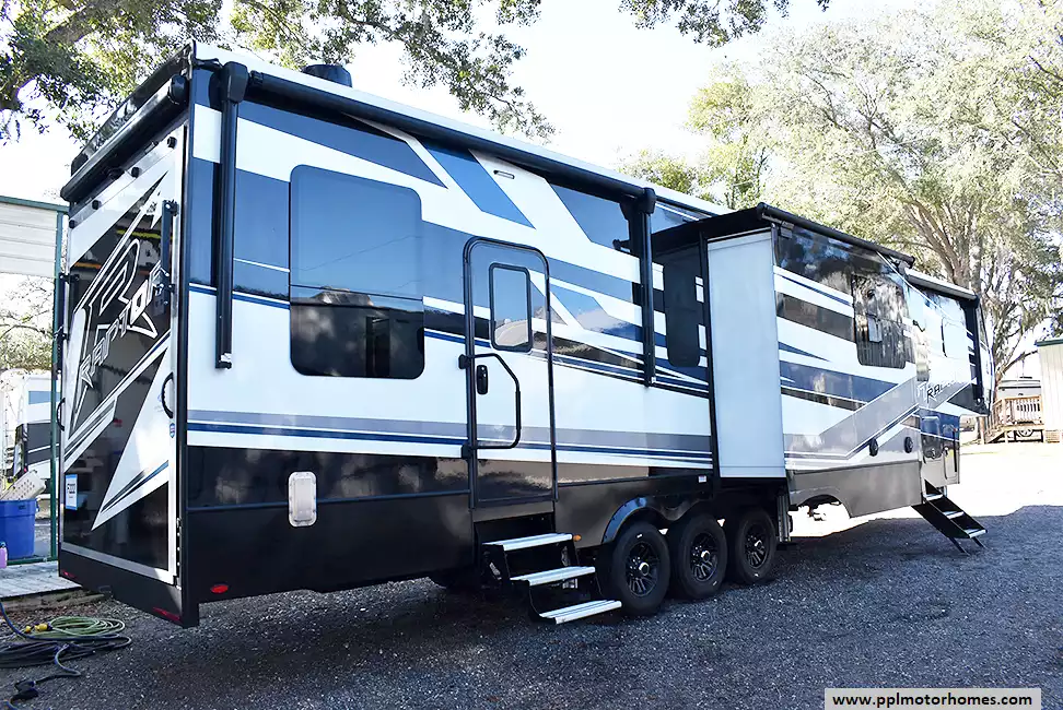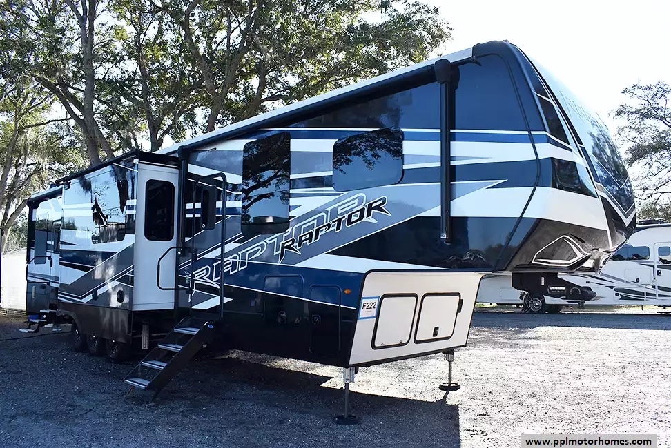 This 2022 Raptor by Keystone 413 has a Hydraulic Landing Gear, 3 Slide-outs, Onan Gas Generator, 3 Ducted Air Conditioners, 4 Door 110v Refrigerator, Automatic Main Awning And Slide Awning, Solar Panel, Heated Tanks, Satellite Receiver, Outside Speakers, 2 TVs, Outside Shower, Fireplace, Convection Microwave, 3 Burner Range, Oven