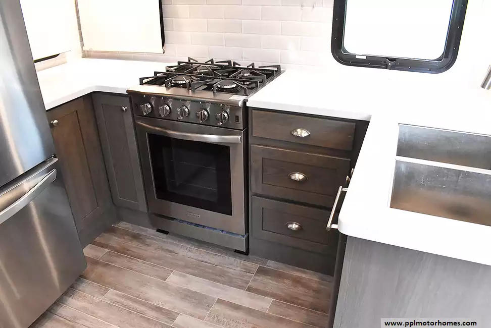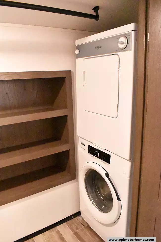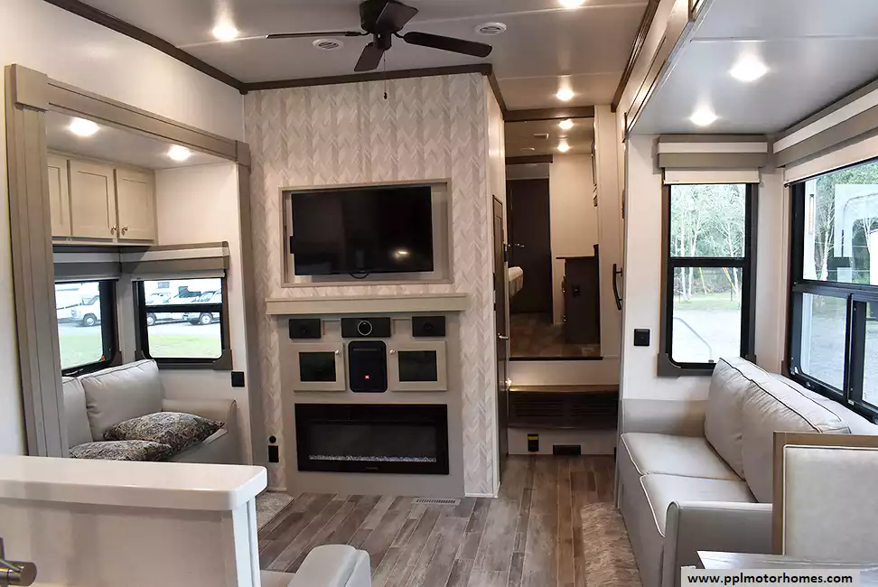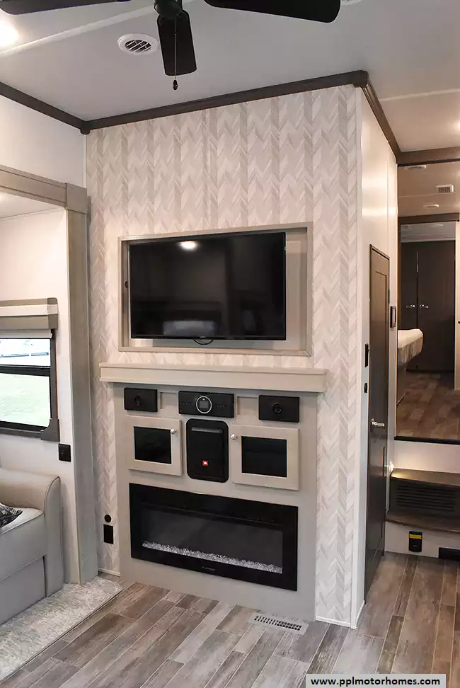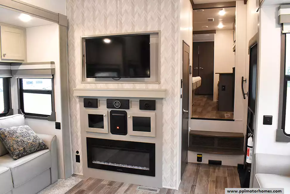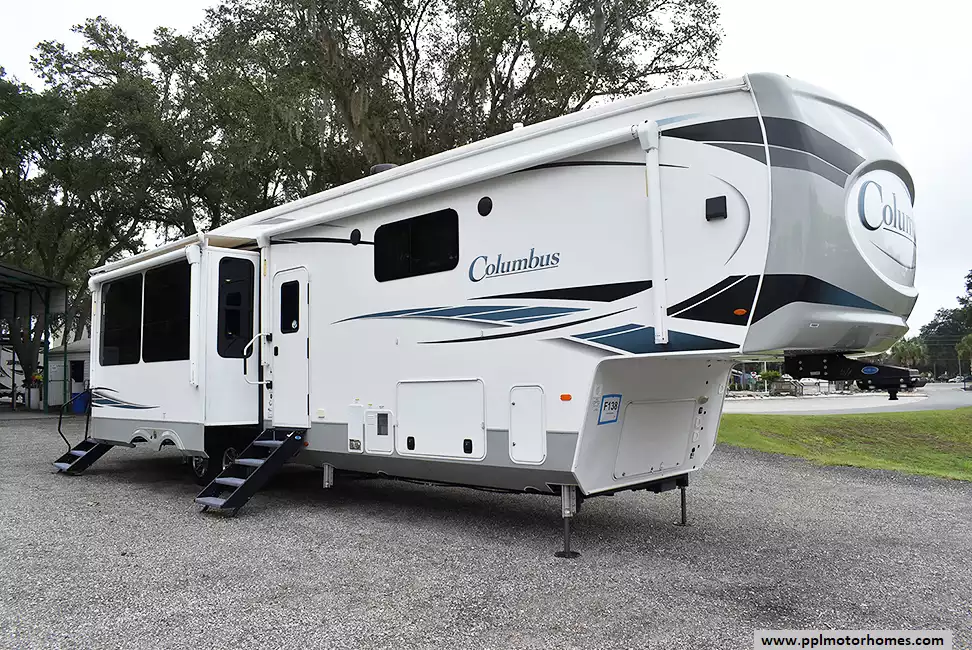 This 2022 Columbus 384RK has a Hydraulic Landing Gear, 2 Slide-outs, 2 Ducted Air Conditioners, Residential Lg Refrigerator, In-Fridge Ice Maker, Automatic Main Awning And Slide/Door Awnings, Washer/Dryer, Heated Tanks, Satellite Receiver, Outside Speakers, 2 TVs, Fireplace, Central Vacuum, Microwave, 4 Burner Range, Oven