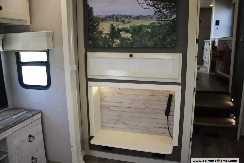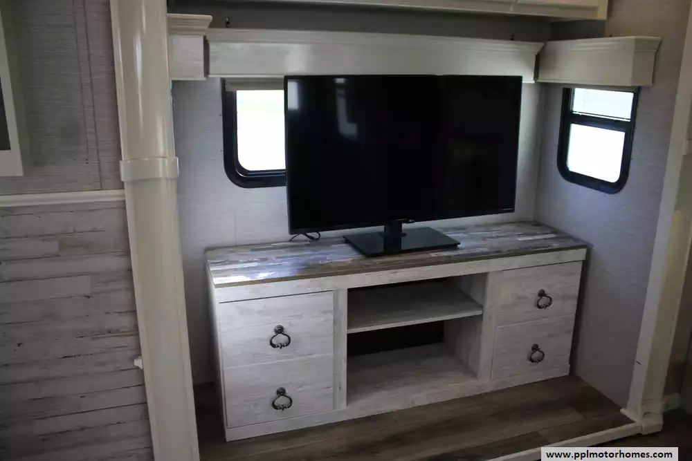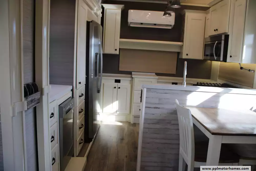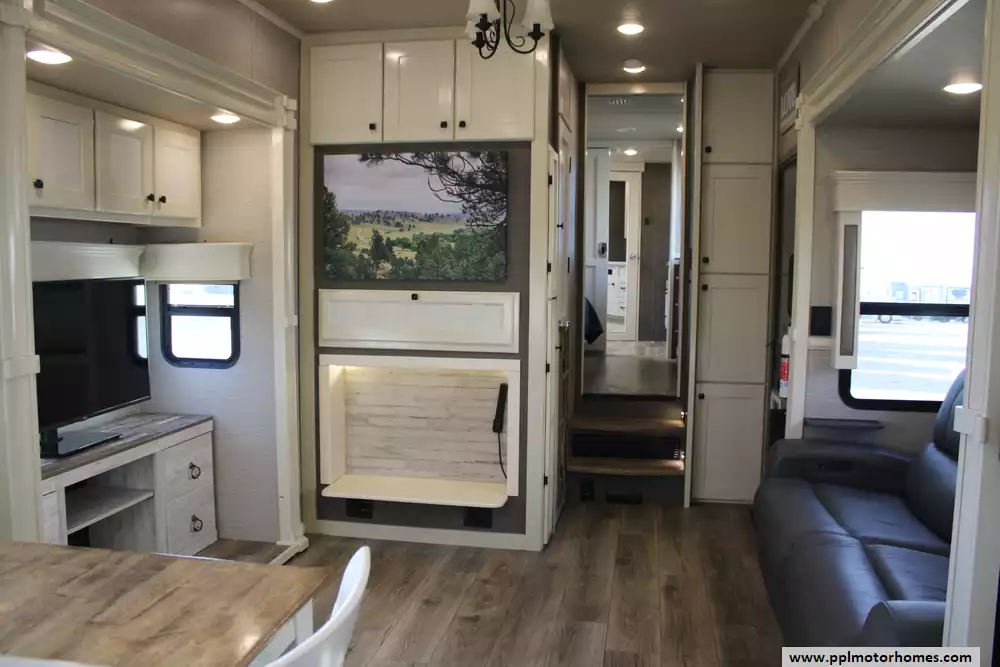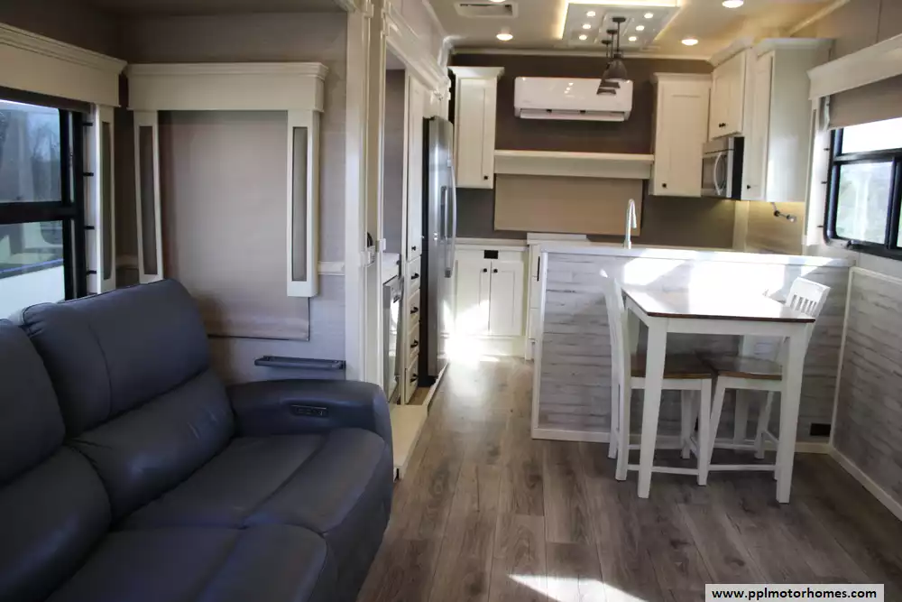 The Vanleigh Vilano 390LK is a luxury fifth-wheel RV built for extended travel and residential-style comfort. The 2022 Vilano 390LK measures about 42 feet 6 inches in length and features four slide-outs, creating a spacious interior that comfortably sleeps up to four people. This one has been modified and only sleeps 2. Its popular rear-kitchen floorplan offers generous counter space, solid-surface countertops, stainless-steel residential appliances, and a large pantry, while the central living area includes theater seating, a sofa sleeper, fireplace, entertainment center, and a built-in desk. Toward the front, the coach features a bath-and-a-half layout, a master suite with a king-size bed, large wardrobe, and washer/dryer prep. Built with aluminum framing, fiberglass sidewalls, and high-end residential finishes like hardwood cabinetry and LED lighting, this Vilano model also includes 3 roof air conditioners, an added Senville mini-split air conditioner, powerful furnace, and large holding tanks for comfortable long-term camping or full-time living. Please see pictures for modifications/customizations.