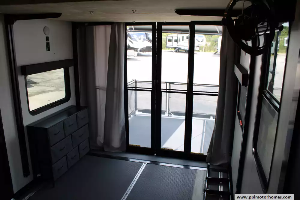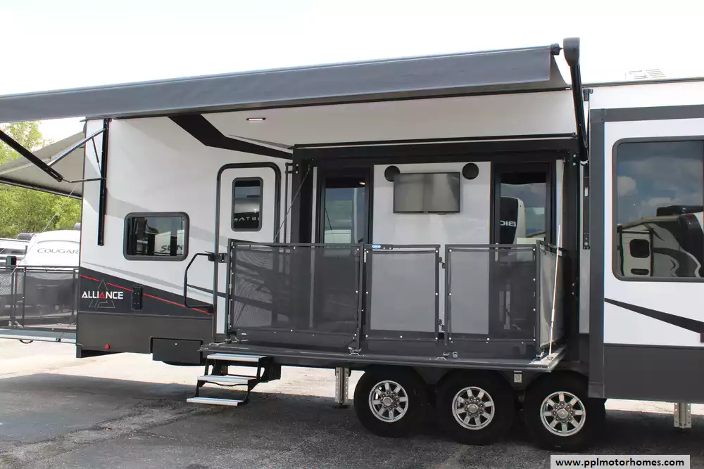 2023 Alliance RV Valor 42V13 is the ultimate luxury toy hauler designed for those who want it all--comfort, versatility, and serious off-grid capability. With a massive 13-foot garage, custom front bunkroom (with the option to reinstall the king bed), power drop-down queen bunk,and loft, this coach easily sleeps up to 7. You'll love the spacious living area featuring a center island kitchen, Samsung smart TV, cozy fireplace, and bath-and-a-half layout. This model features a hard to find side patio with railings which turns your campsite into a private outdoor lounge-perfect for relaxing or entertaining.