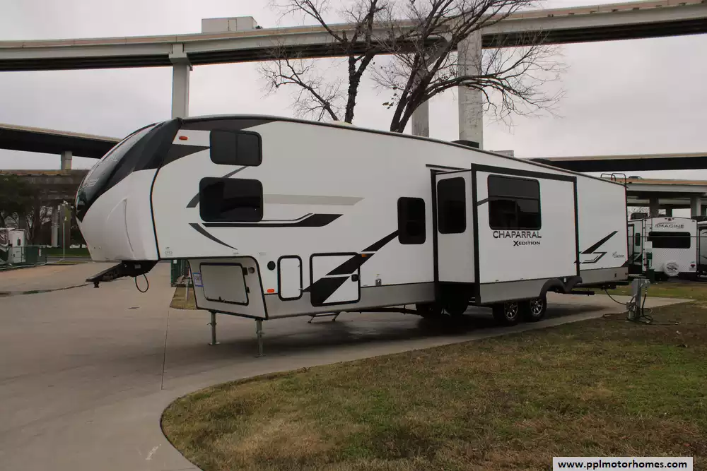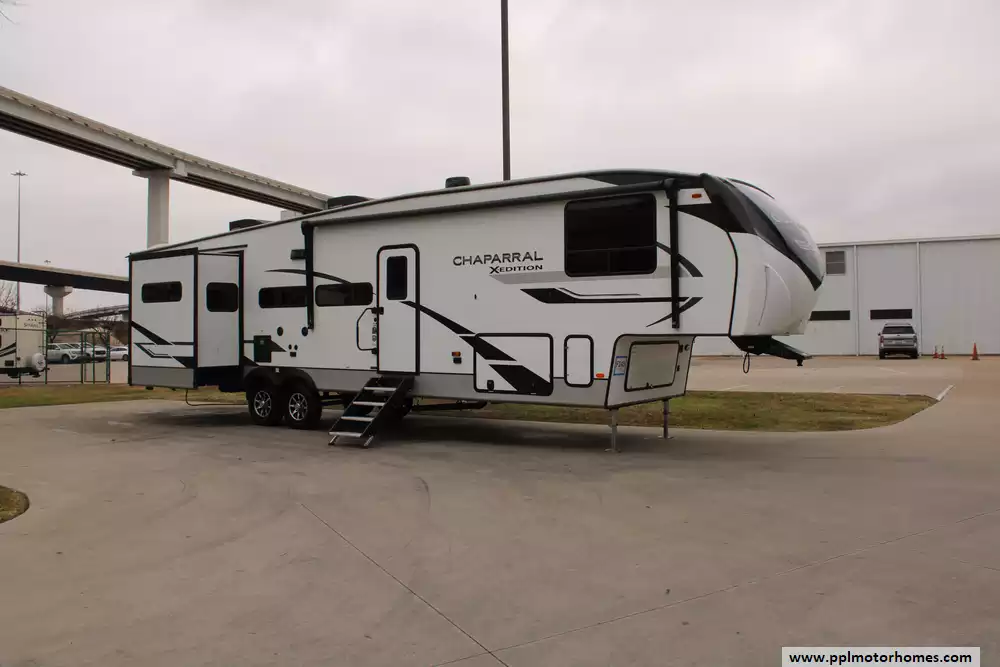 Two Full baths ! This 2023 Chaparral 355FBX epitomizes luxury and functionality, providing a lavish and comfortable living space for RV enthusiasts. With a length of 38 feet, this model offers a well-thought-out design that maximizes both interior and exterior features, making it an ideal choice for those seeking a premium RV experience..Amenities Include...Has an Electric Landing Gear, 2 Slide-outs, 2 Ducted Air Conditioners, 110v Everchill Refrigerator, Automatic Main Awning,Weather Shield,Solid Step, Washer/Dryer Connections, Outside Speakers, TV, Outside Shower, Fireplace, Microwave, 3 Burner Range,and Oven.This is a premium fifth wheel that combines luxury, functionality, and style. With its spacious and well-appointed interior, including a luxurious front bedroom, and thoughtful exterior features, this model is an excellent choice for RV enthusiasts looking for a top-tier camping experience.