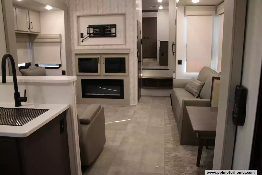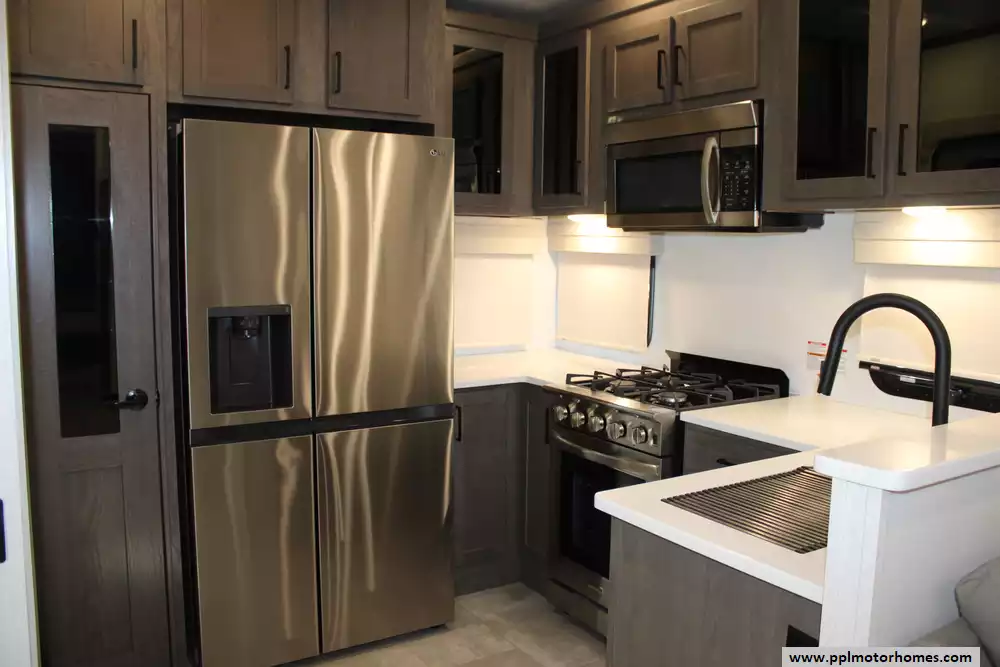 The 2023 Palomino Columbus 384RK is a premium 42-foot, three-slide 5th-wheel designed with a 101-inch wide body and a true residential feel, ideal for seasonal or full-time RV living. Its open rear-kitchen layout boasts a 20 cu ft residential refrigerator with ice maker, a four-burner cooktop with 24" residential oven, a deep-bowl stainless steel sink, and solid-surface countertops. The living area features opposing sleepers and power theater seating across from a 50" LED TV, while the front master suite includes a king bed and ample wardrobe space. Built for durability and comfort, the chassis includes an all-welded aluminum frame superstructure, "Azdel" vacuum-bonded walls, reinforced slides, a residential roof with R-40 insulation, ducted 30,000 BTU air conditioning and 35,000 BTU furnace. With generous tank capacities (75 gal fresh water, 78 gal grey, 71 gal black), dual 30-lb propane tanks, and a 16,600 lb GVWR, the 384RK is well-equipped for extended outings in comfort and style. This model also just had a brand-new roof installed. Enjoy this versatile camper whether you're wanting to get away for a while or just a weekend trip!