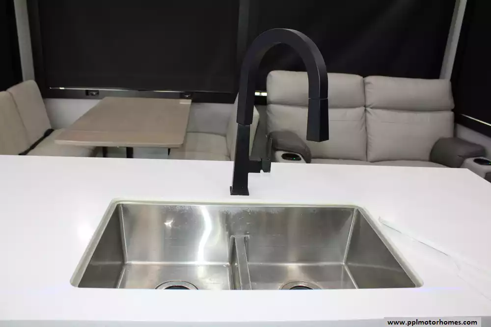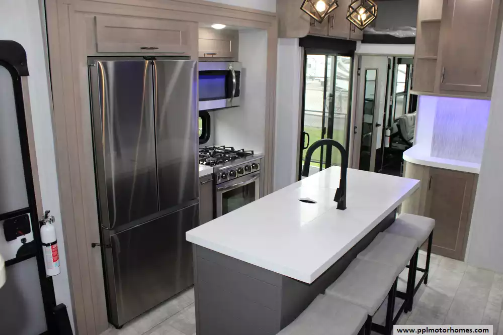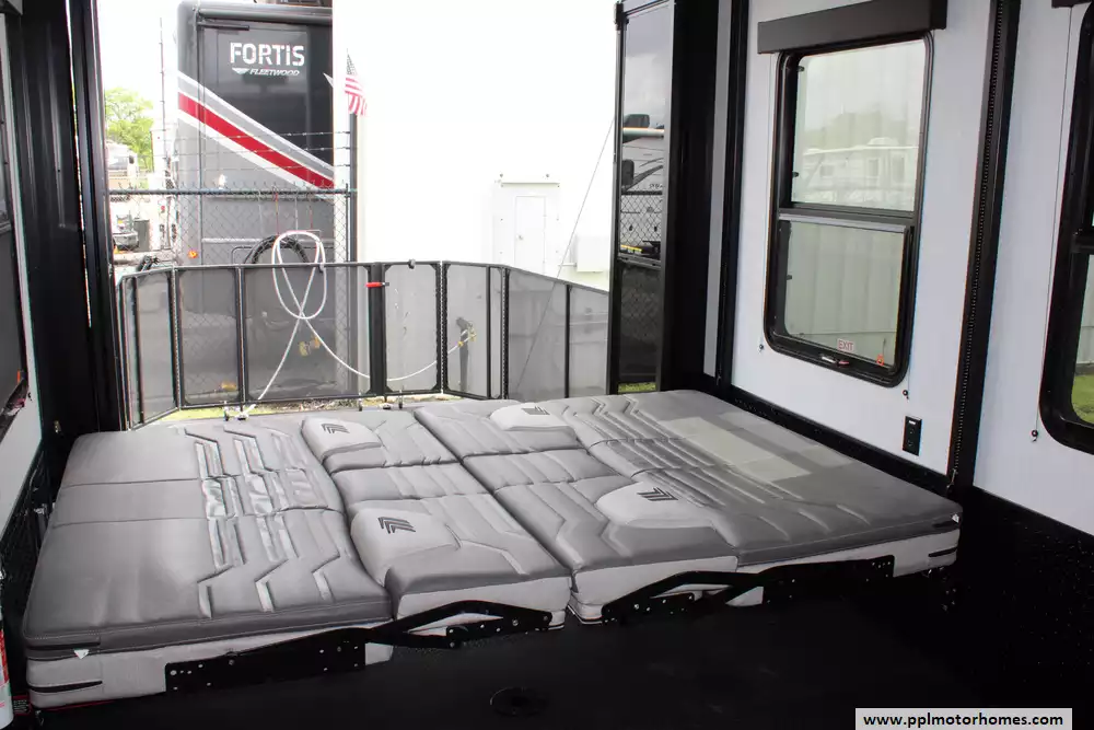 Specs: Length: 43.08 ft., Height: 13.42 ft., Payload Capacity: 4,100 lbs., Total Fresh Water Tank Capacity: 140 gal.,Total Gray Water Tank Capacity: 104 gal., Total Black Water Tank Capacity: 104 gal., Total Number of Propane Tanks: 2, Total Propane Tank Capacity: 60 lbs.