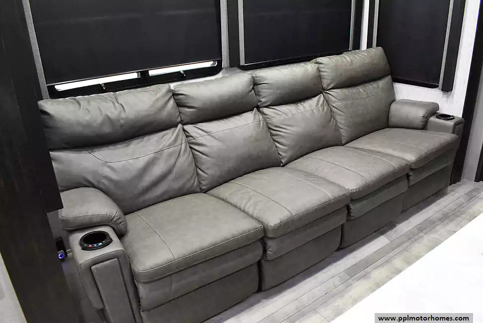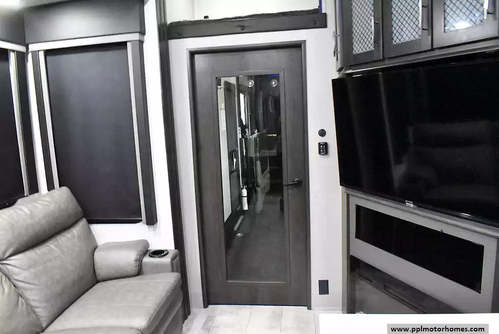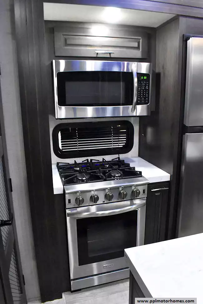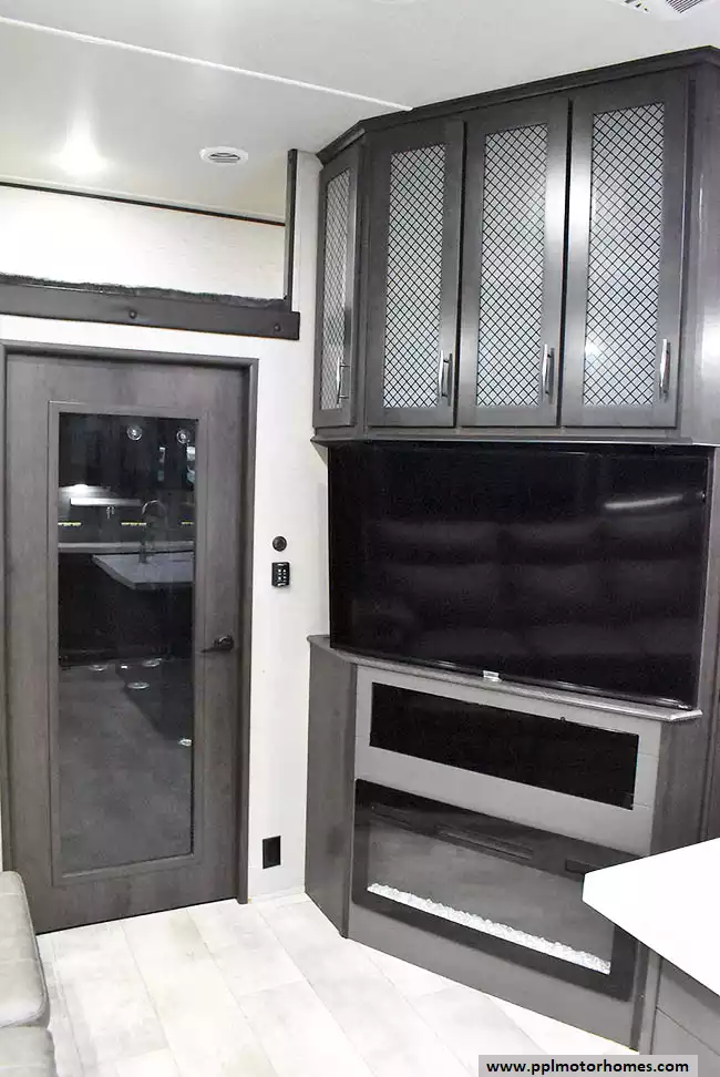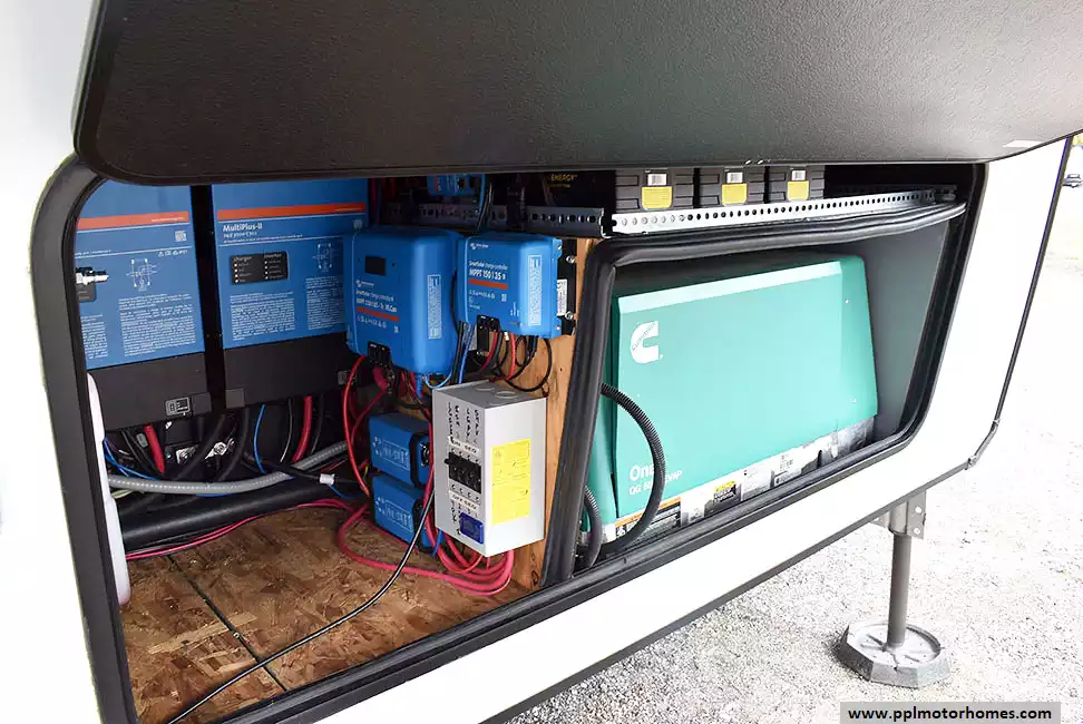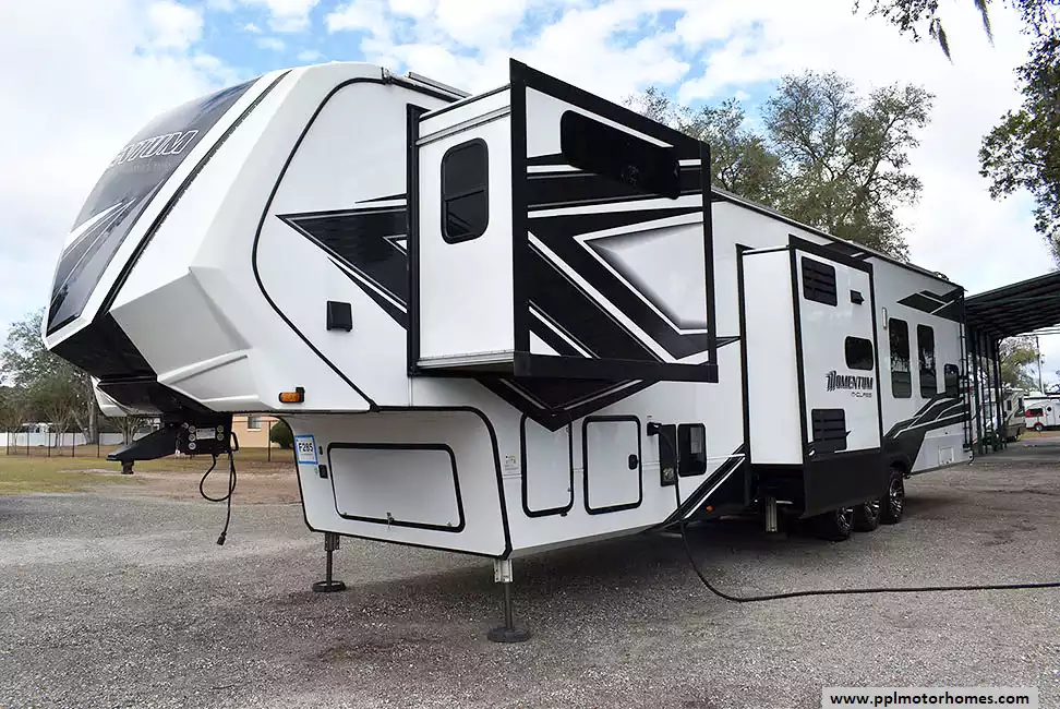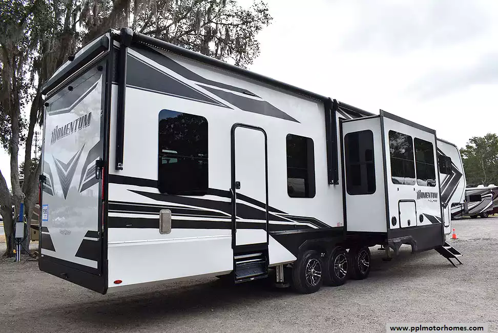 This 2023 Momentum M-Class 381MS has a 3 Slide-outs, Onan Gas Generator, 3 Ducted Air Conditioners, 4 Door Gas/12v Norcold Refrigerator, Automatic Main Awning And Slide Awning, Washer/Dryer Connections, Solar Panel, Satellite Receiver, Outside Speakers, 3 TVs, Outside Shower, Fireplace, Central Vacuum, Microwave, 4 Burner Range, Oven