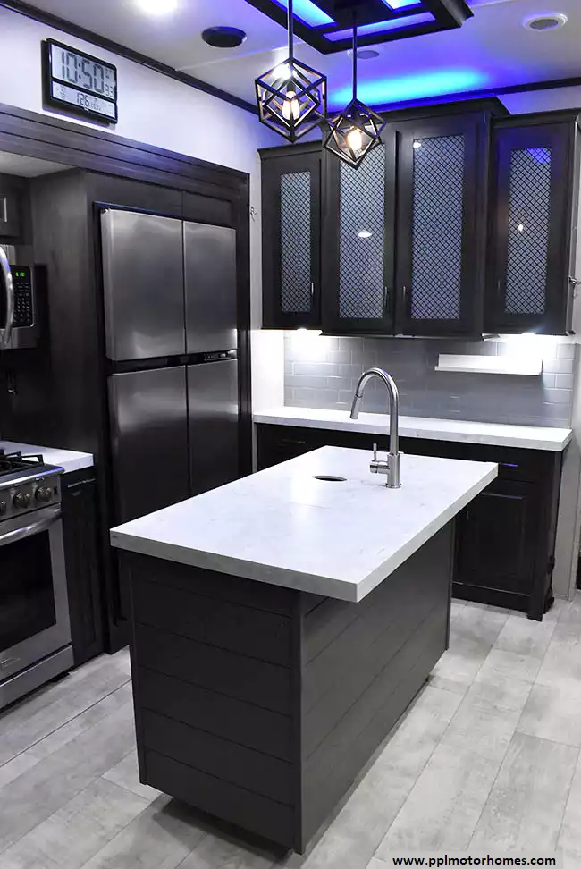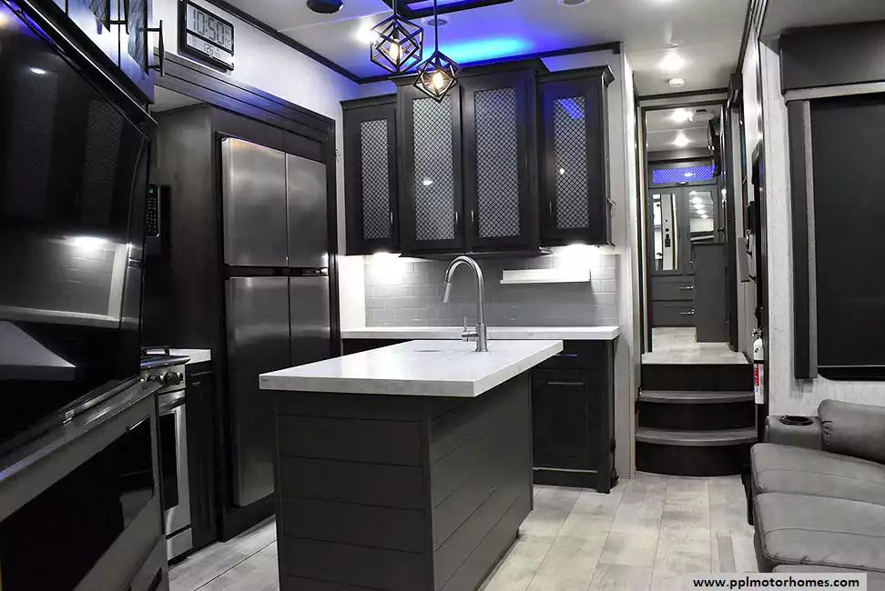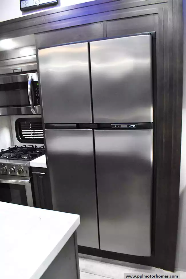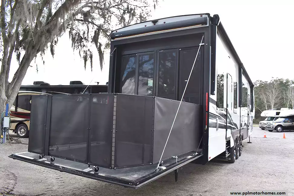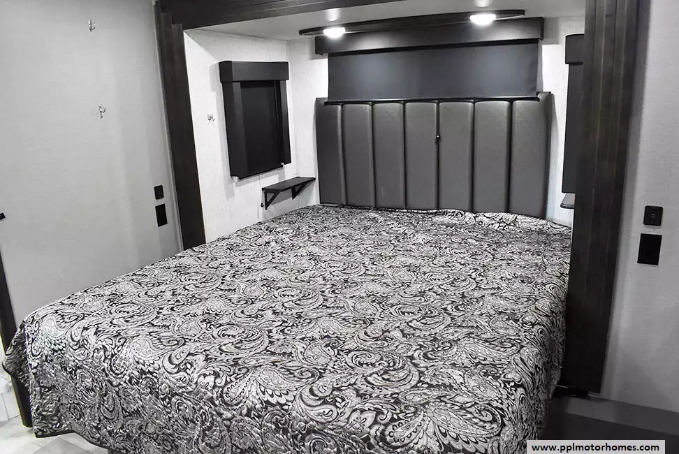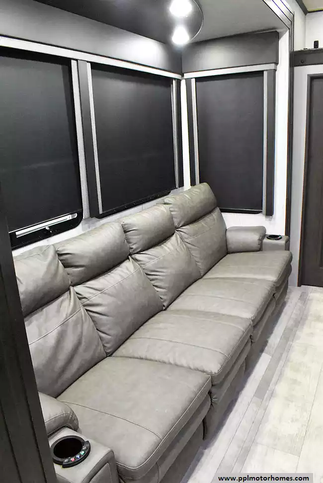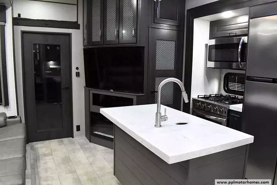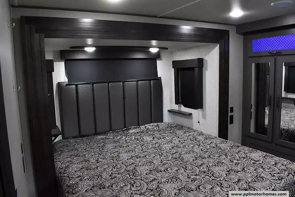 This 2023 Momentum M-Class 381MS has a 3 Slide-outs, Onan Gas Generator, 3 Ducted Air Conditioners, 4 Door Gas/12v Norcold Refrigerator, Automatic Main Awning And Slide Awning, Washer/Dryer Connections, Solar Panel, Satellite Receiver, Outside Speakers, 3 TVs, Outside Shower, Fireplace, Central Vacuum, Microwave, 4 Burner Range, Oven