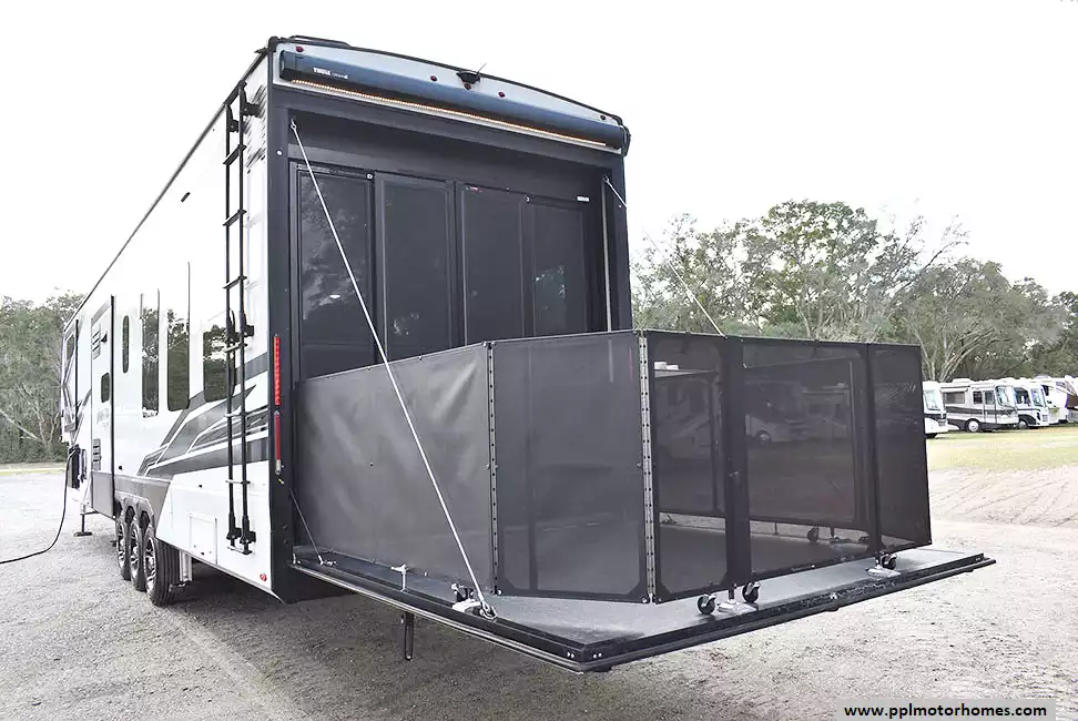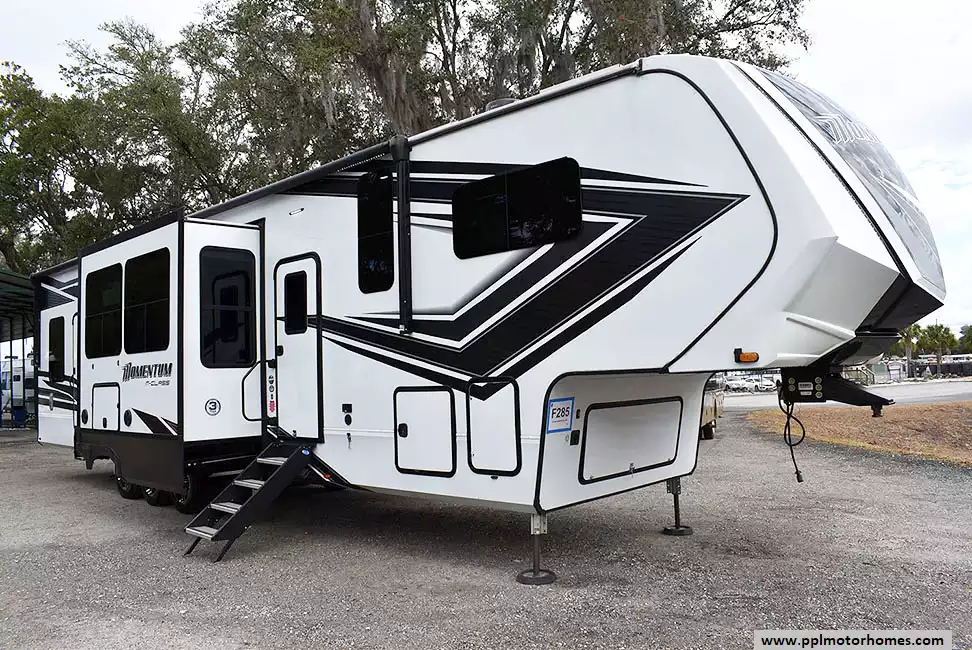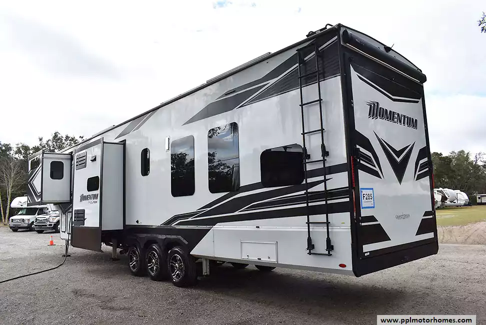 2023 Grand Design Momentum 381MS is a luxury fifth-wheel toy hauler that blends comfort and adventure. It features a spacious 15-foot garage, ideal for hauling ATVs, motorcycles, or extra gear. Inside, you'll find a modern kitchen with solid-surface countertops, a comfortable living area, and a private front master bedroom. The garage includes tie-downs and a power ramp door that can convert into a patio or additional living space. With multiple sleeping options, ample storage, and Grand Design's renowned build quality, the Momentum 381MS is an excellent choice for both weekend getaways and extended trips.