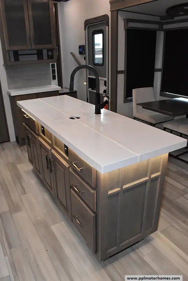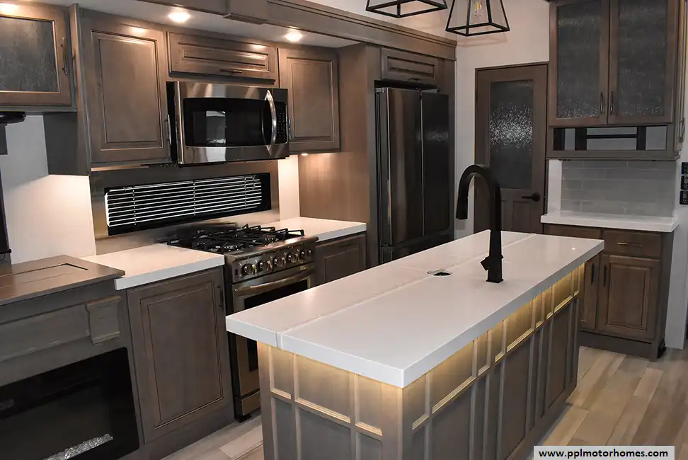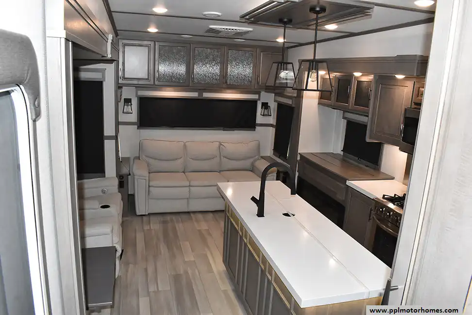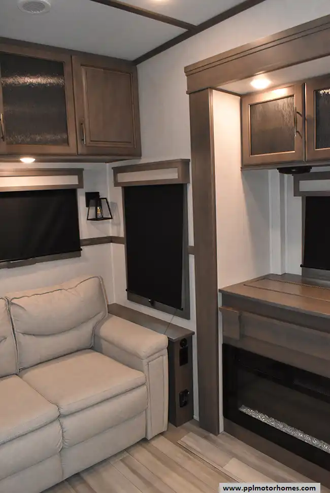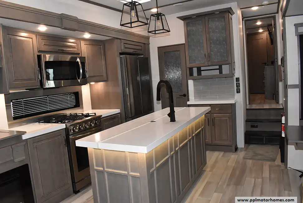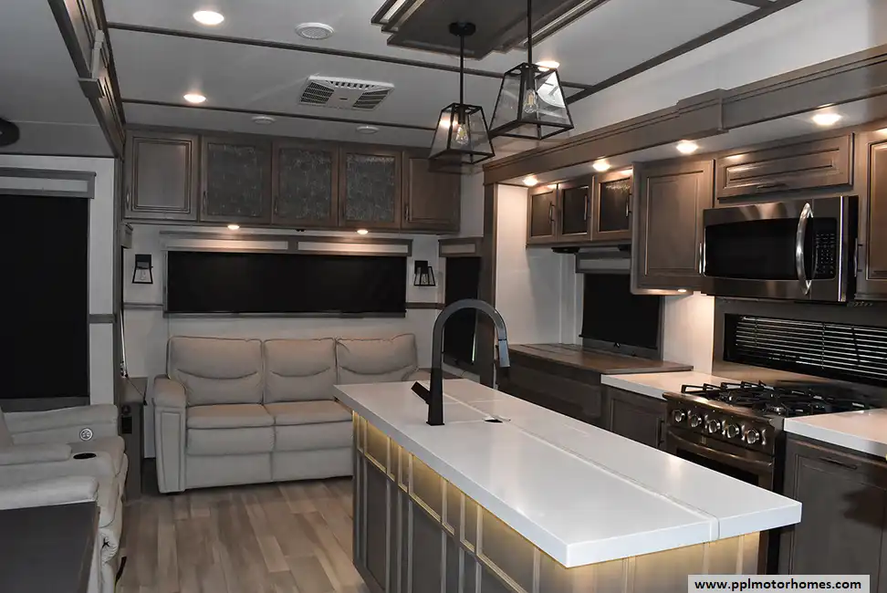 This 2023 Grand Design Solitude 310GK-R is a luxurious fifth-wheel RV designed for discerning travelers. With its spacious layout and high-end finishes, it offers a premium living experience on the road. The interior features a gourmet kitchen equipped with top-of-the-line appliances, a stylish living area with comfortable seating, and a cozy fireplace. The master bedroom boasts a king-sized bed and ample storage, while the bathroom offers modern fixtures and a spacious shower. With its residential feel and attention to detail, the Solitude 310GK is perfect for those seeking a luxurious retreat for extended stays or full-time living.