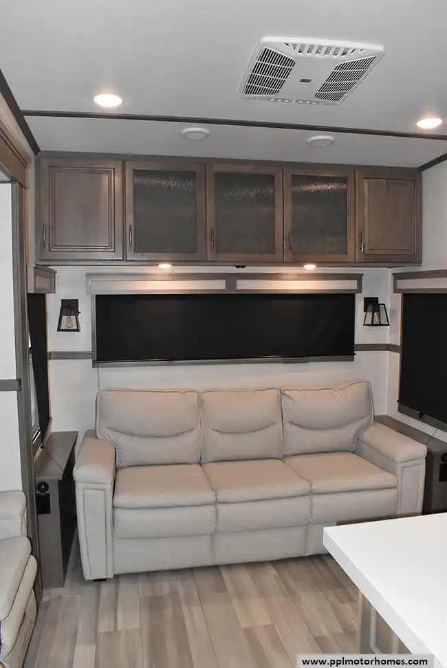 This unit comes with outside compartment with easy reel system, doubel recliner, couch, hide away TV, chair dining table, large island sink, central vacuum system, and ducted AC.