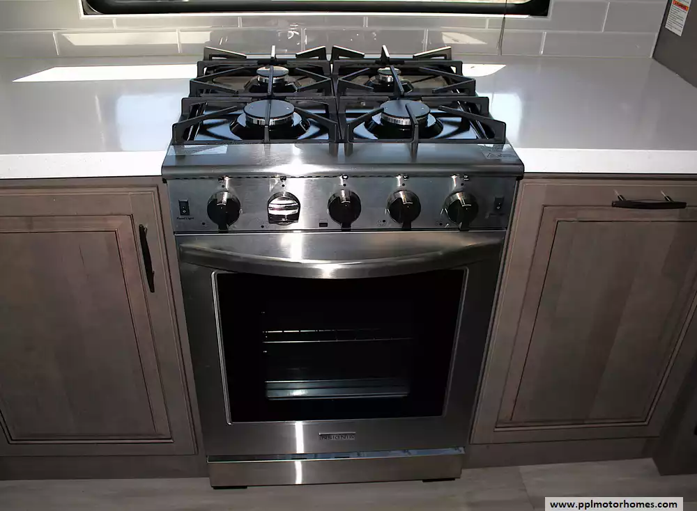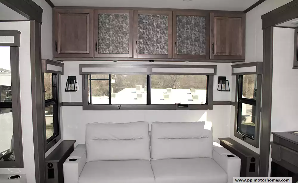 The kitchen is a true centerpiece, equipped with a large island, oversized pantry, hutch, solid surface countertops, and a professional-grade stainless steel cooktop paired with a built-in 24" residential oven and microwave. A massive 12V 20 cu. ft. refrigerator provides excellent storage for extended trips, while thoughtful touches like shoe storage under the steps, multiple cabinets, and a bath linen closet maximize organization. The front master suite offers a spacious wardrobe, washer/dryer prep, flip-top dresser with LED TV, and the upgraded king bed for residential comfort. In the bathroom, you'll find a large shower with skylight and flip-up seat, vanity with sink, and generous space to move comfortably - perfect for long stays or full-time living.