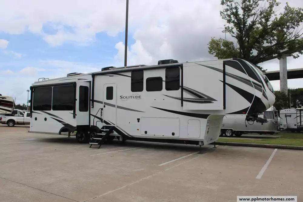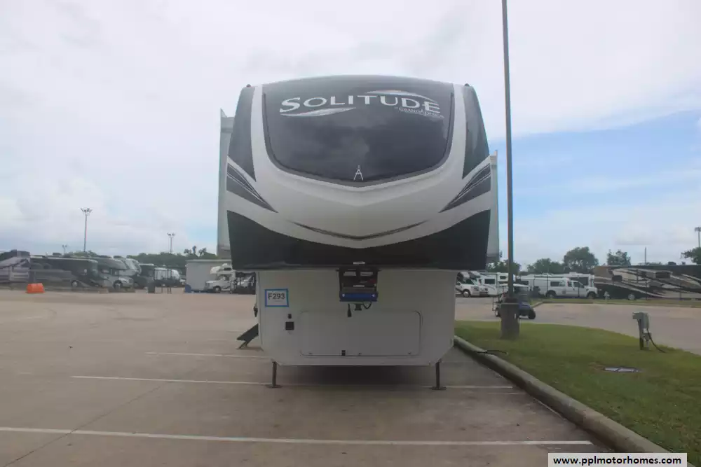 This 2023 Solitude 373FB is a premium, front-bath fifth-wheel featuring luxurious amenities, all-season readiness, and a residential-style floorplan ideal for couples or small families who want comfort and convenience. Amenities Include...4 Slide-outs, 3 Ducted Air Conditioners, Residential Samsung Refrigerator, In-Fridge Ice Maker, 2 Automatic Awnings, Washer/Dryer, Outside Speakers, TV, Outside Shower, Fireplace, Microwave, 4 Burner Range, and Oven.