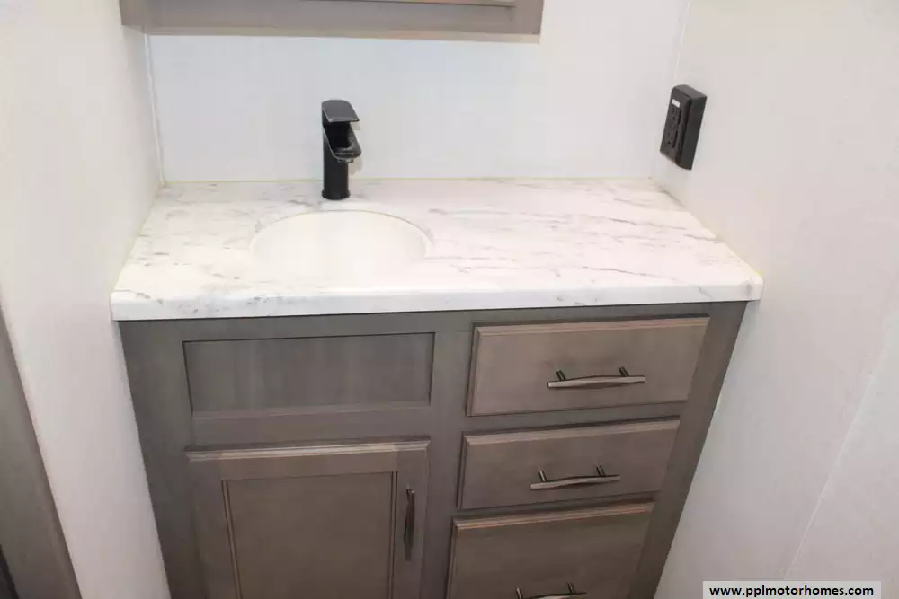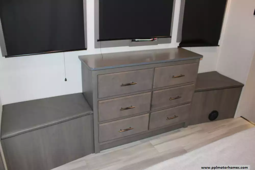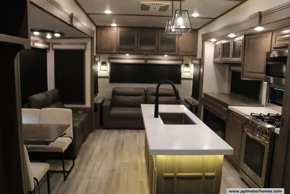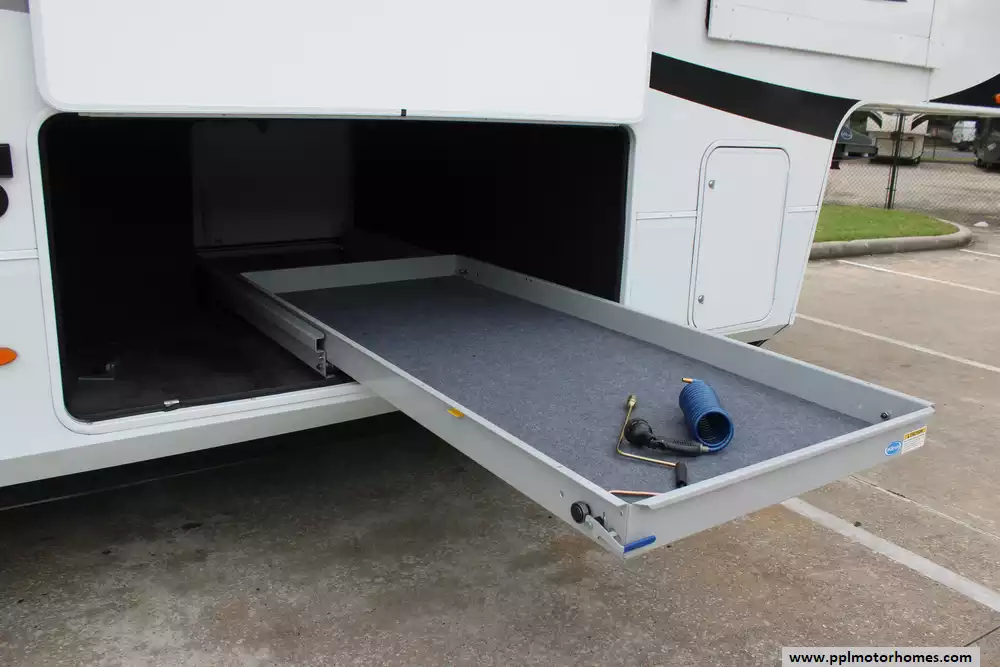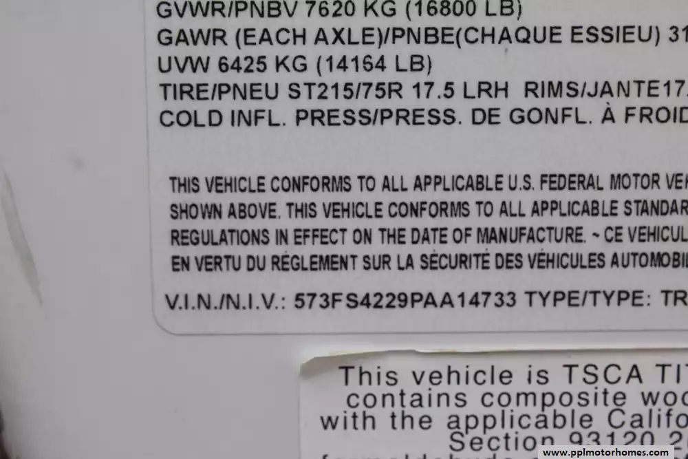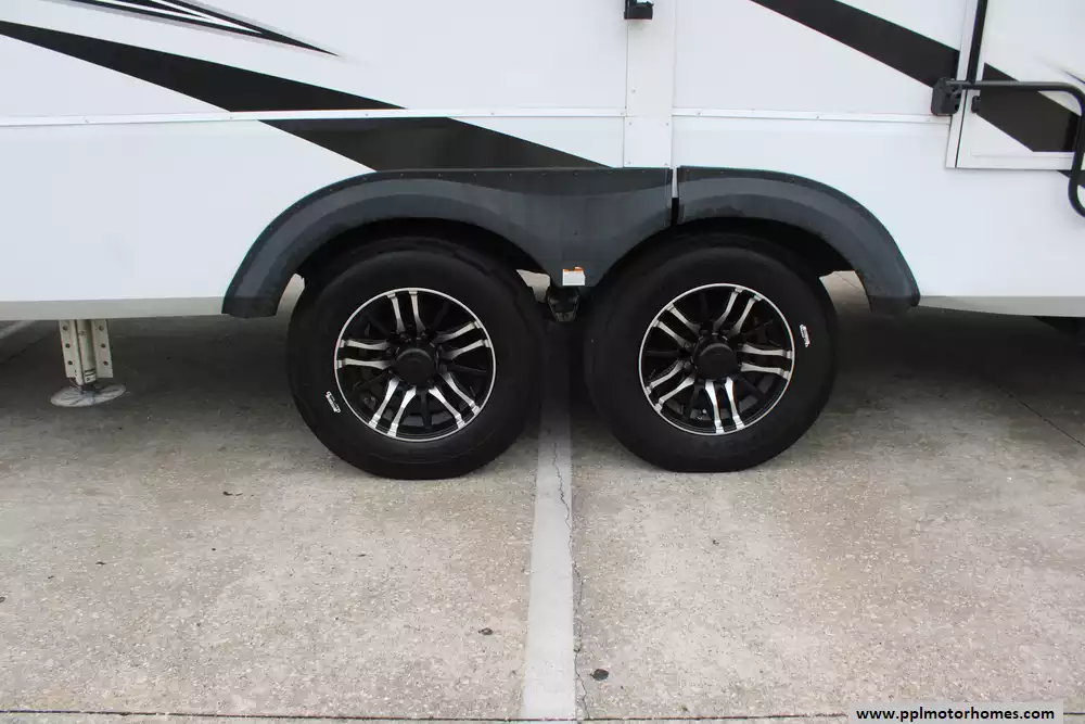 Specs: Length: 41.33ft., Width: 8.42 ft., Height: 13.42 ft., Payload Capacity: 2,850 lbs., Total Fresh Water Tank Capacity: 93 gal., Total Gray Water Tank Capacity: 106 gal., Total Black Water Tank Capacity: 106 gal., Total Number of Propane Tanks: 2, Total Propane Tank Capacity: 60 lbs.