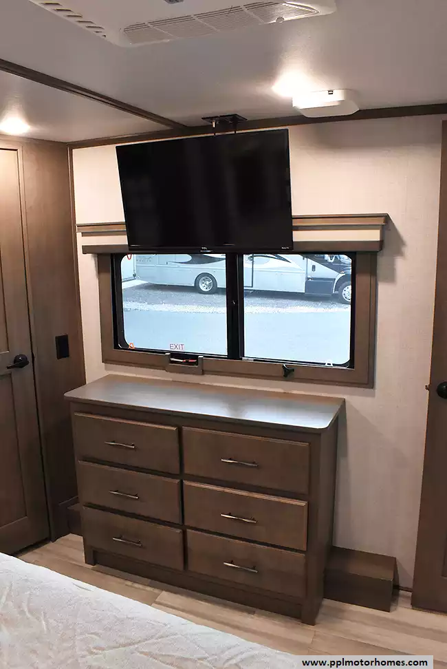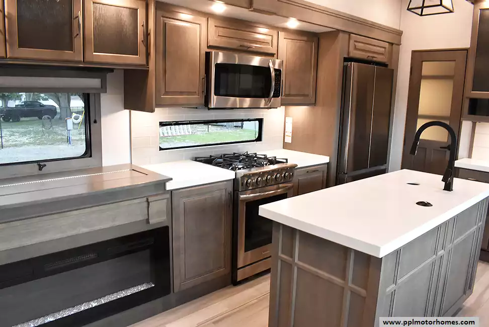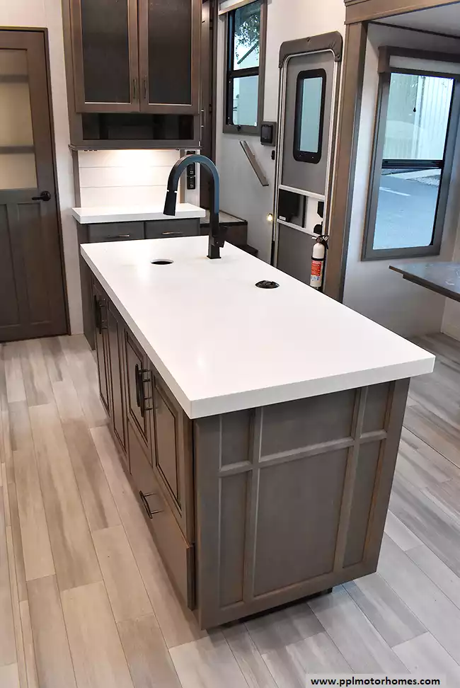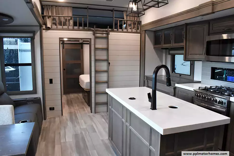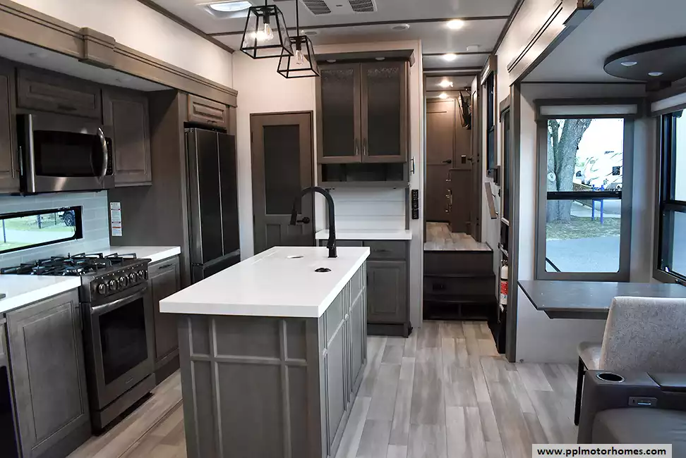 Elevate your travel lifestyle in this expansive fifth wheel boasting:Two Bedrooms & Two Bathrooms Private, residential-level comfort for you and your guests.Residential-Style Kitchen Enjoy a full-size stove, residential refrigerator, and generous pantry storage.