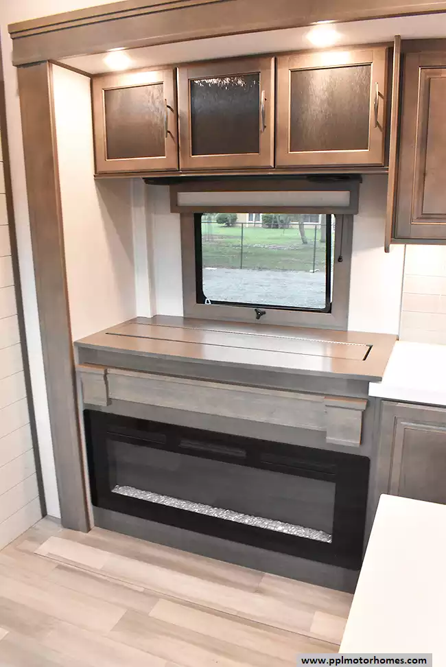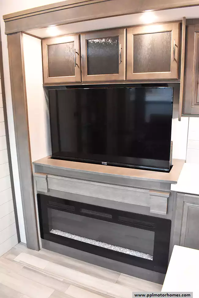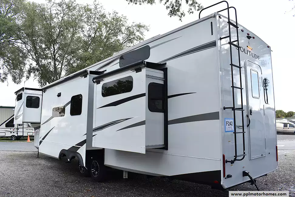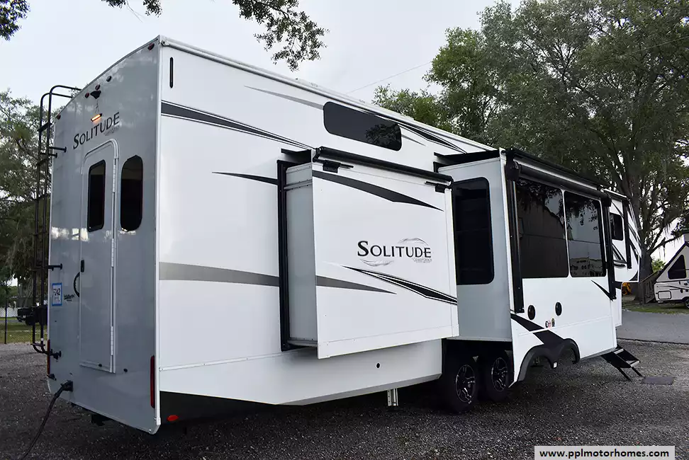 This 2023 Solitude 391DL has a Hydraulic Landing Gear, 5 Slide-outs, 3 Ducted Air Conditioners, Residential Samsung Refrigerator, Automatic Main Awning And Slide Awning, Washer/Dryer, Satellite Receiver, Outside Speakers, 3 TVs, Fireplace, Central Vacuum, Microwave, 4 Burner Range, Oven
