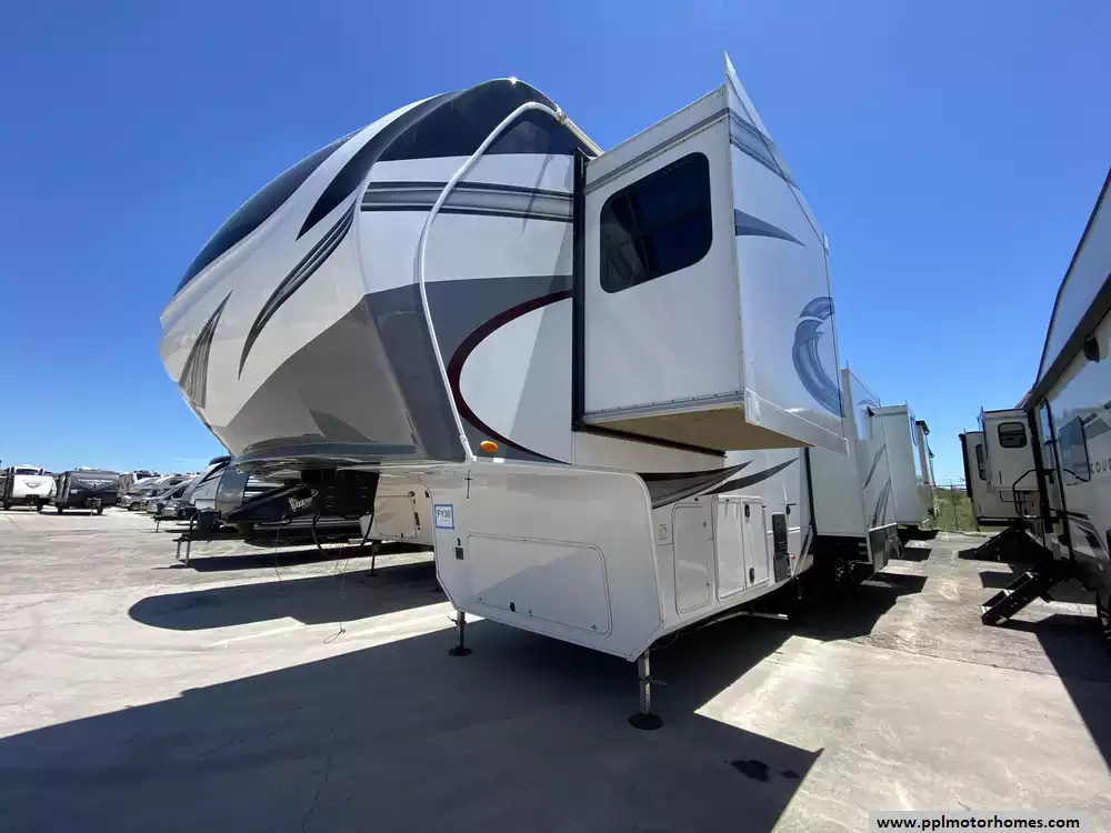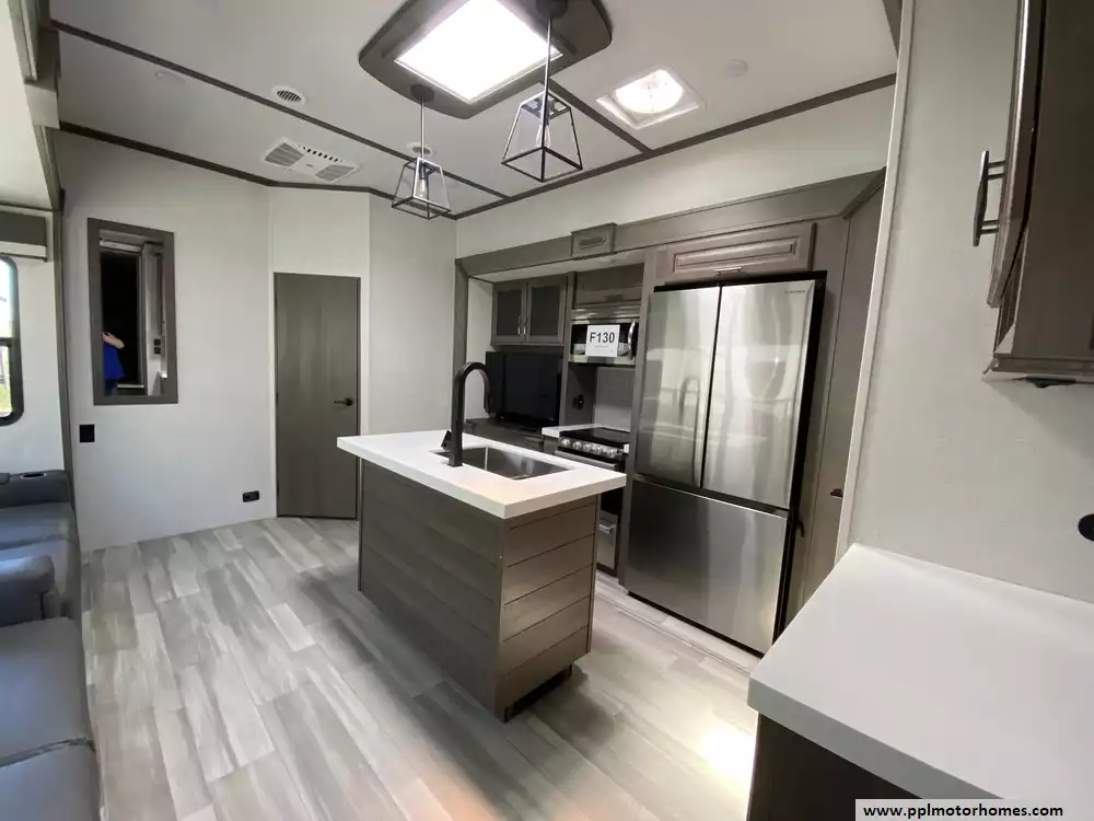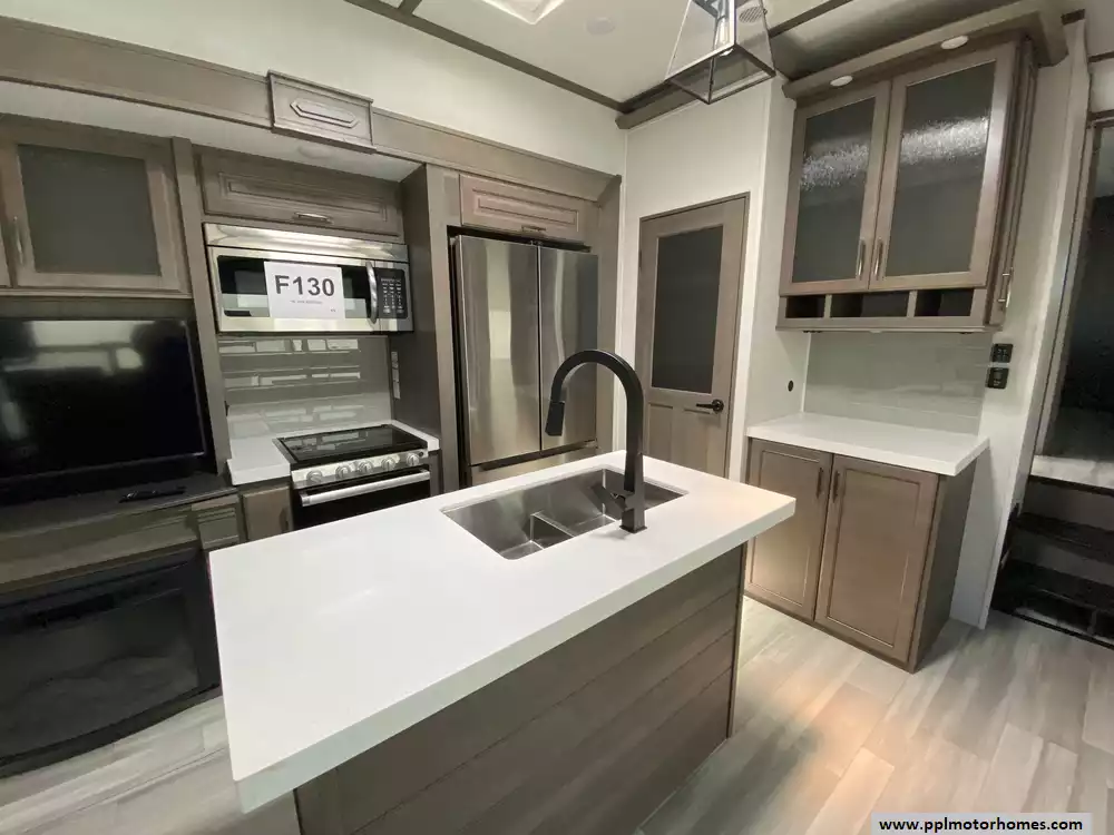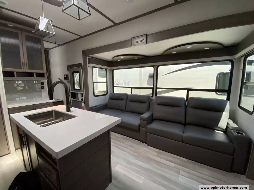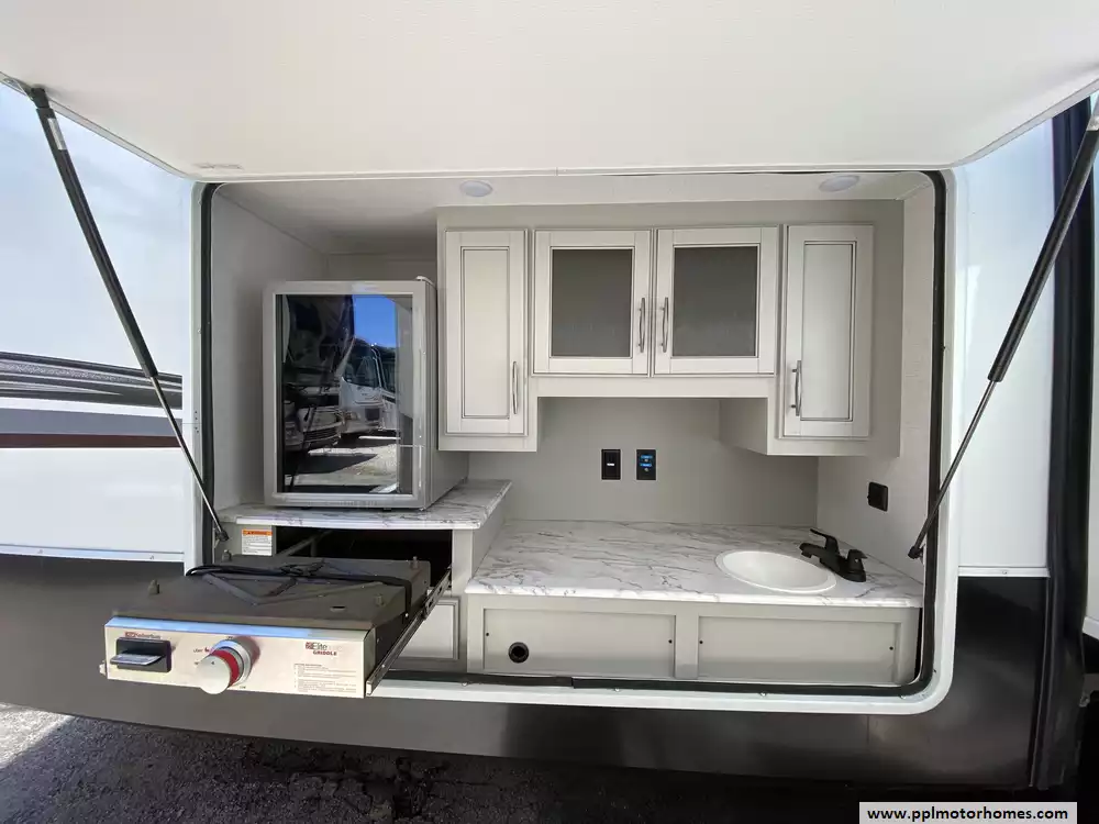 This 2023 Solitude 3950BHR has an Electric Landing Gear, 4 Slide-outs, Onan Propane Generator, 3 Ducted Air Conditioners, Double Door 110v Residential Samsung Refrigerator, In-Fridge Ice Maker, Automatic Main Awning And Window Awning, Washer/Dryer Connections, Heated Tanks, Outside Speakers, 3 TVs, Outdoor Grill, Outdoor Kitchen, Outside Shower, Fireplace, Convection Microwave, 3 Burner Range, Oven