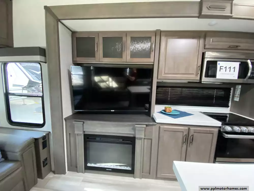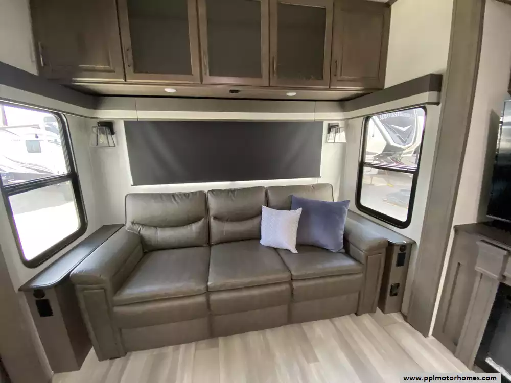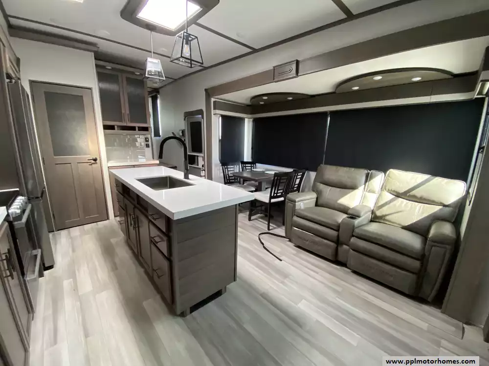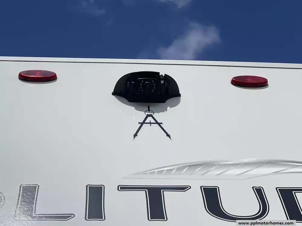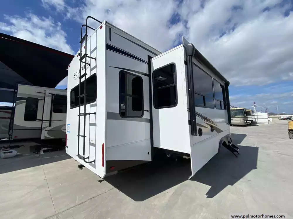 The gourmet-grade interior is anchored by a high-performance kitchen featuring a double-door 12V residential Samsung refrigerator with an integrated ice maker, a convection microwave, and a full three-burner range with an oven. Setting up camp is effortless thanks to the electric landing gear and the automatic main awning, which creates the perfect outdoor retreat complemented by exterior speakers and a convenient outside shower. With two televisions included for premium entertainment and a layout built for extended stays, this Solitude S-Class is expertly equipped to provide a professional, home-away-from-home experience on the open road.