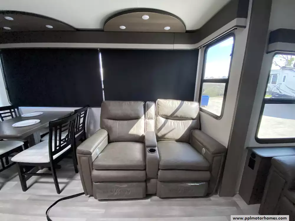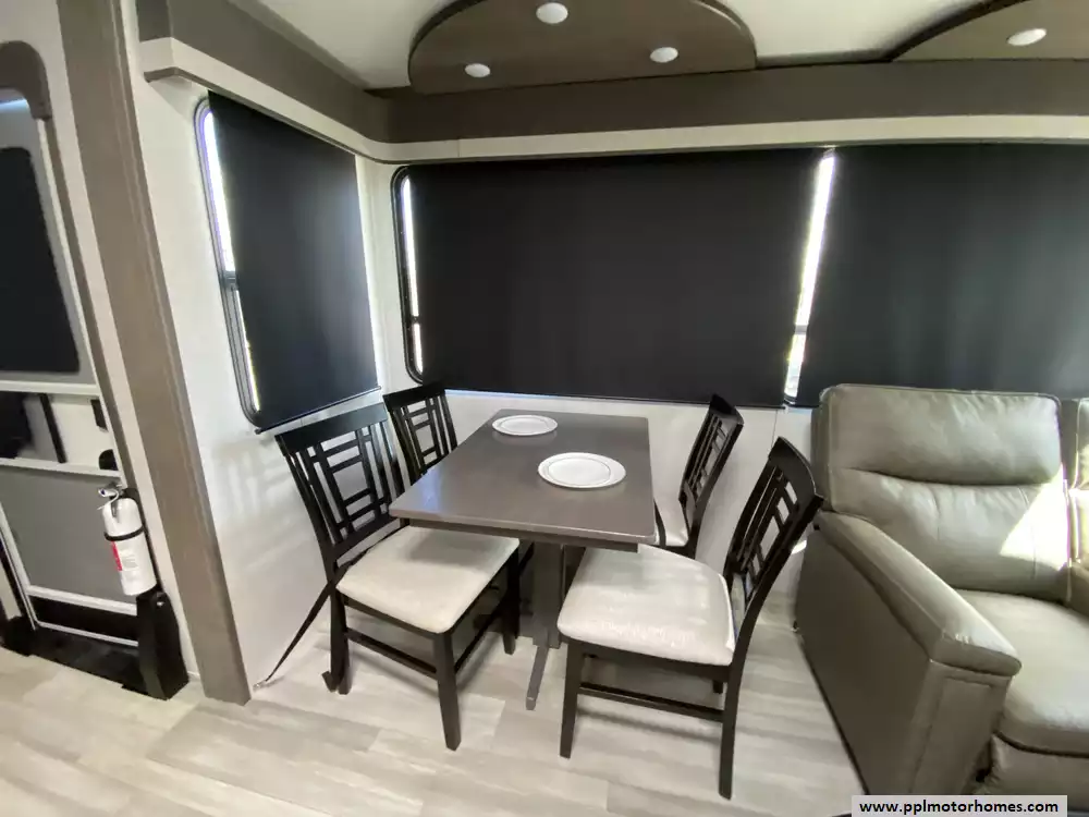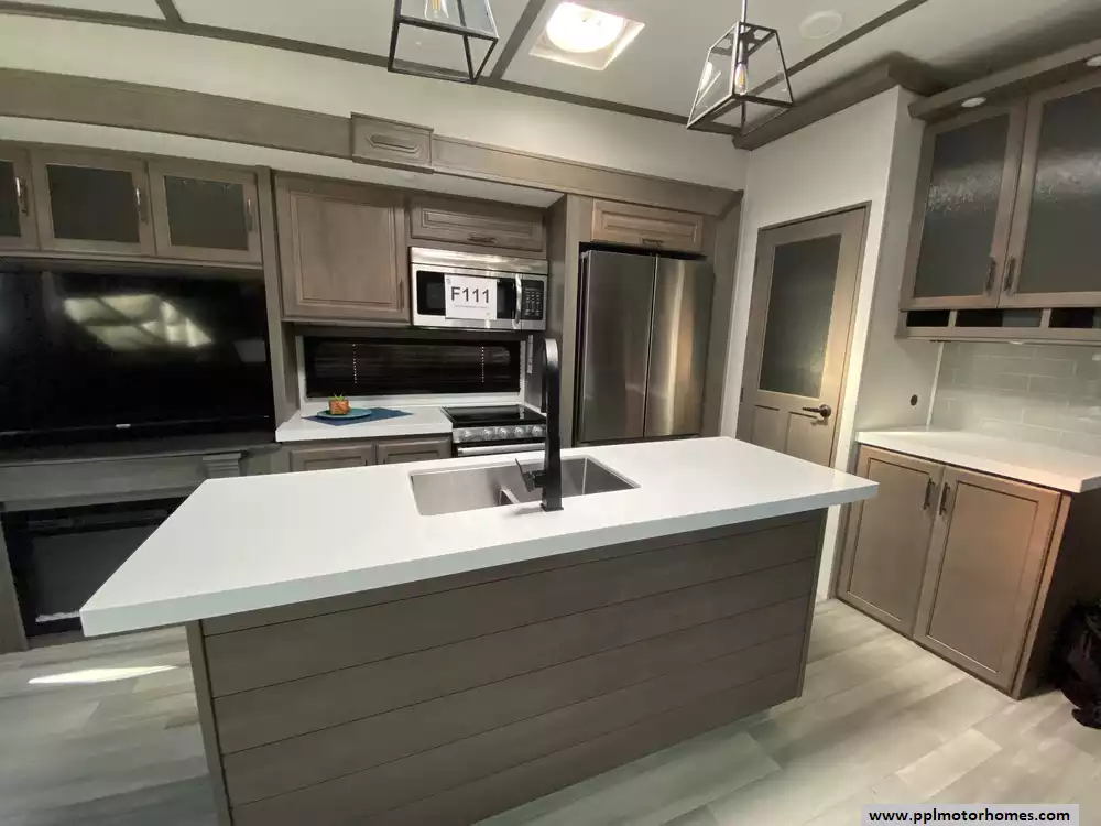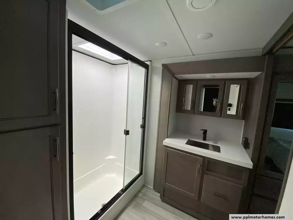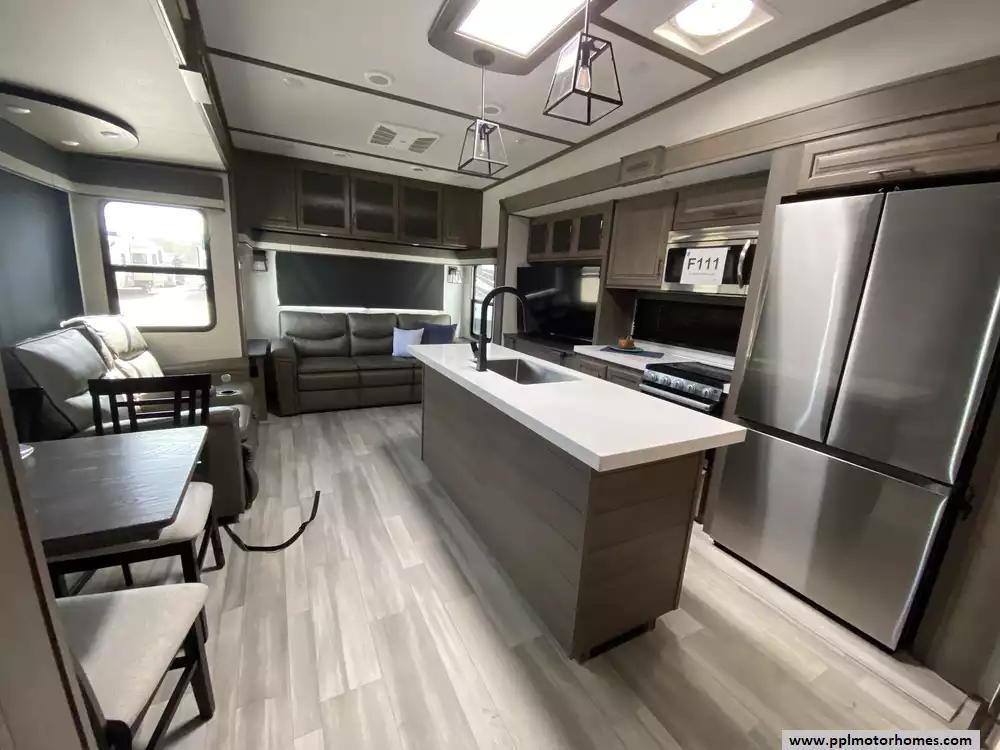 The gourmet-grade interior is anchored by a high-performance kitchen featuring a double-door 12V residential Samsung refrigerator with an integrated ice maker, a convection microwave, and a full three-burner range with an oven. Setting up camp is effortless thanks to the electric landing gear and the automatic main awning, which creates the perfect outdoor retreat complemented by exterior speakers and a convenient outside shower. With two televisions included for premium entertainment and a layout built for extended stays, this Solitude S-Class is expertly equipped to provide a professional, home-away-from-home experience on the open road.