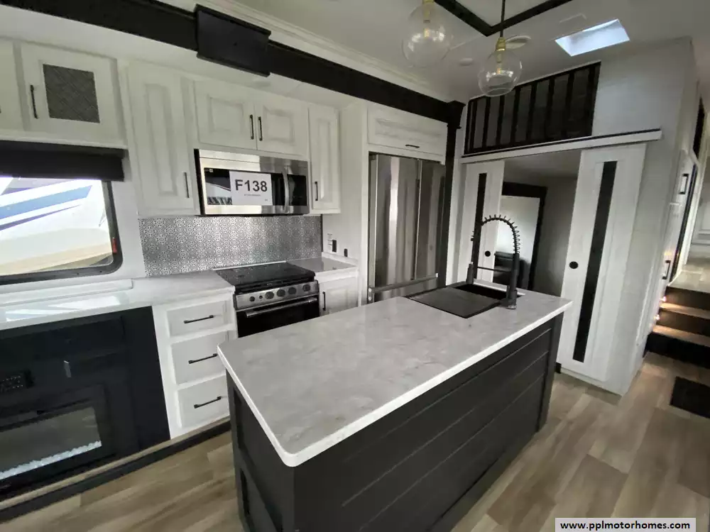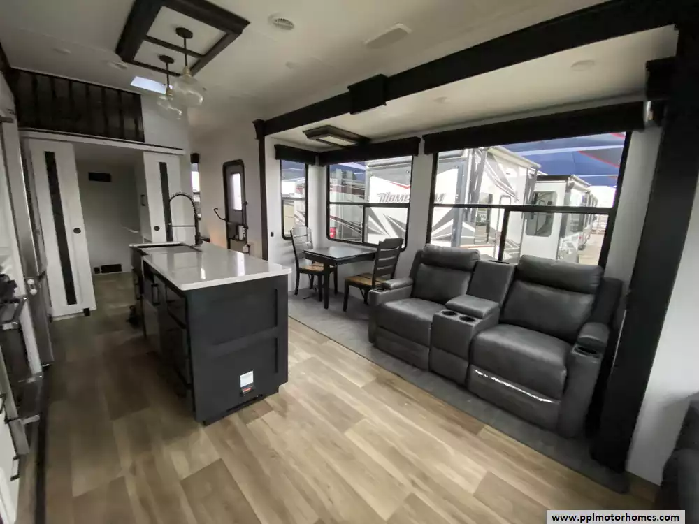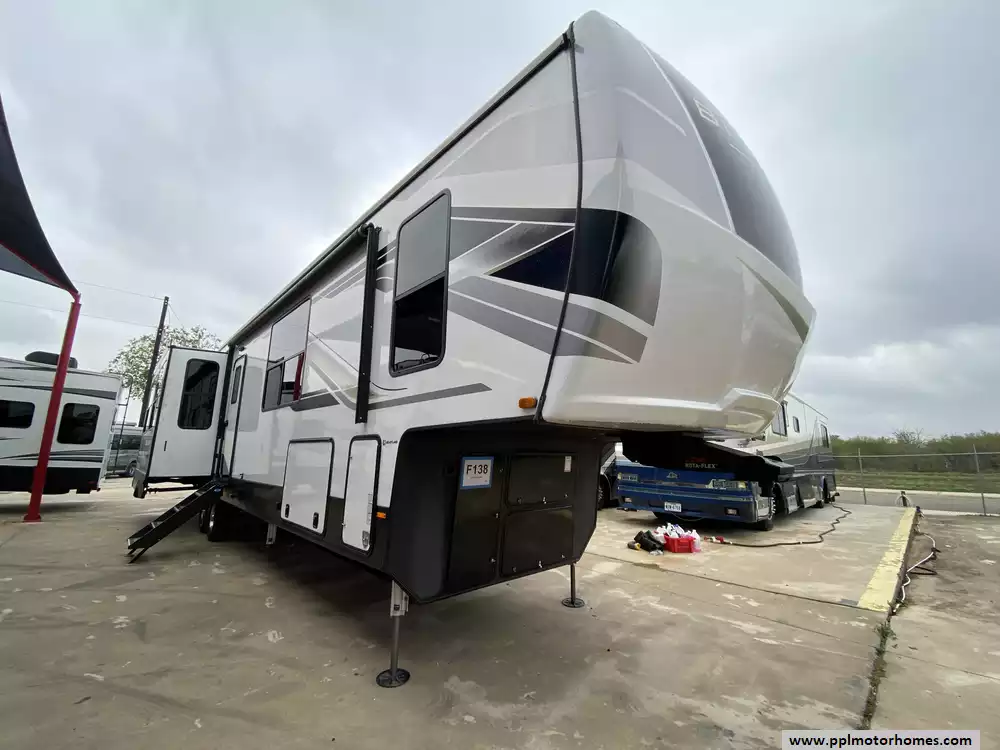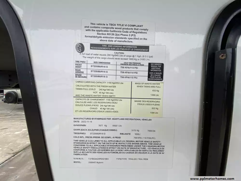 This 2023 Bighorn 3880MD has a Hydraulic Landing Gear, 4 Slide-outs, 2 Ducted Air Conditioners, Double Door 110v Residential Insignia Refrigerator, In-Fridge Ice Maker, Automatic Main Awning, Washer/Dryer Connections, Solar Panel, Dishwasher, Heated Tanks, Satellite Dish, TV, DVD Player, Outside Shower, Fireplace, Microwave, 3 Burner Range, Oven