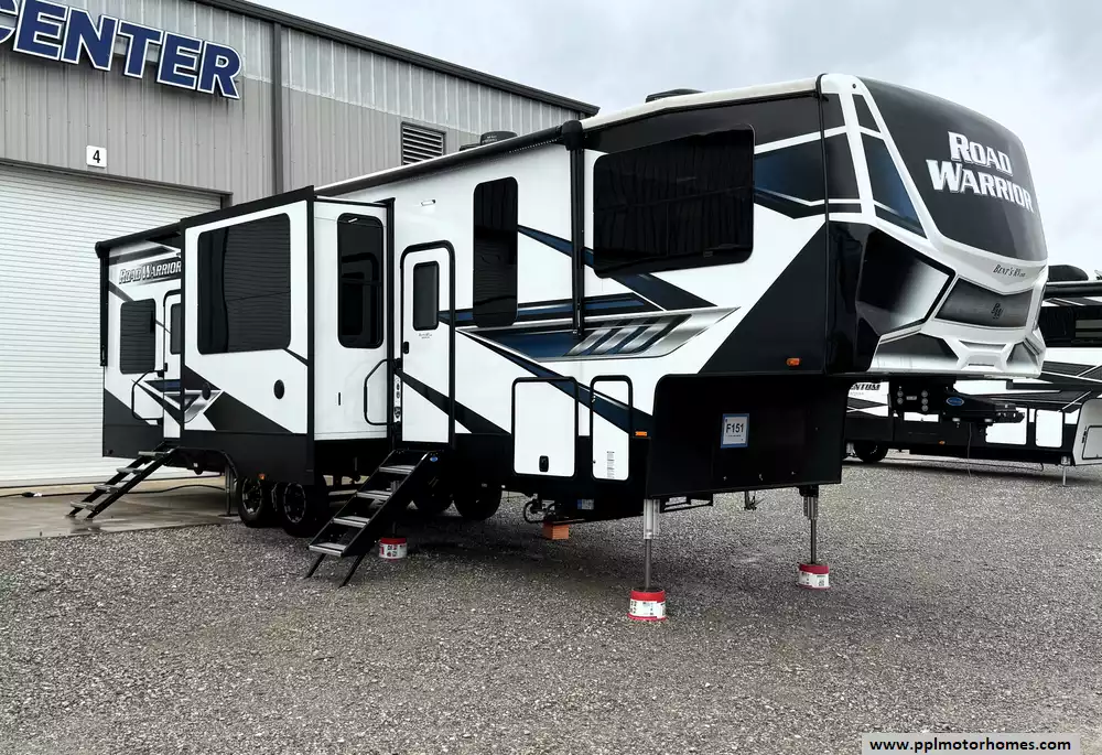 This 2023 Road Warrior M-375 has Hydraulic Landing Gear, 3 Slide-outs, Onan Propane Generator, 3 Ducted Air Conditioners, 4 Door Side by Side Gas/110v Norcold Refrigerator, Automatic Main Awning, Washer/Dryer Connections, Outside Speakers, 3 TVs, Outside Shower, Fireplace, Central Vacuum, Convection Microwave, 3 Burner Range, Oven