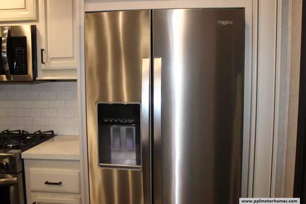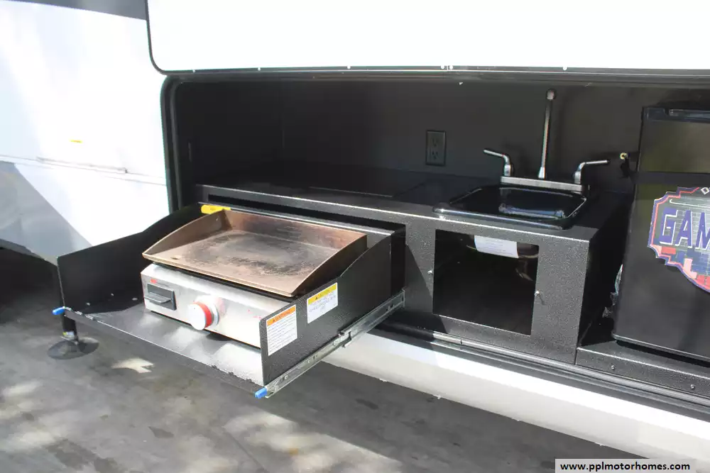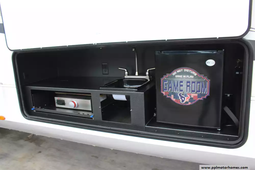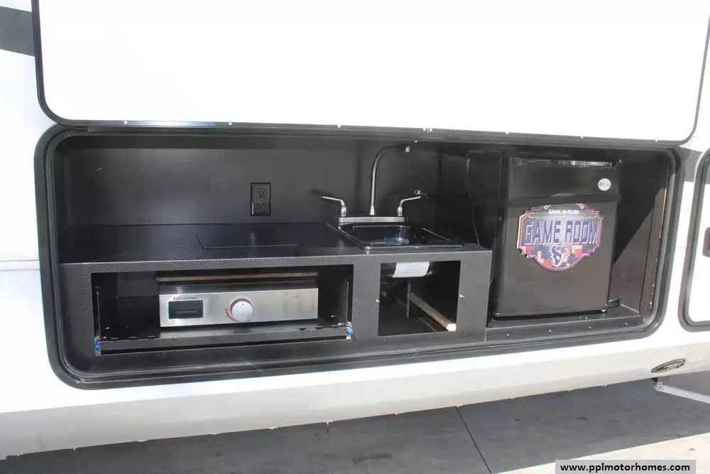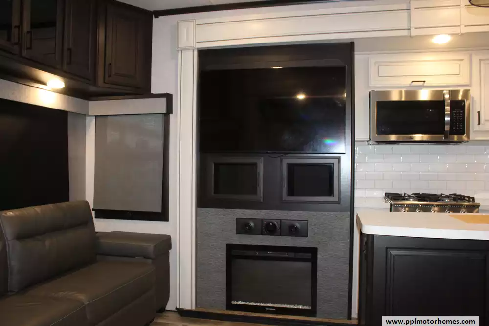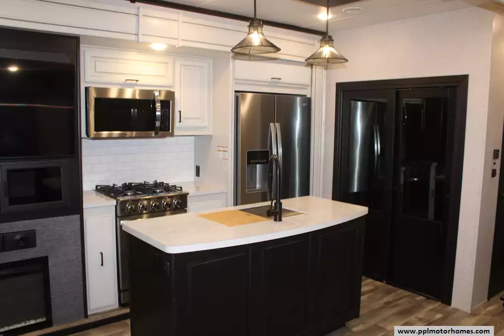 Setting up camp is seamless thanks to the hydraulic landing gear, while the automatic main awning and outdoor kitchen make it easy to host friends and family in the fresh air. The interior is packed with high-end amenities, including a side-by-side 110v residential Whirlpool refrigerator, a four-burner range, and a microwave for effortless meal prep. This listing is fully equipped for the road with an on-board washer and dryer, a satellite dish, and a TV for premium entertainment. Complete with outside speakers and a convenient outside shower, this Open Range 371MBH combines a professional-grade build with the comforts of home for a truly superior towing experience.