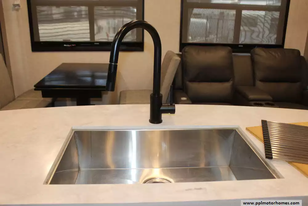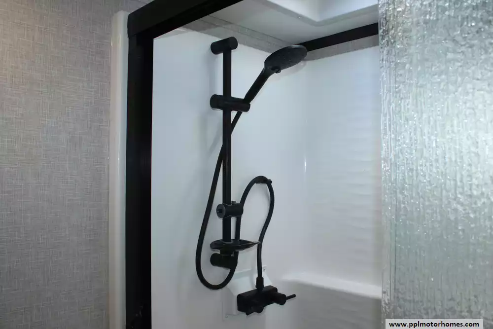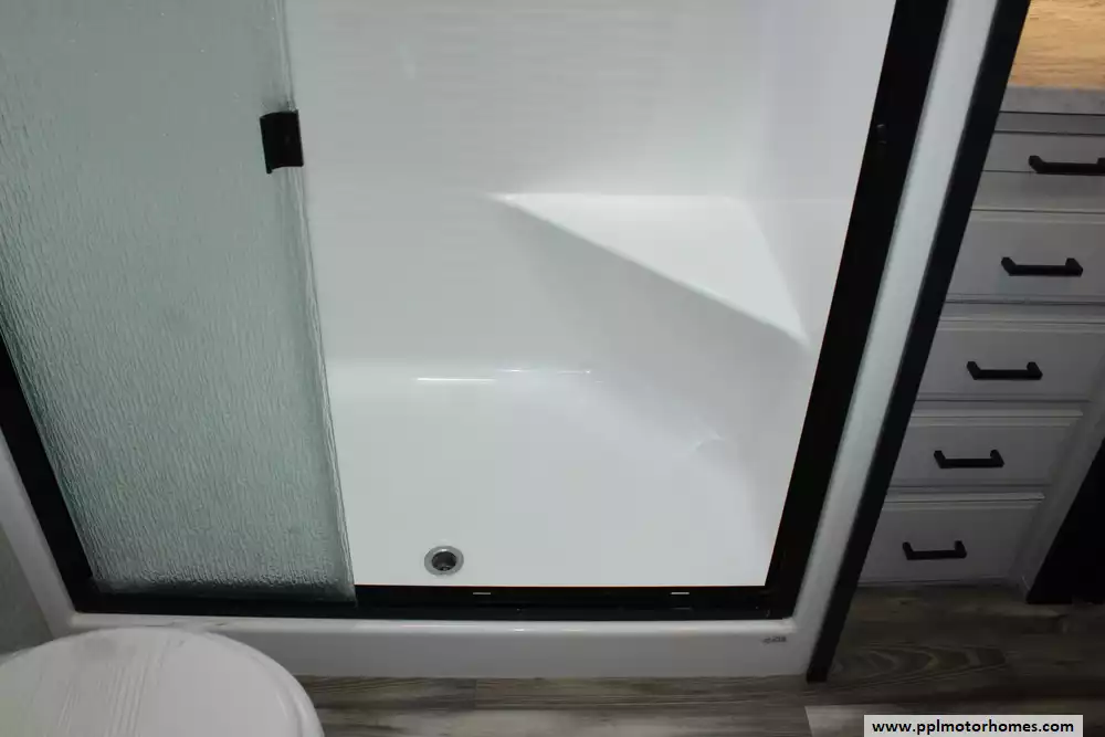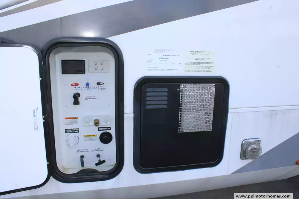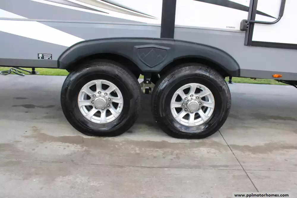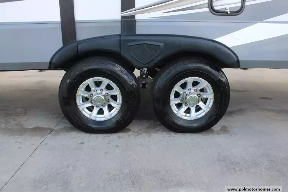 Specs: Length: 34.9 ft., Height: 11.11 ft., Interior Height: 6.67 ft., Fuel Capacity: 80 gal., Total Fresh Water Tank Capacity: 66 gal., Total Grey Tank Capacity: 45 gal., Total Black Water Tank Capacity: 45 gal., Total Propane Tank Capacity: 20 gal.