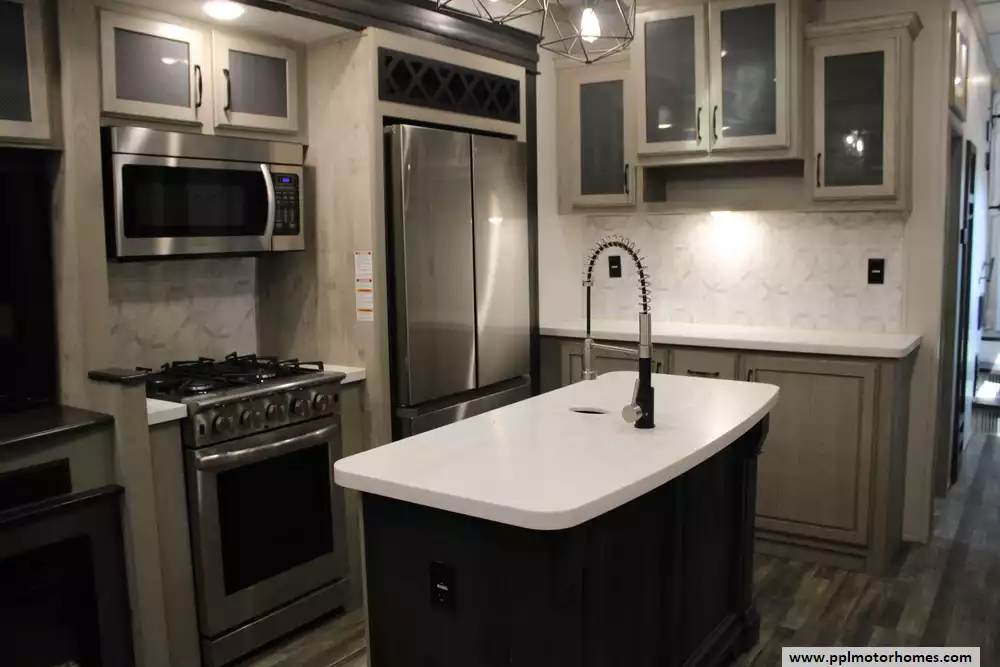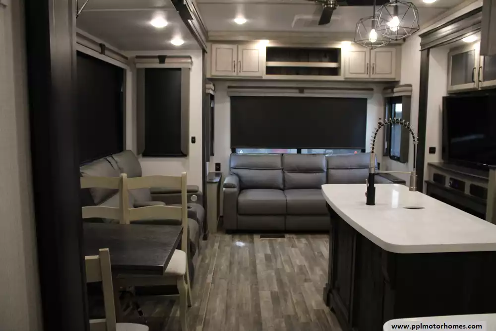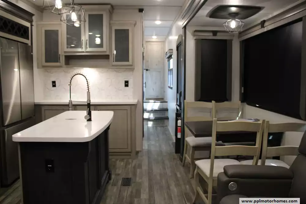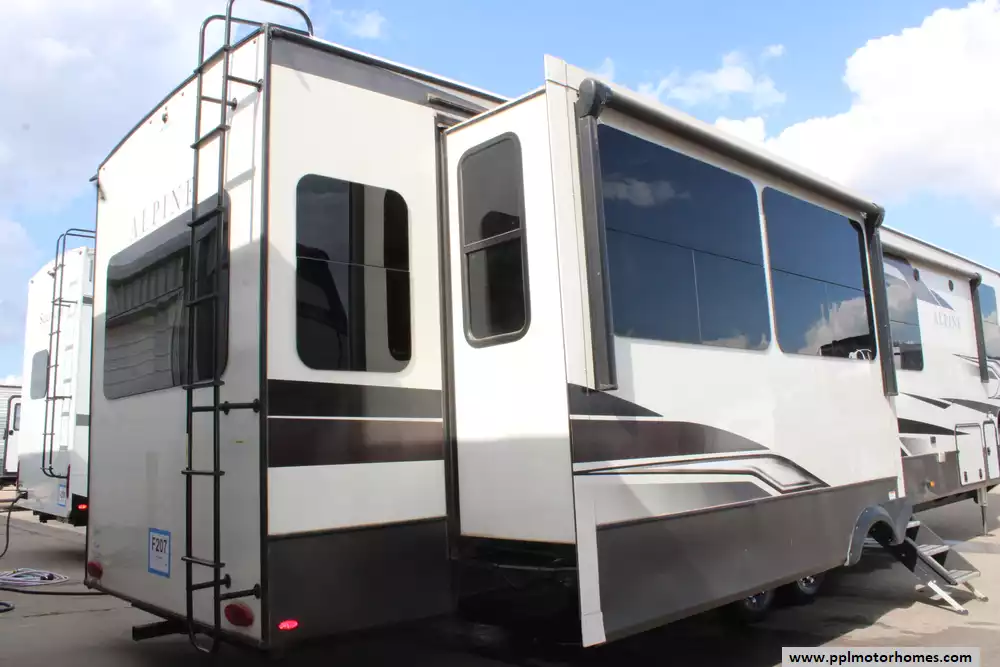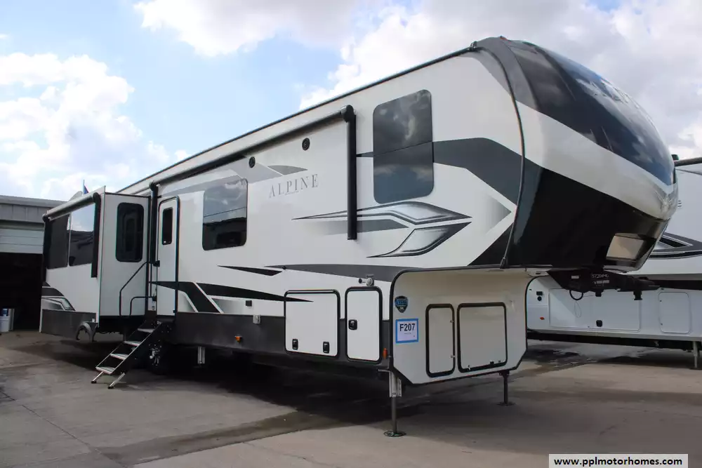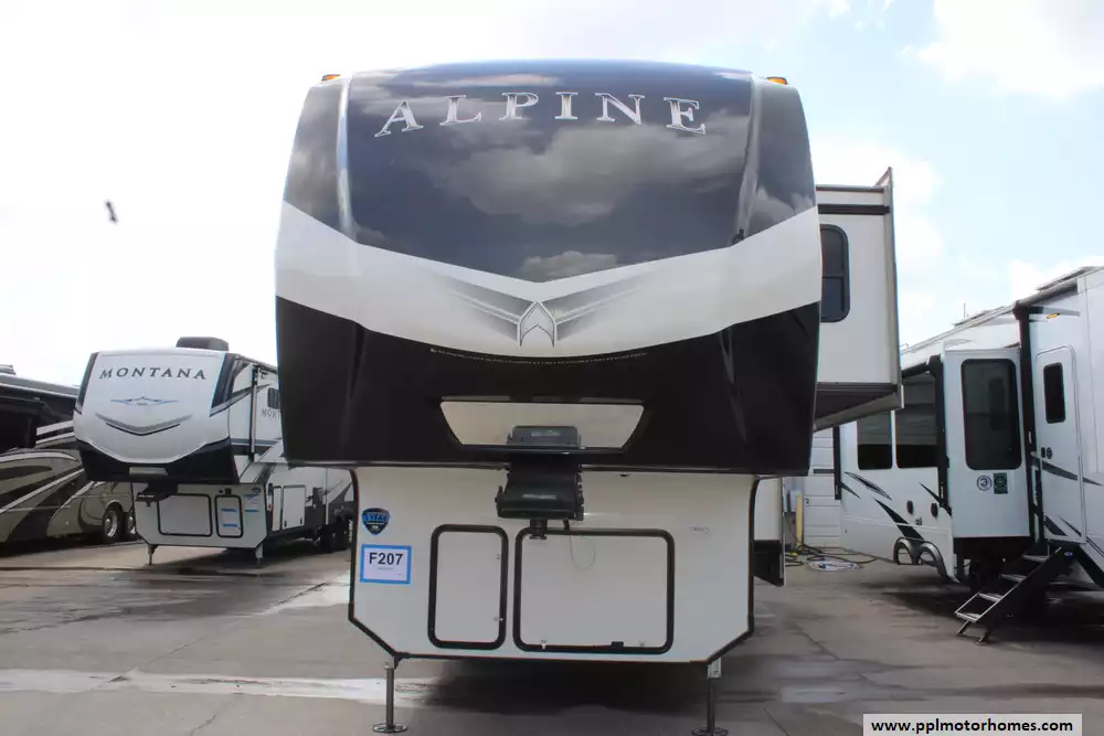 The 2023 Keystone Alpine 3720MD is a luxury fifth-wheel RV designed for extended stays and full-time living, offering a spacious residential feel with modern amenities and high-end construction. Measuring just over 41 feet in length with four slide-outs, it features a unique mid-den floorplan that can serve as an office or additional sleeping space, along with a front master bedroom and a large rear living area. Inside, the unit includes upscale touches such as a full-size kitchen with residential appliances, dual sofas, theater seating, a fireplace, and high ceilings with oversized windows for natural light.