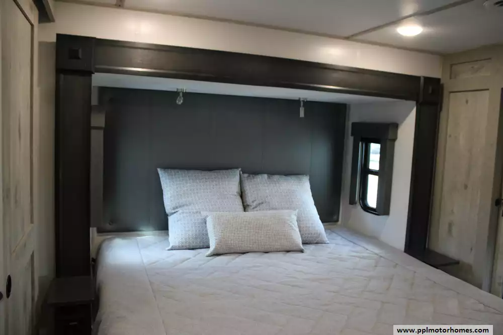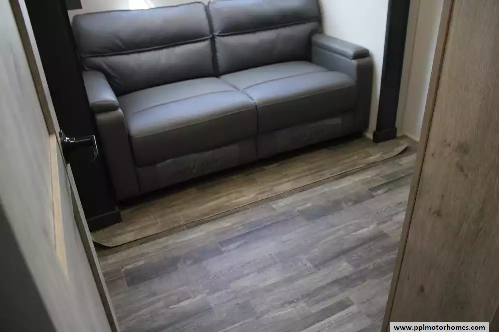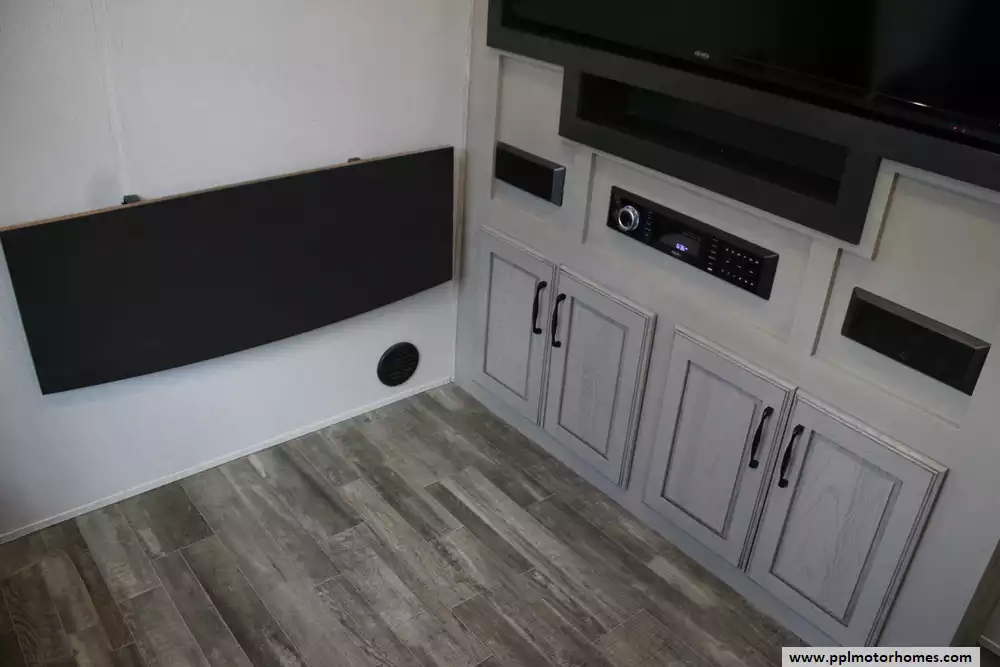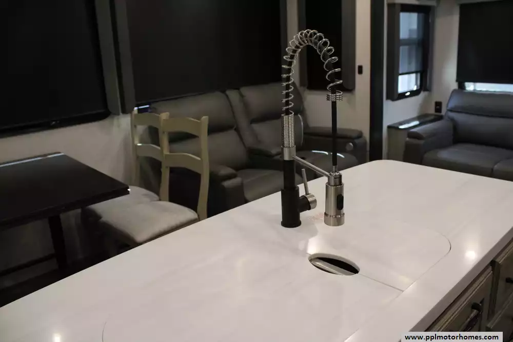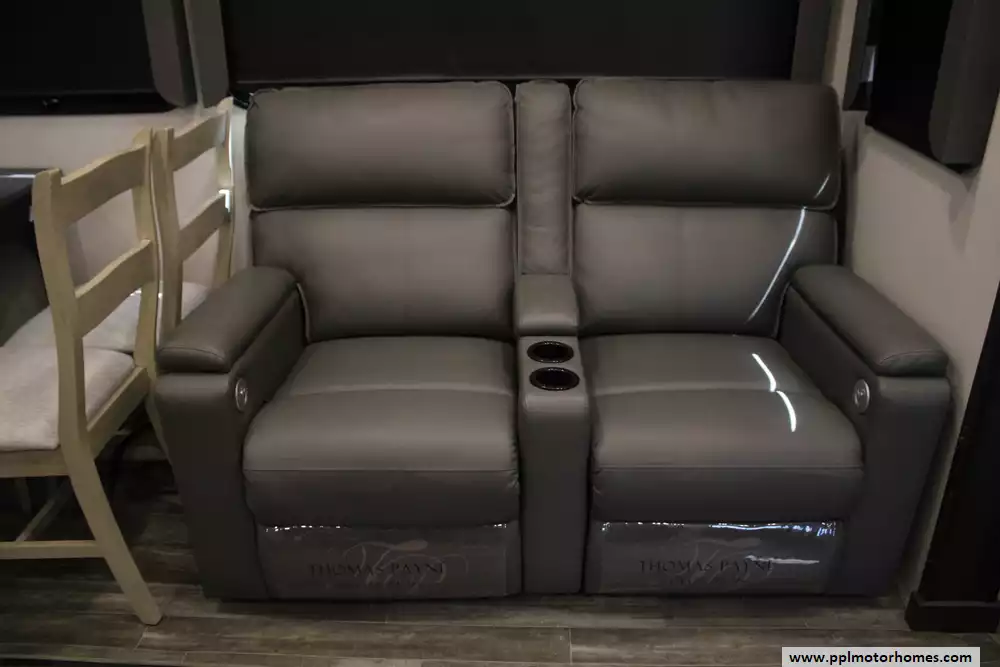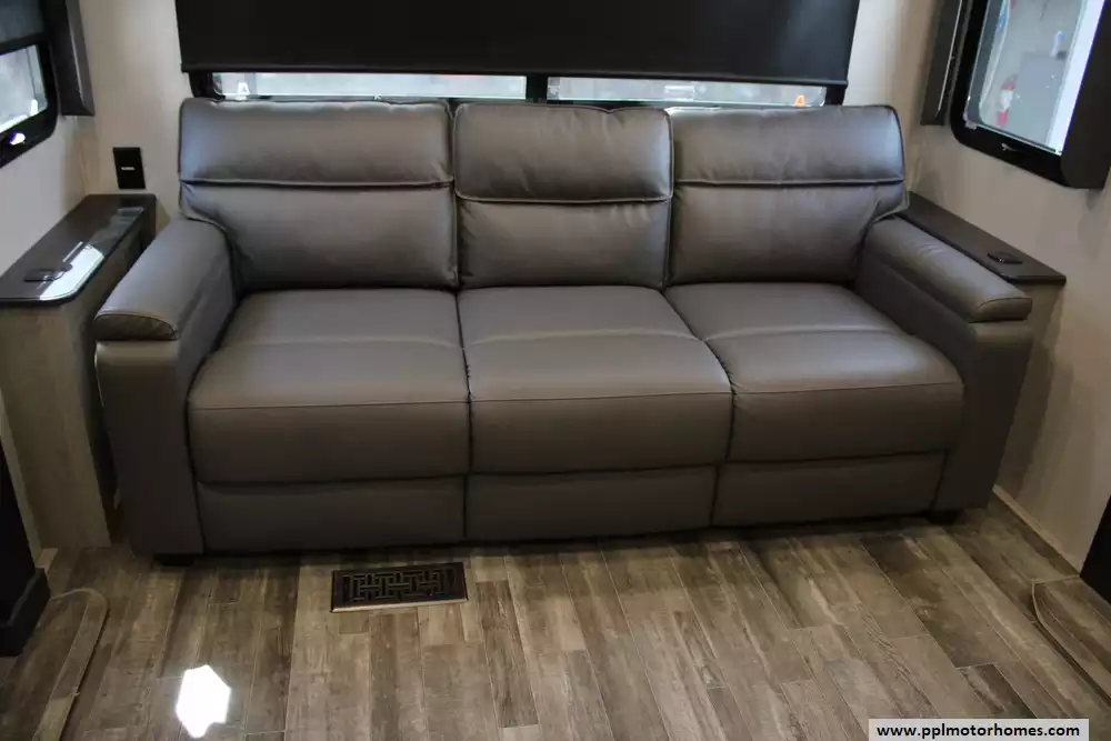 The 2023 Keystone Alpine 3720MD is a luxury fifth-wheel RV designed for extended stays and full-time living, offering a spacious residential feel with modern amenities and high-end construction. Measuring just over 41 feet in length with four slide-outs, it features a unique mid-den floorplan that can serve as an office or additional sleeping space, along with a front master bedroom and a large rear living area. Inside, the unit includes upscale touches such as a full-size kitchen with residential appliances, dual sofas, theater seating, a fireplace, and high ceilings with oversized windows for natural light.
