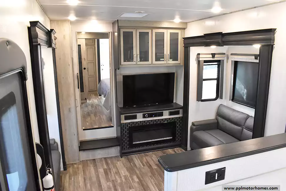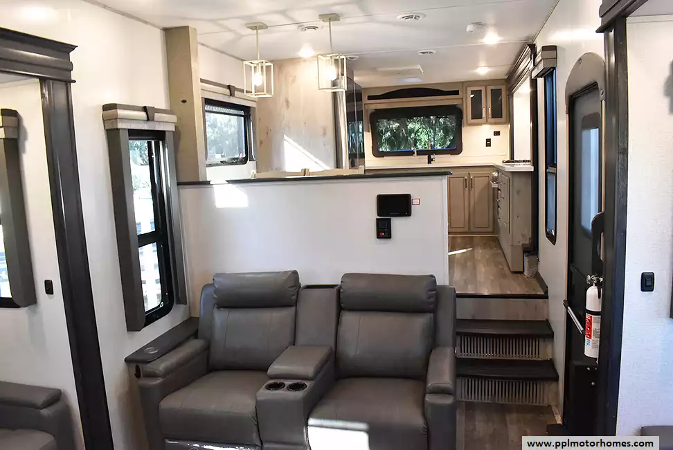 This 2023 Alpine 3790FK has a Hydraulic Landing Gear, 5 Slide-outs, 2 Ducted Air Conditioners, Residential Samsung Refrigerator, In-Fridge Ice Maker, Automatic Main Awning And Door Awning, Solar Panel, Heated Tanks, Outside Speakers, 2 TVs, DVD Player, Fireplace, Convection Microwave, 3 Burner Range, Oven