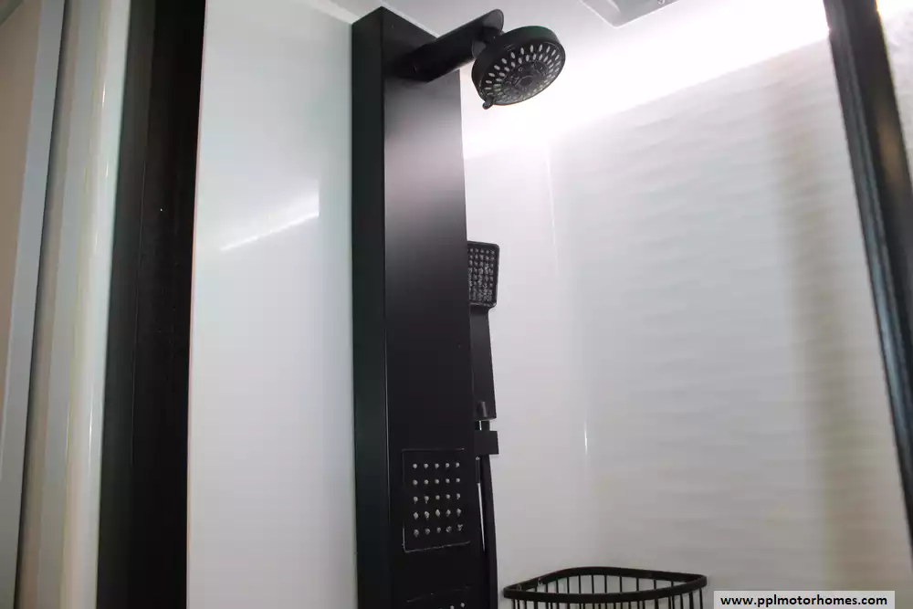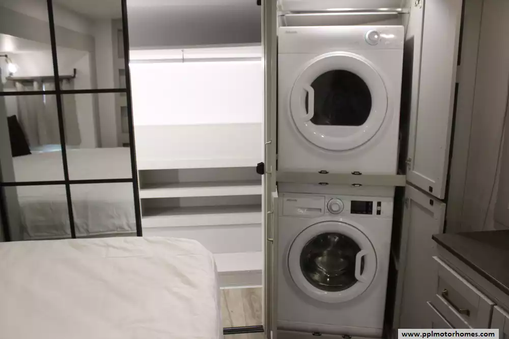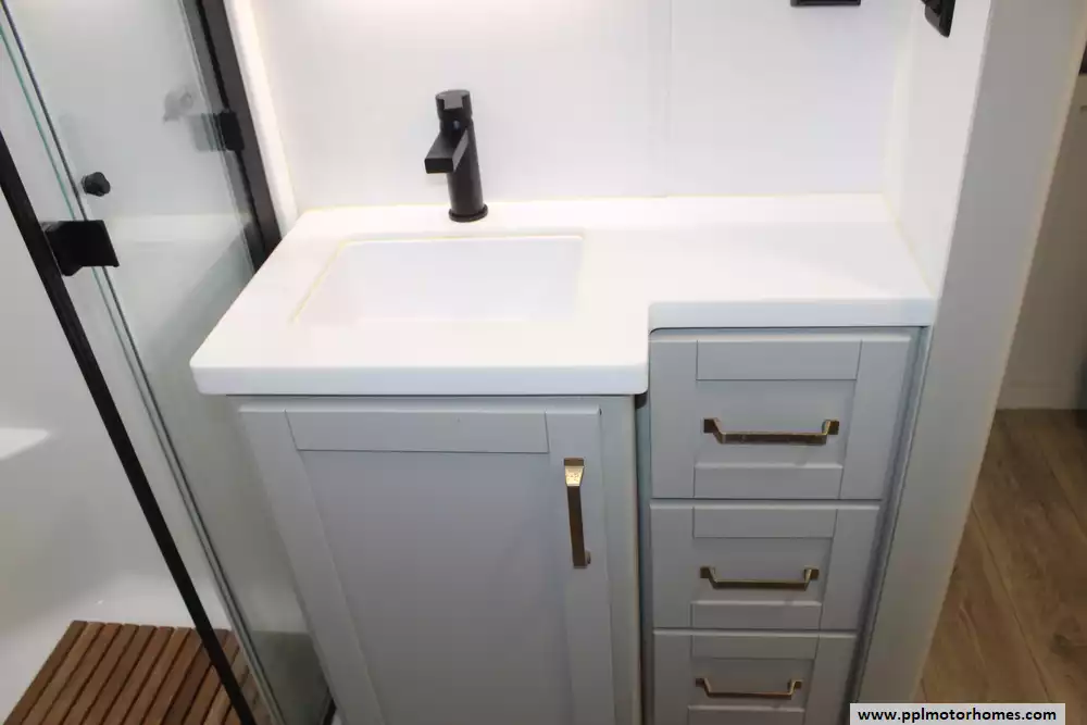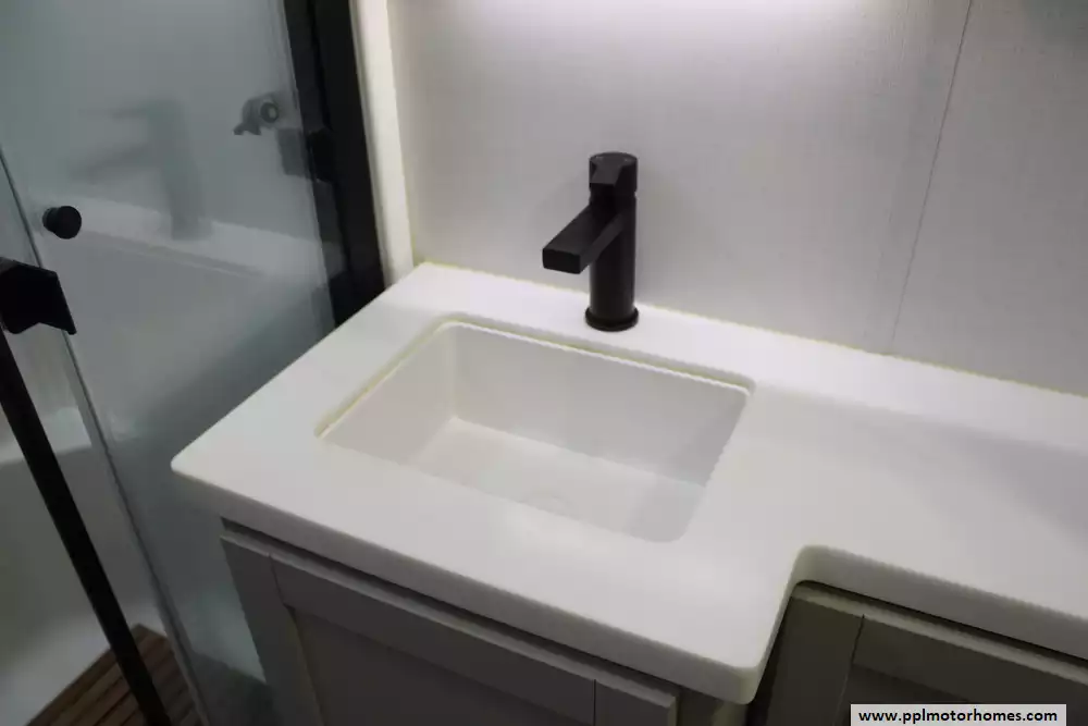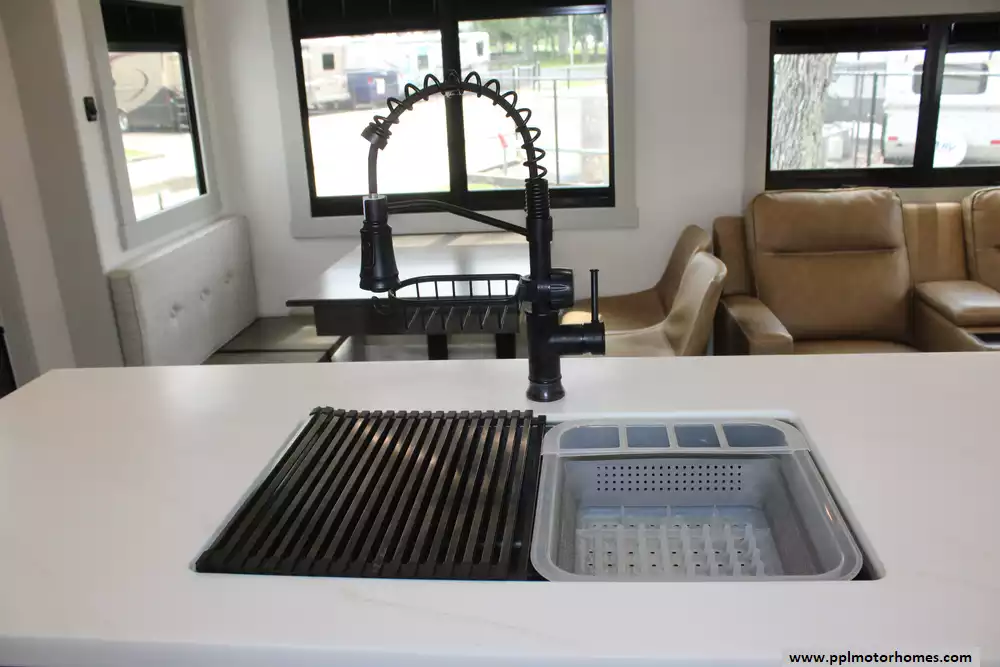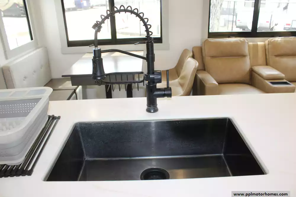 There is a Gimili touchless faucet in the kitchen to help conserve water and to allow setting the temp and flow rate for convenience. The Washer/Dryer were added and a RV water softener in the belly.