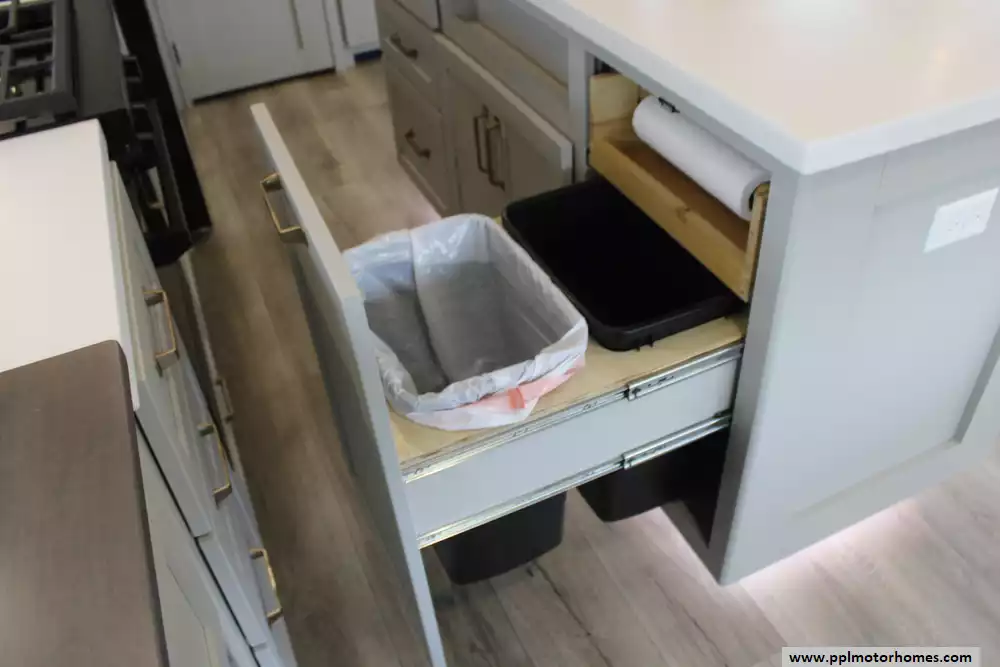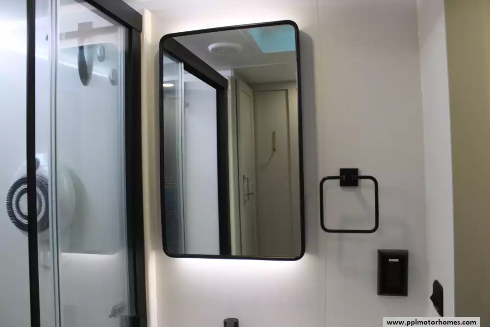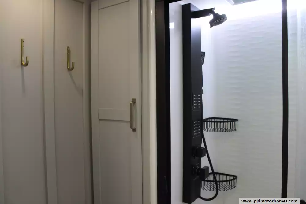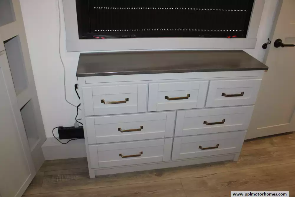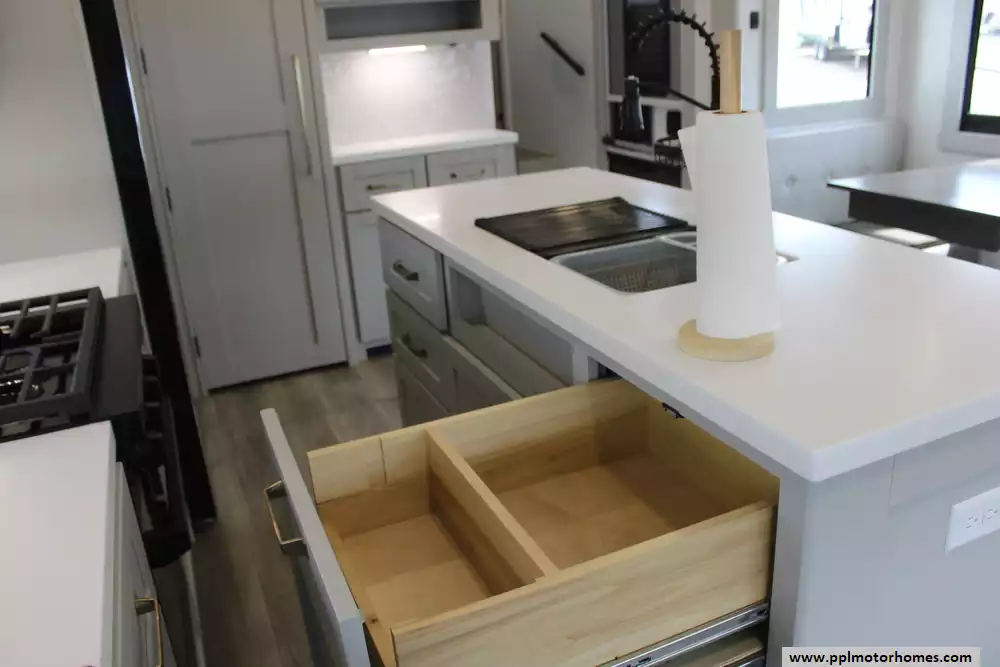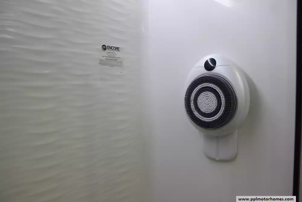 There is a Gimili touchless faucet in the kitchen to help conserve water and to allow setting the temp and flow rate for convenience. The Washer/Dryer were added and a RV water softener in the belly.