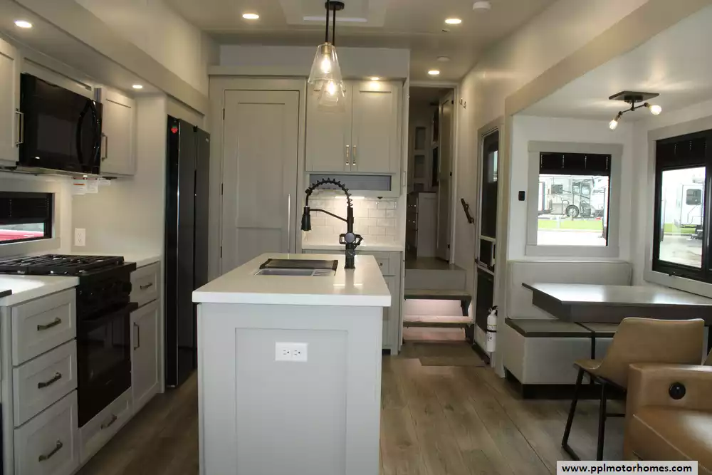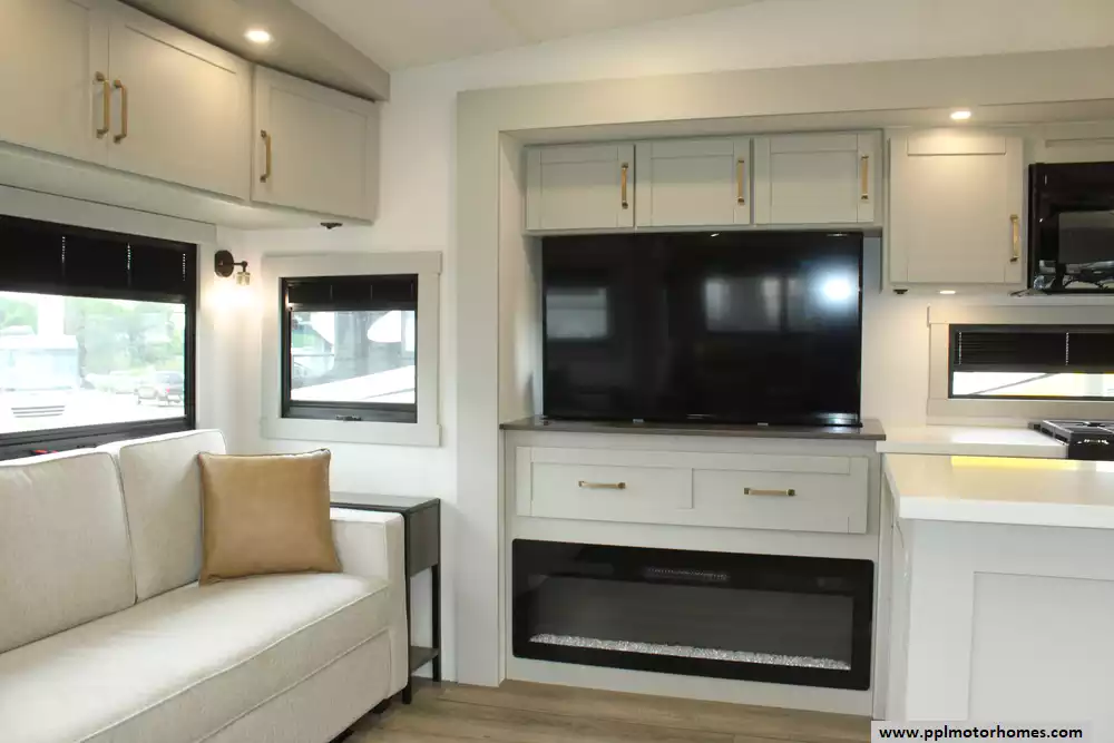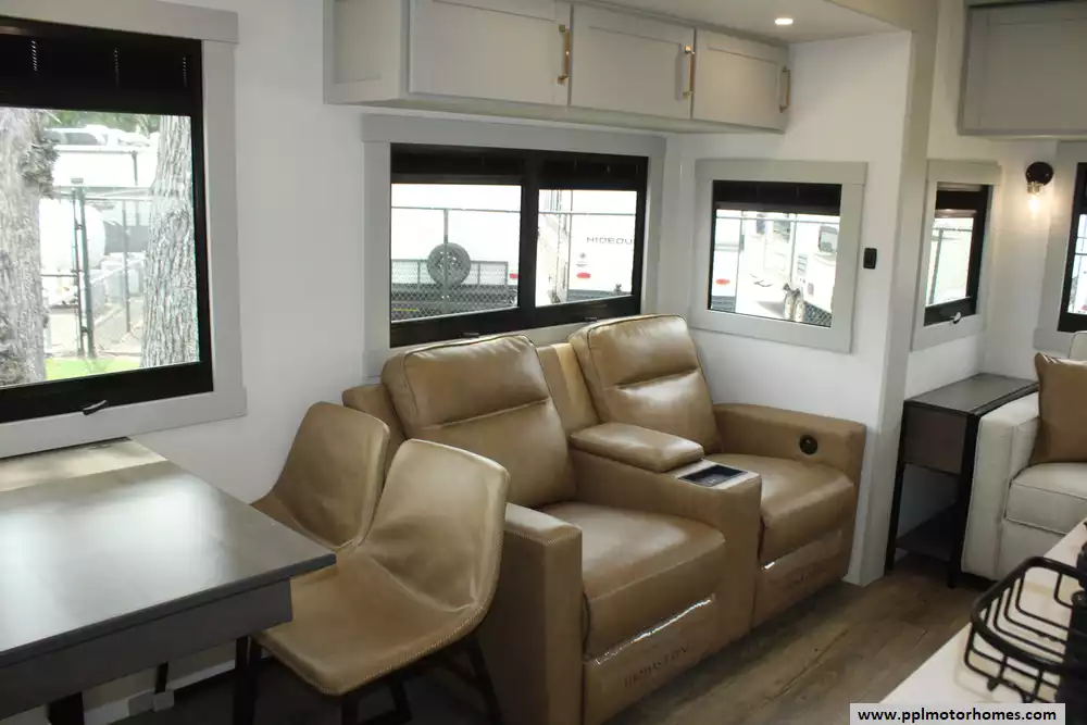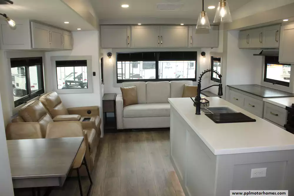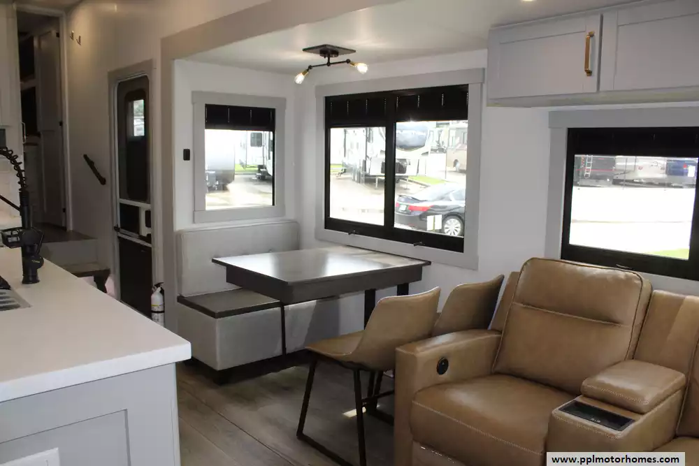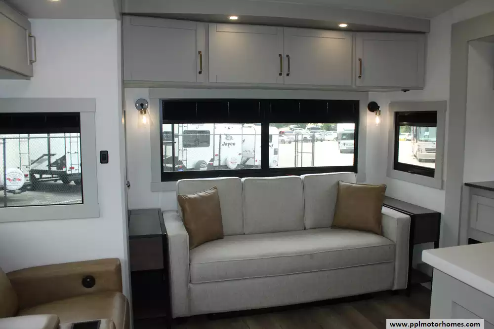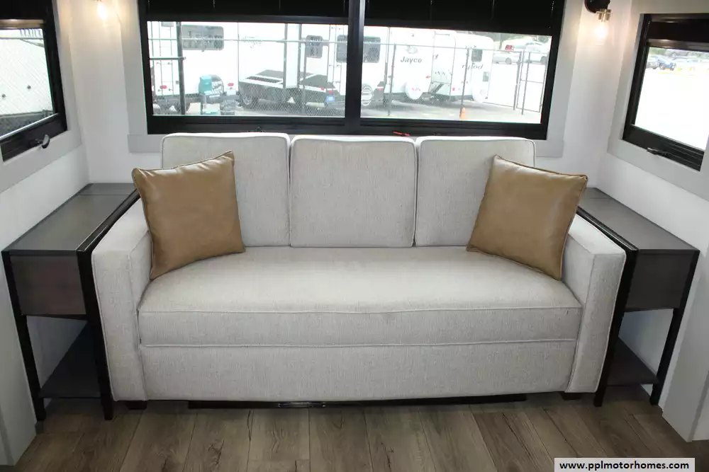 The interior of the Z 3100 is designed for those who refuse to compromise on comfort, featuring premium finishes and a large refrigerator to keep your supplies fresh for long-haul adventures. Known for its clean aesthetic and focus on functional luxury, this model balances sophisticated style with rugged durability. From the sleek frameless windows to the thoughtfully engineered storage solutions, every detail of the Brinkley Z 3100 is crafted to provide a seamless and elevated travel experience for the discerning RVer.