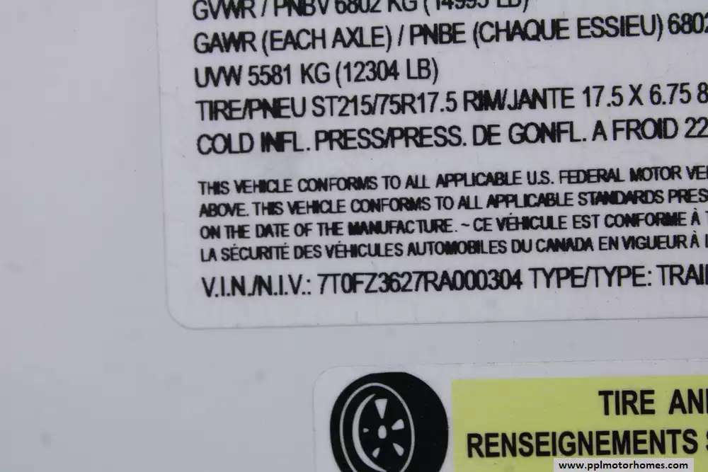 Dry Weight (UVW): 11,923 lbs GVWR: 14,995 lbs Hitch Weight: 2,142 lbs Payload Capacity: 3,072 lbs Length: 34' 11" Height: 13' 2" Width: 96" Capacities Fresh Water: 75 gal Gray Water: 90 gal Black Water: 45 gal Water Heater: Tankless (On Demand) Propane: 2 X 30 lbs