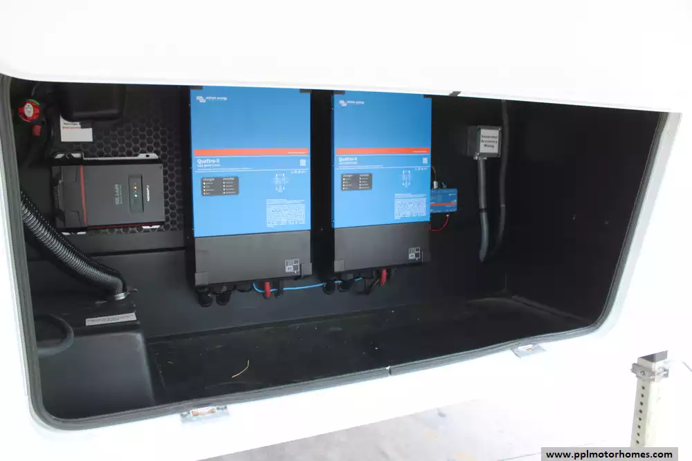 The electrical system is designed for back-up power and power when off-grid from battery bank instead of the split phase 50A shore power. You will not notice shore power disruptions and can use all appliances from the battery bank. It intercepts the shore power and leaves the Brinkley systems intact. The system has a 120V 15A plug that can be used to charge the batteries from any outlet and was designed to plug into the 2KW ProPower outlet in the bed of Ford's Superduty trucks. This allow you to run all systems and charge while driving to make travel very comfortable.
