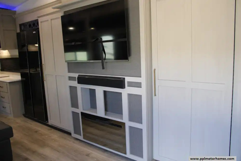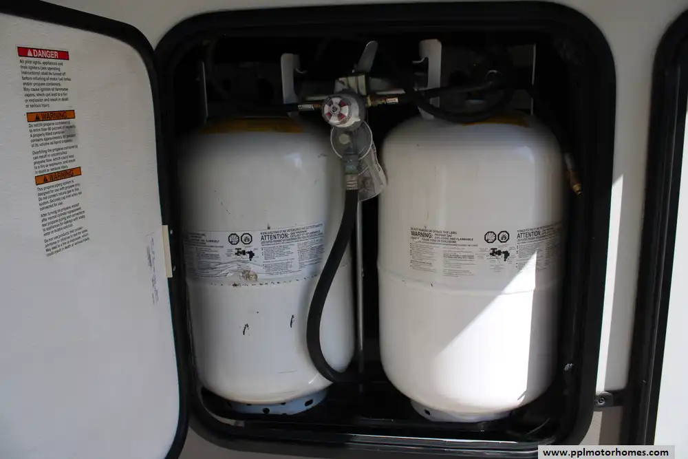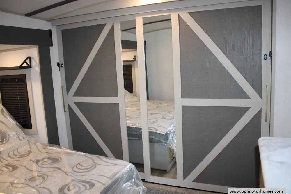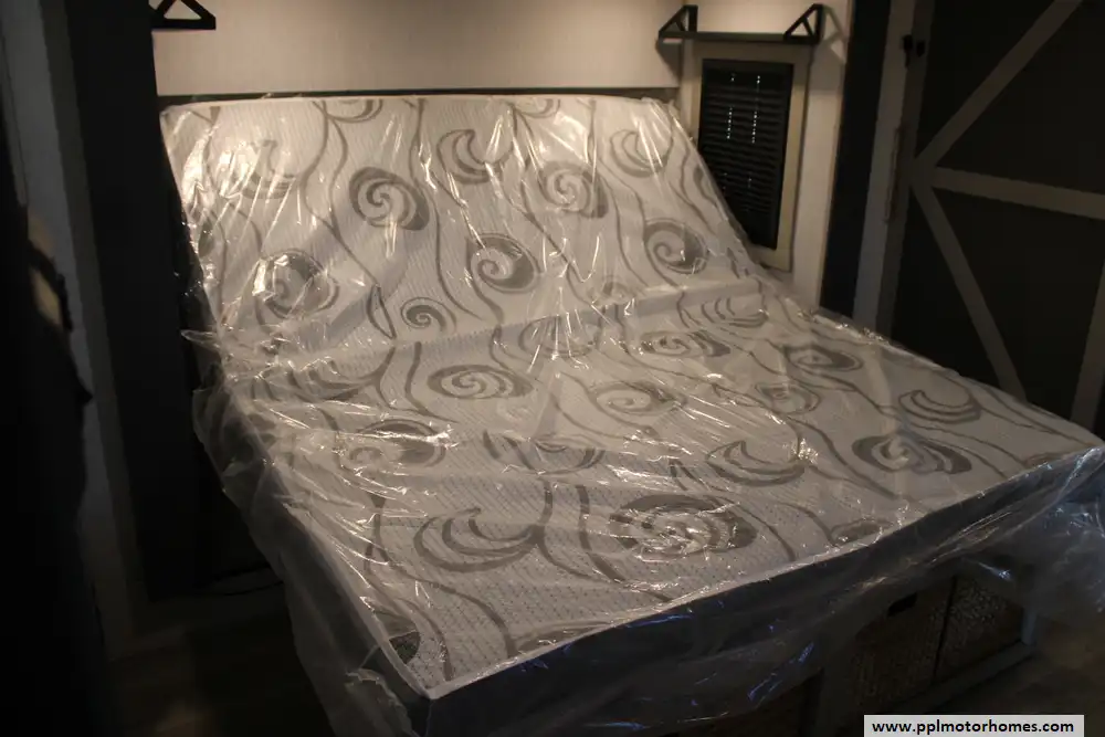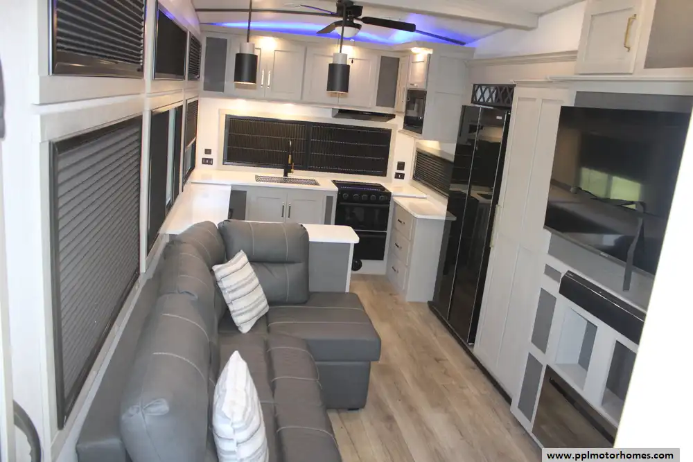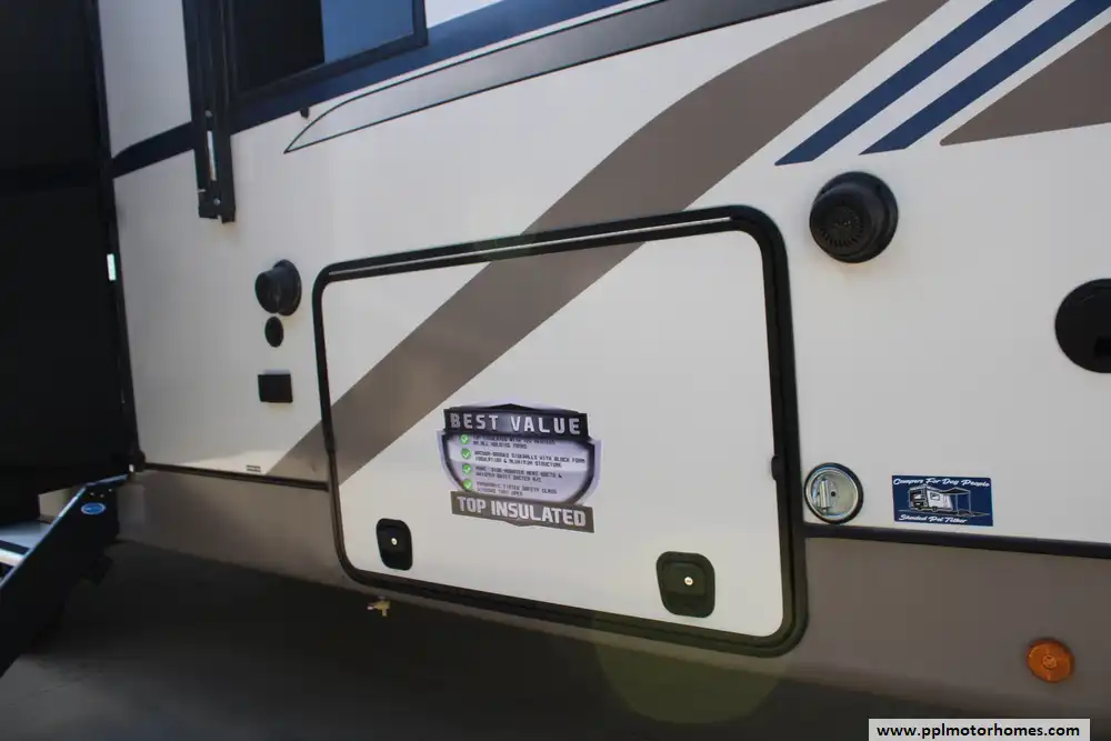 The front private bedroom features a king-size Versa-Tilt bed for added walk-around space, along with a large wardrobe, and the unit also includes a full bathroom with a residential-style shower. Built with vacuum-bonded aluminum-frame construction and fiberglass sidewalls, it combines durability with modern amenities such as a 16 cu. ft. refrigerator, tankless water heater, 15K BTU air conditioning system, solar prep, and an outdoor kitchen/bar setup.