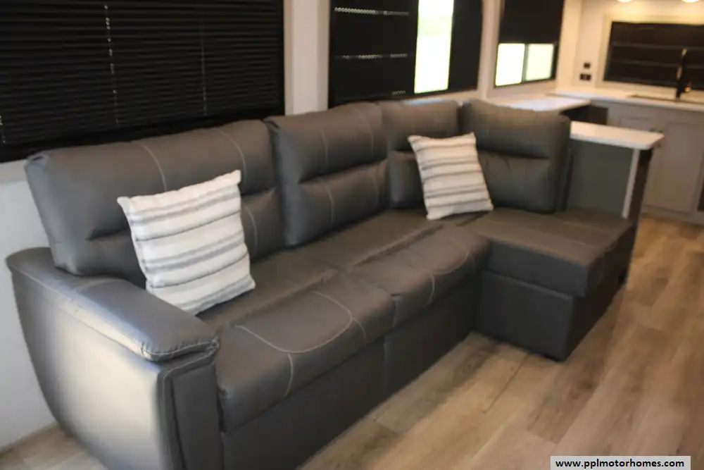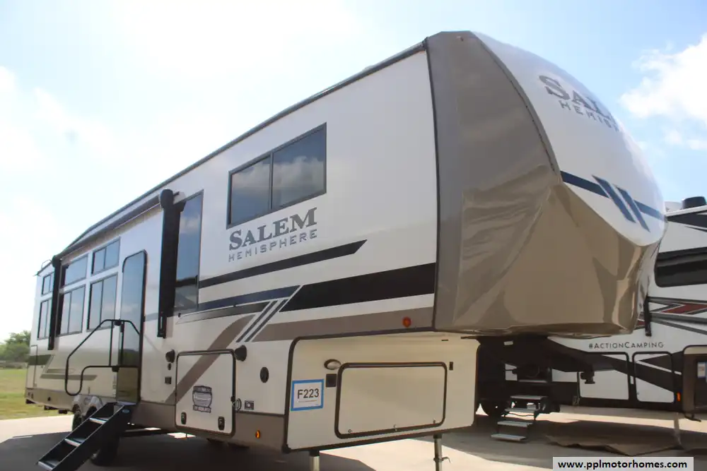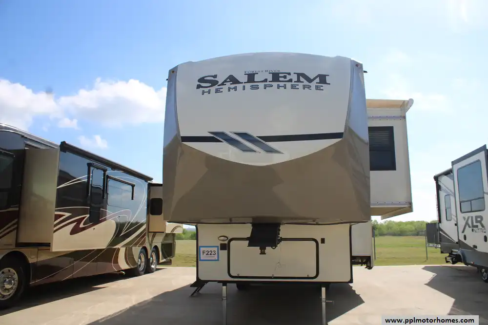 The 2024 Forest River Salem Hemisphere 320VIEW is a spacious, residential-style fifth wheel designed for extended stays and family comfort, measuring just under 38 feet in length and featuring two slide-outs for expanded living space. It stands out with its rear kitchen layout, offering wraparound solid-surface countertops, bar seating, and large panoramic windows that provide an open, airy feel, while the central living area includes a sectional sofa, entertainment features, and a cleverly designed hidden bunk room within a slide-out for additional sleeping or storage flexibility.