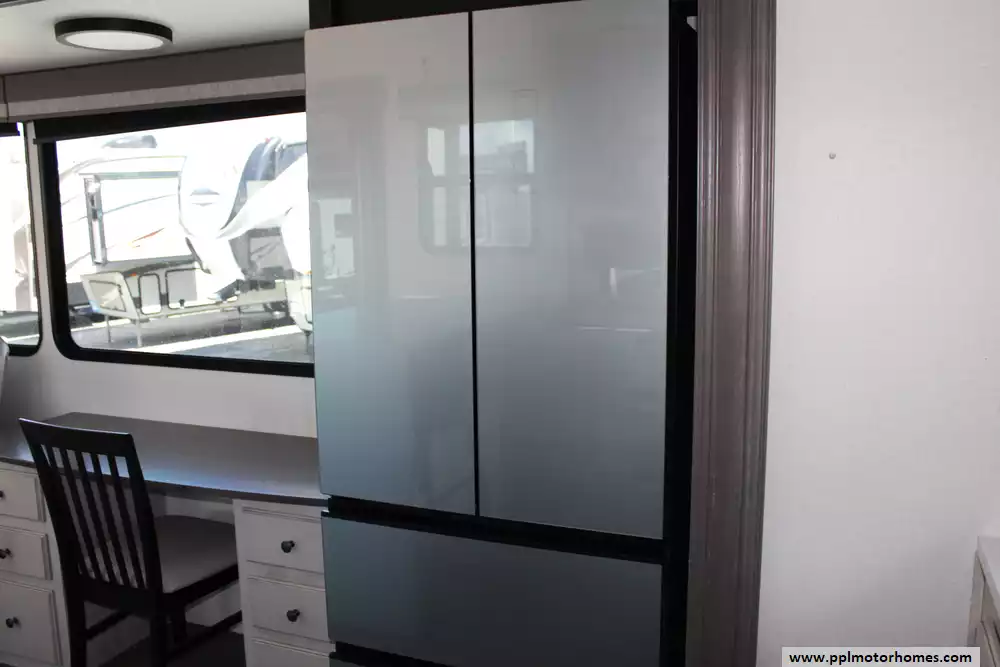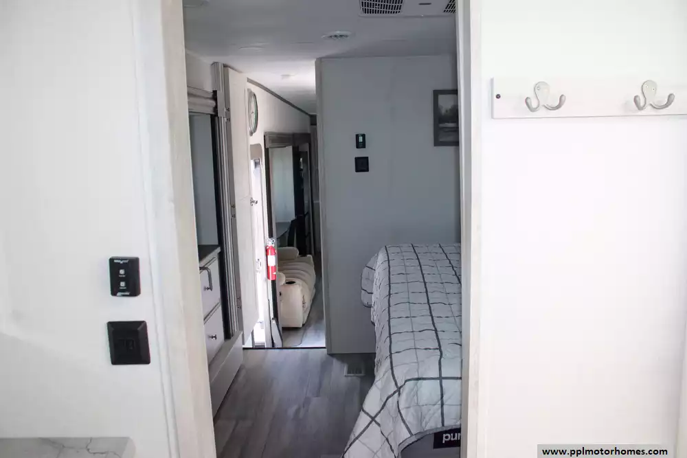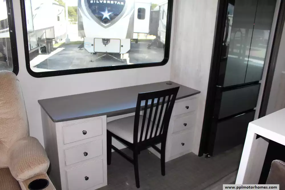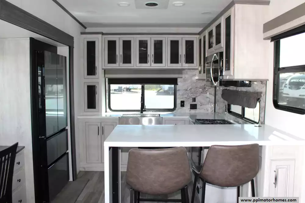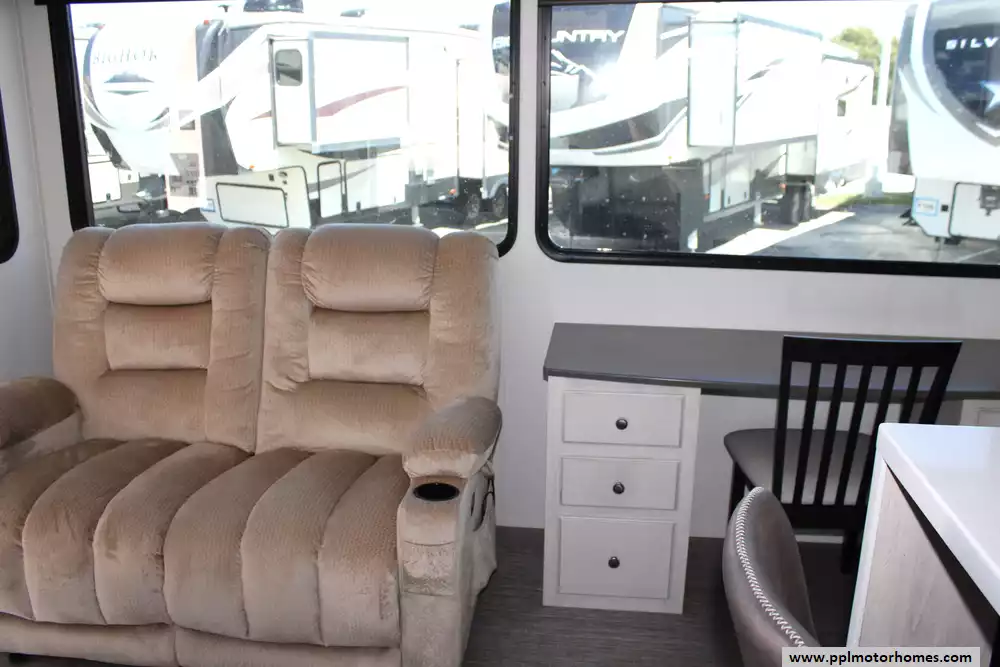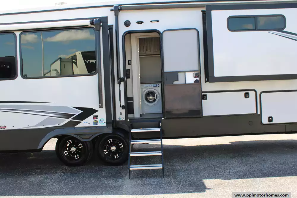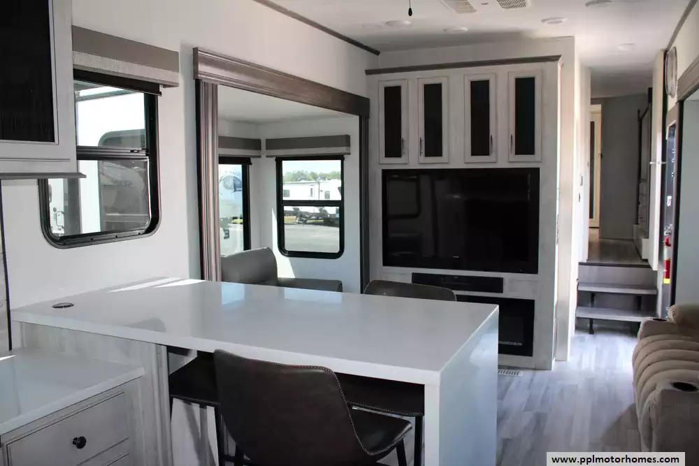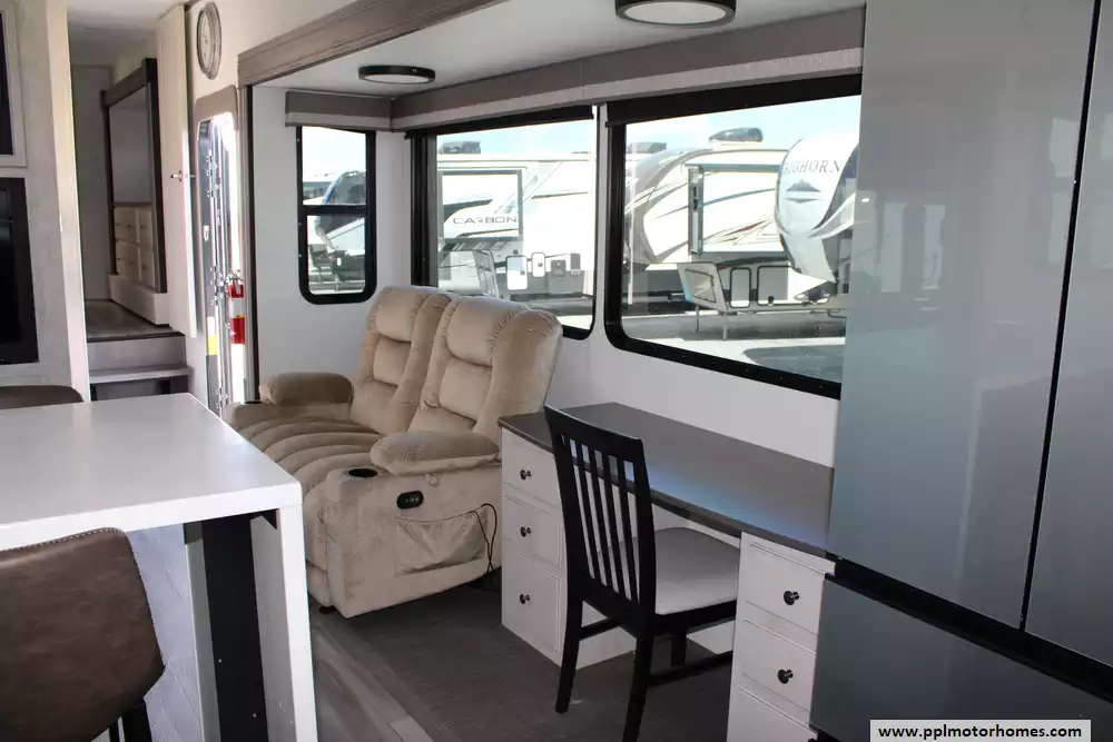 Step inside and enjoy a large open living area with opposing slides, theater seating, a tri-fold sofa, a fireplace, and a big-screen LED TV for entertainment. The stunning rear kitchen comes equipped with solid surface countertops, stainless steel appliances, a full-size refrigerator, and plenty of cabinetry, plus a bar-style counter for cooking and hosting. The private master suite features a king-size bed with a custom purple mattress, a large wardrobe, and direct access to a deluxe bathroom with dual sinks and a residential shower. A dedicated laundry room with washer/dryer prep makes extended stays even more convenient.