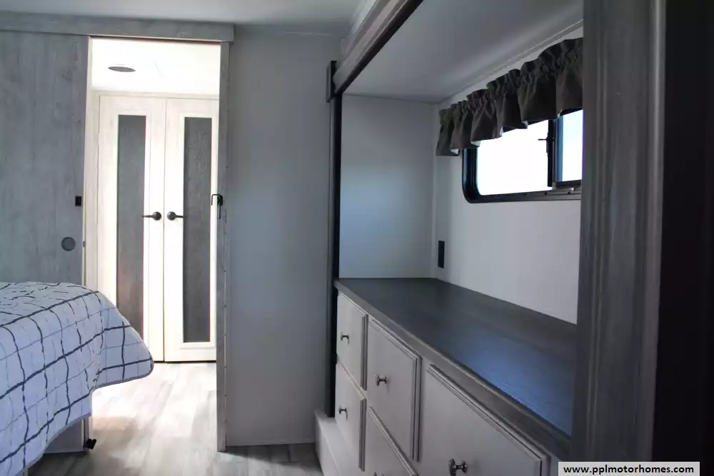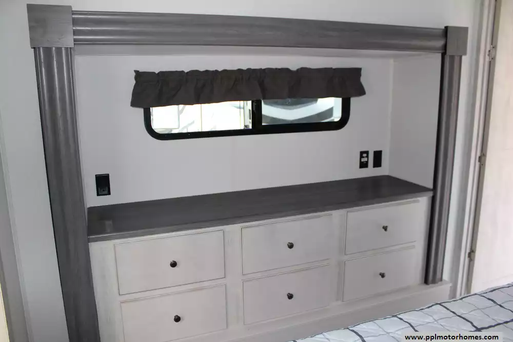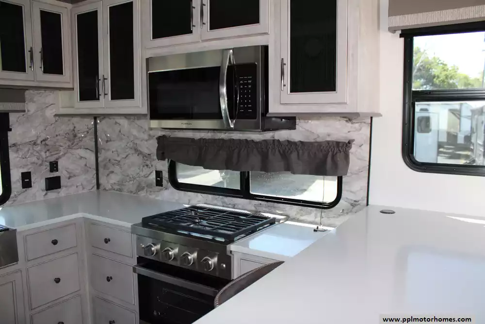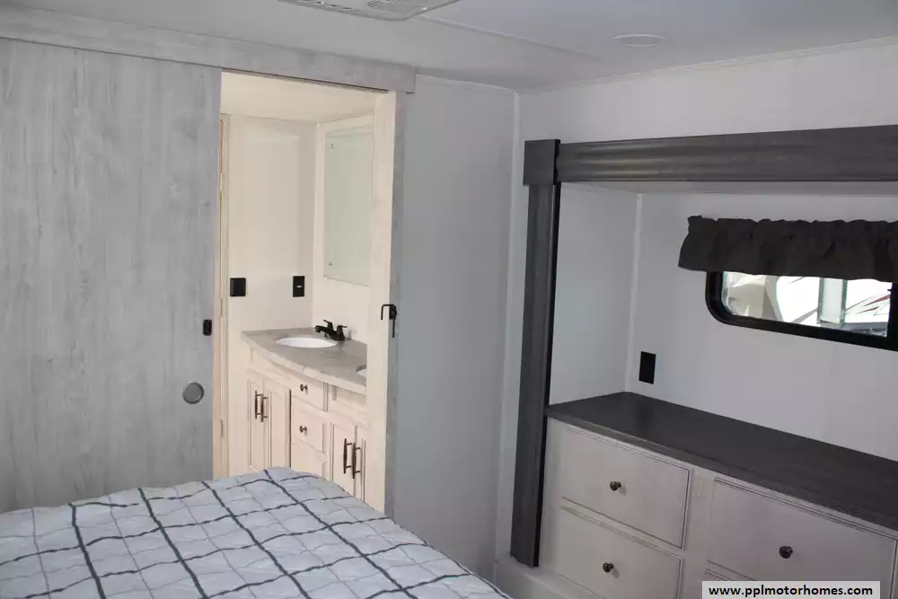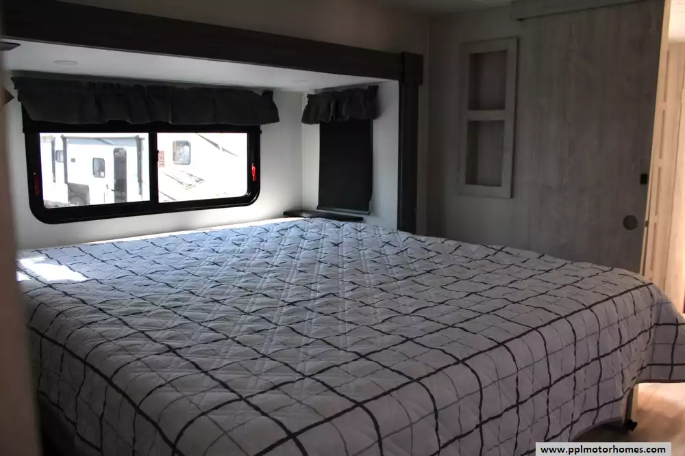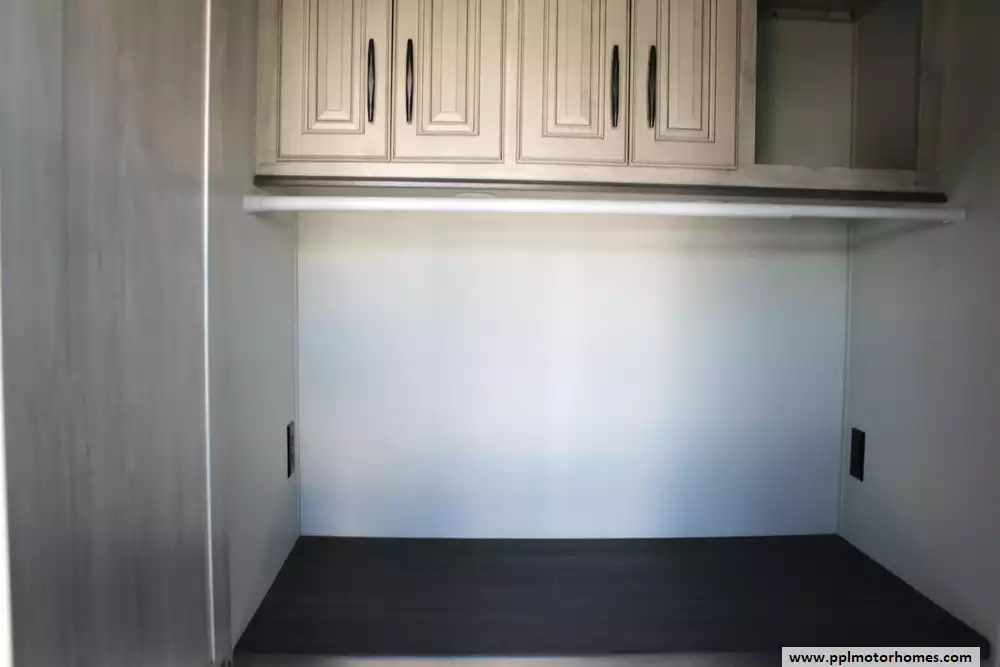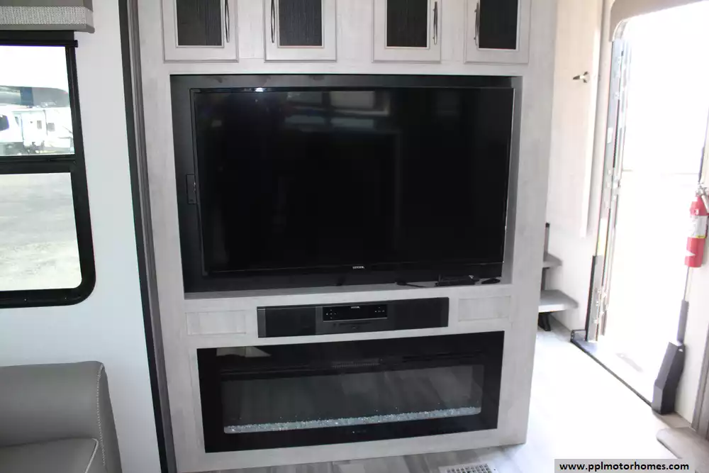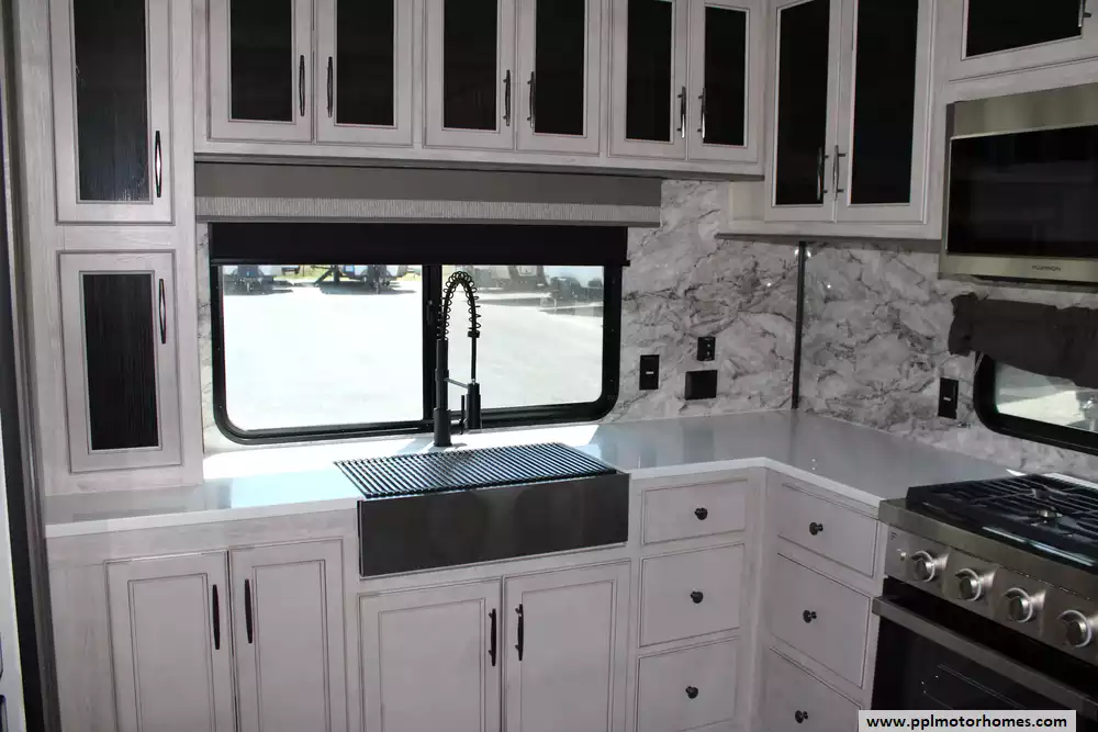Step inside and enjoy a large open living area with opposing slides, theater seating, a tri-fold sofa, a fireplace, and a big-screen LED TV for entertainment. The stunning rear kitchen comes equipped with solid surface countertops, stainless steel appliances, a full-size refrigerator, and plenty of cabinetry, plus a bar-style counter for cooking and hosting. The private master suite features a king-size bed with a custom purple mattress, a large wardrobe, and direct access to a deluxe bathroom with dual sinks and a residential shower. A dedicated laundry room with washer/dryer prep makes extended stays even more convenient.