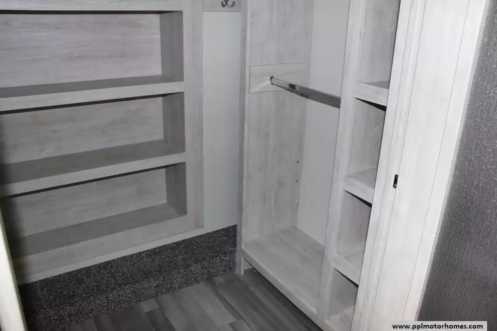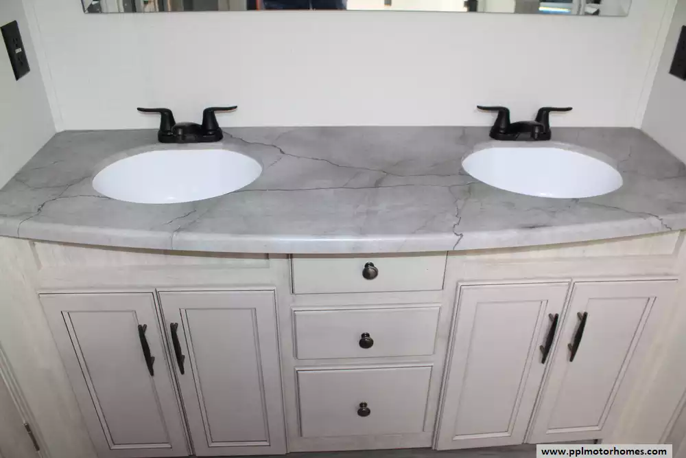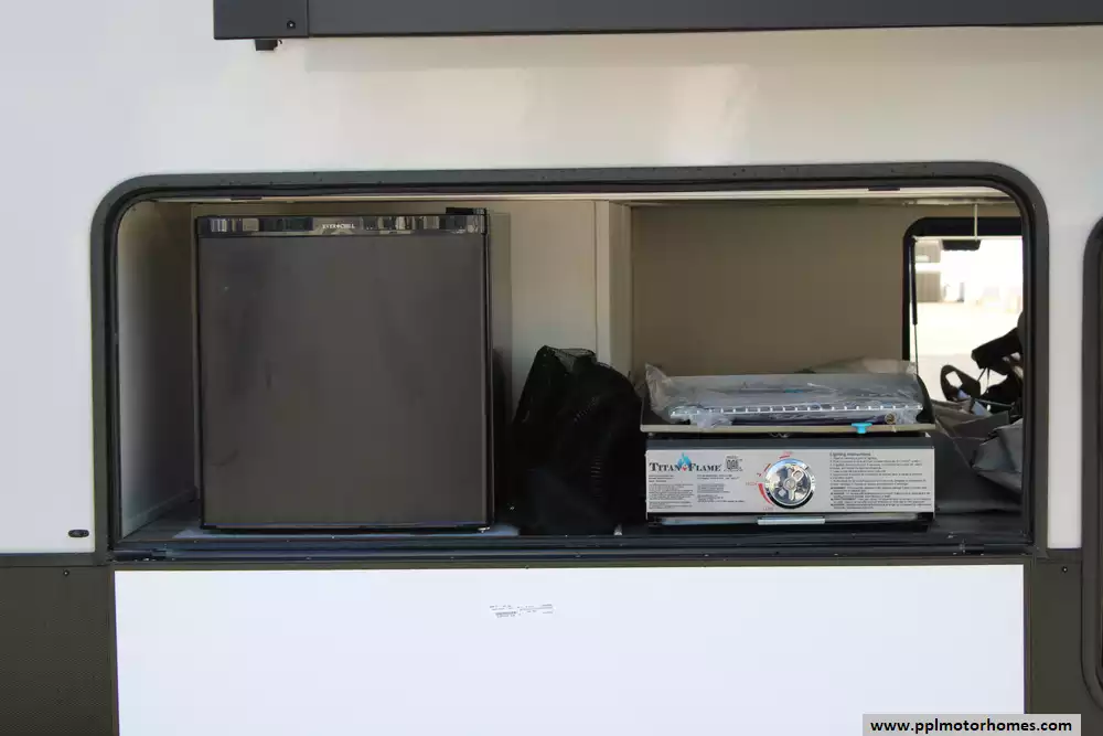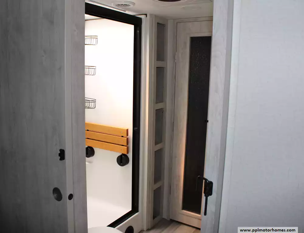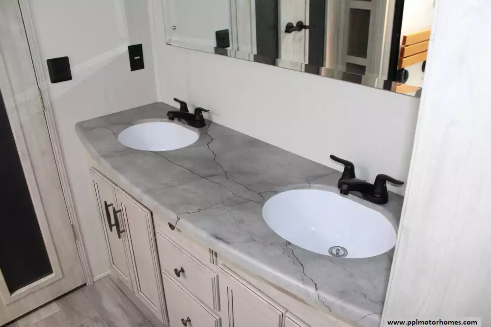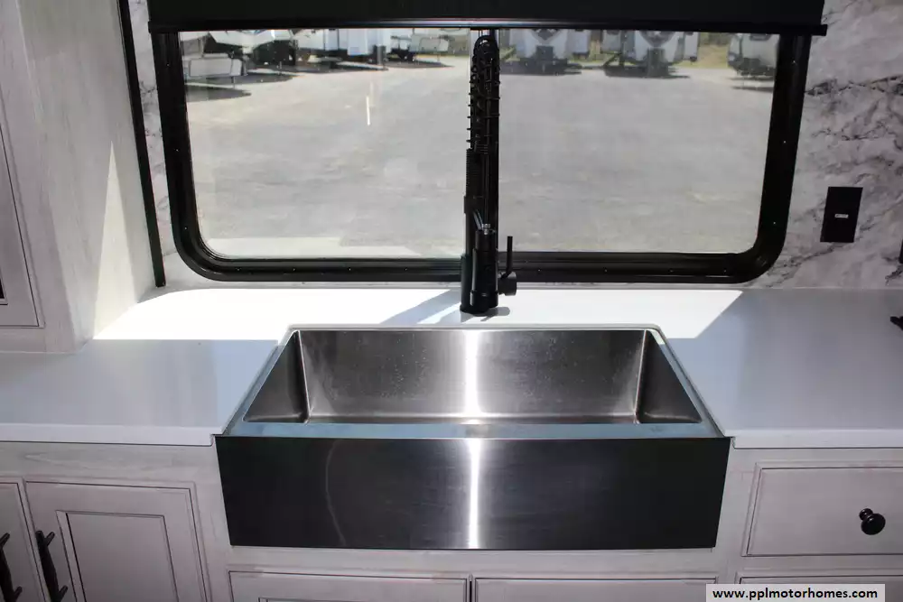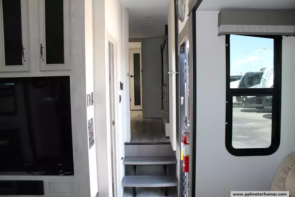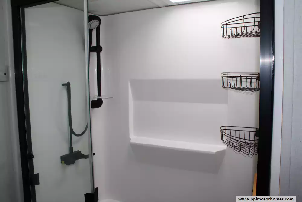 Step inside and enjoy a large open living area with opposing slides, theater seating, a tri-fold sofa, a fireplace, and a big-screen LED TV for entertainment. The stunning rear kitchen comes equipped with solid surface countertops, stainless steel appliances, a full-size refrigerator, and plenty of cabinetry, plus a bar-style counter for cooking and hosting. The private master suite features a king-size bed with a custom purple mattress, a large wardrobe, and direct access to a deluxe bathroom with dual sinks and a residential shower. A dedicated laundry room with washer/dryer prep makes extended stays even more convenient.