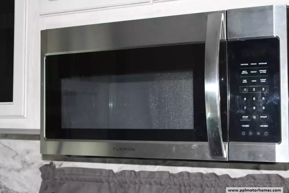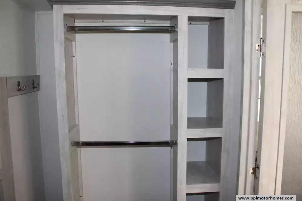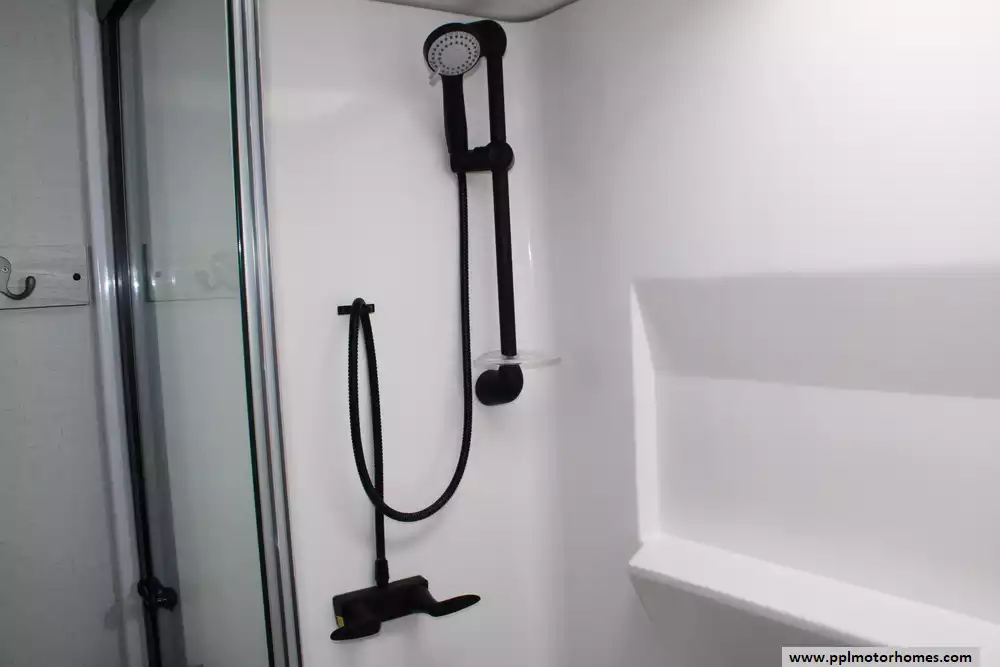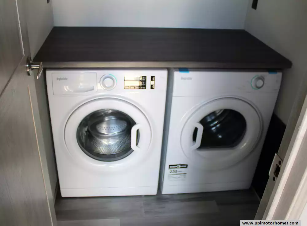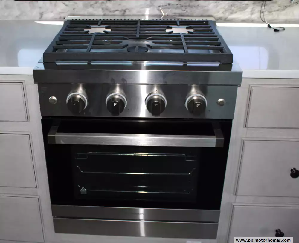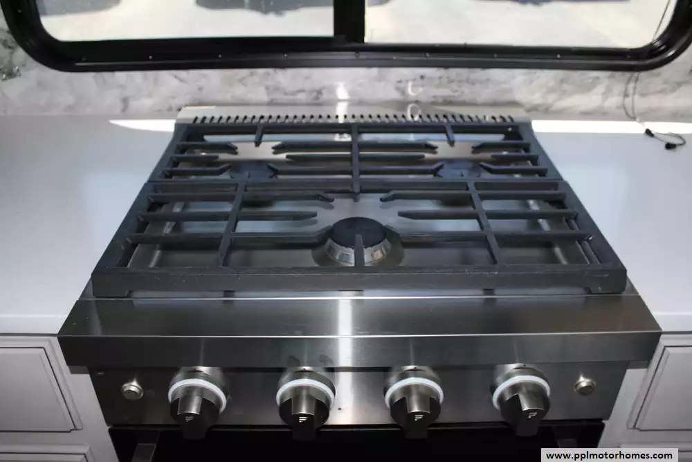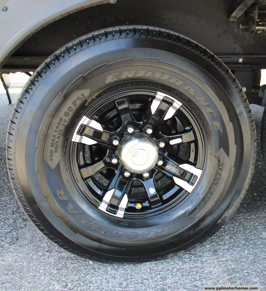 Step inside and enjoy a large open living area with opposing slides, theater seating, a tri-fold sofa, a fireplace, and a big-screen LED TV for entertainment. The stunning rear kitchen comes equipped with solid surface countertops, stainless steel appliances, a full-size refrigerator, and plenty of cabinetry, plus a bar-style counter for cooking and hosting. The private master suite features a king-size bed with a custom purple mattress, a large wardrobe, and direct access to a deluxe bathroom with dual sinks and a residential shower. A dedicated laundry room with washer/dryer prep makes extended stays even more convenient.