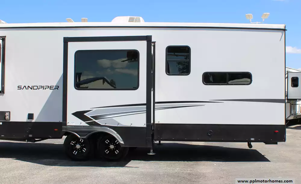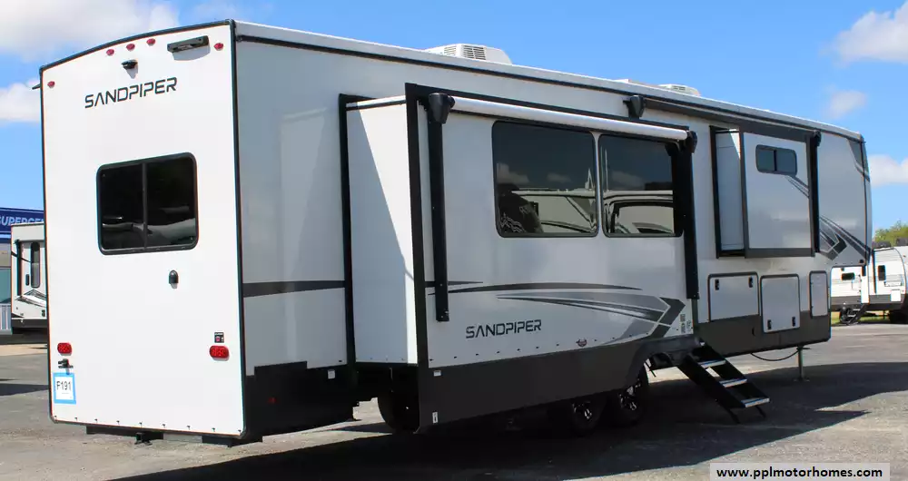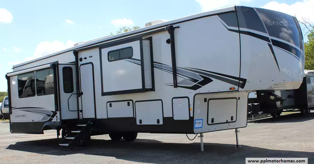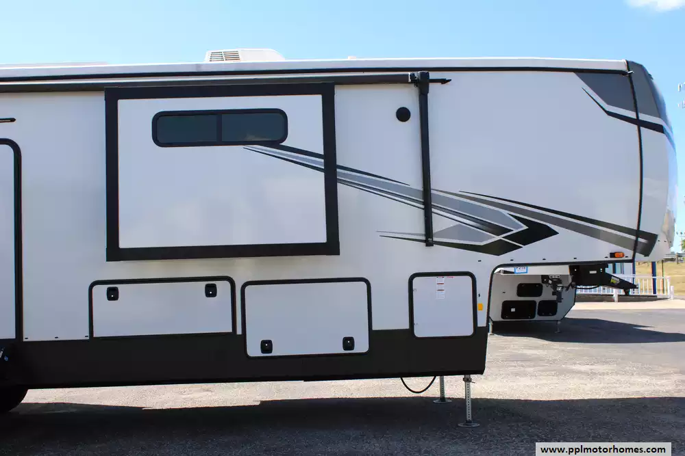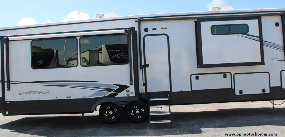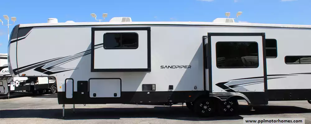 This unit is fully outfitted for travel and comfort, featuring dual whisper-quiet A/C units, dual power awnings with LED lighting, backup camera, roof tarp protector, tripod, and on-the-go ladder prep. Outside you'll also find a custom skirt around the unit for extra protection and style, plus abundant pass-through storage for gear. With its luxury features, thoughtful upgrades, and Forest River's reputation for quality, the Sandpiper 3800RK is the ultimate choice for buyers who want a fifth wheel that's road-ready, adventure-ready, and home-like all at once.