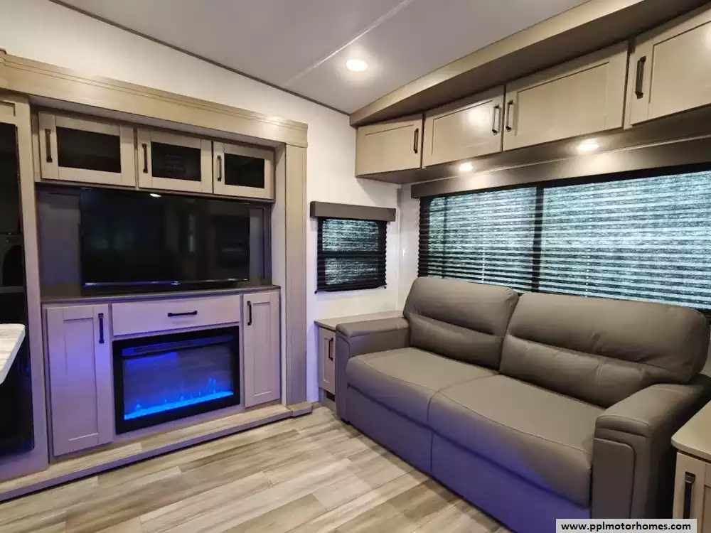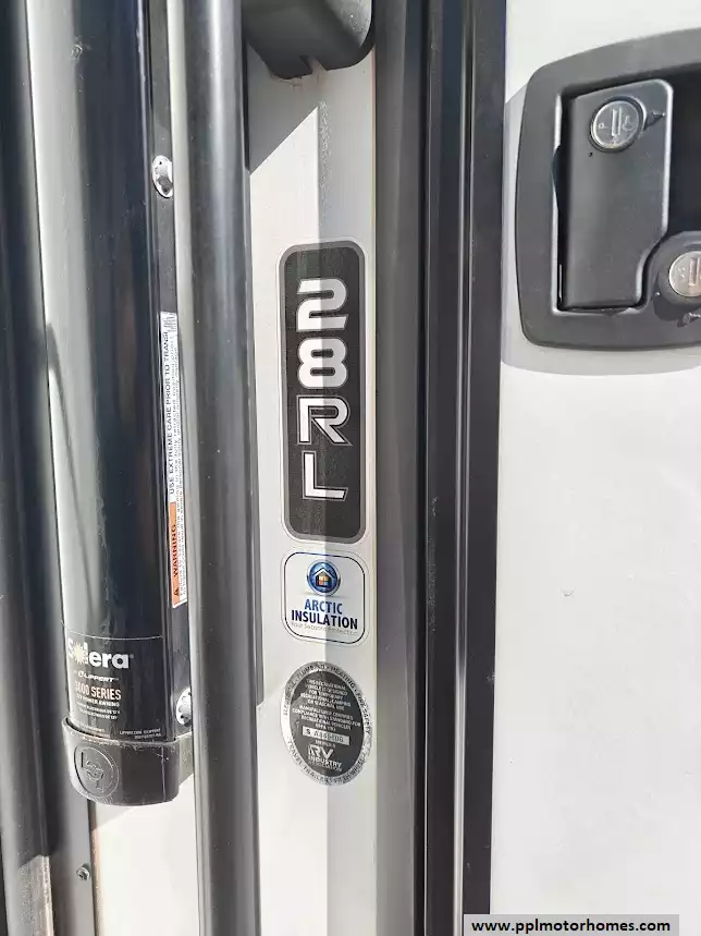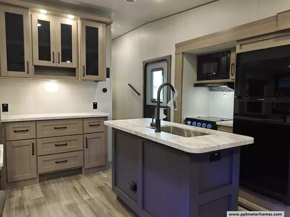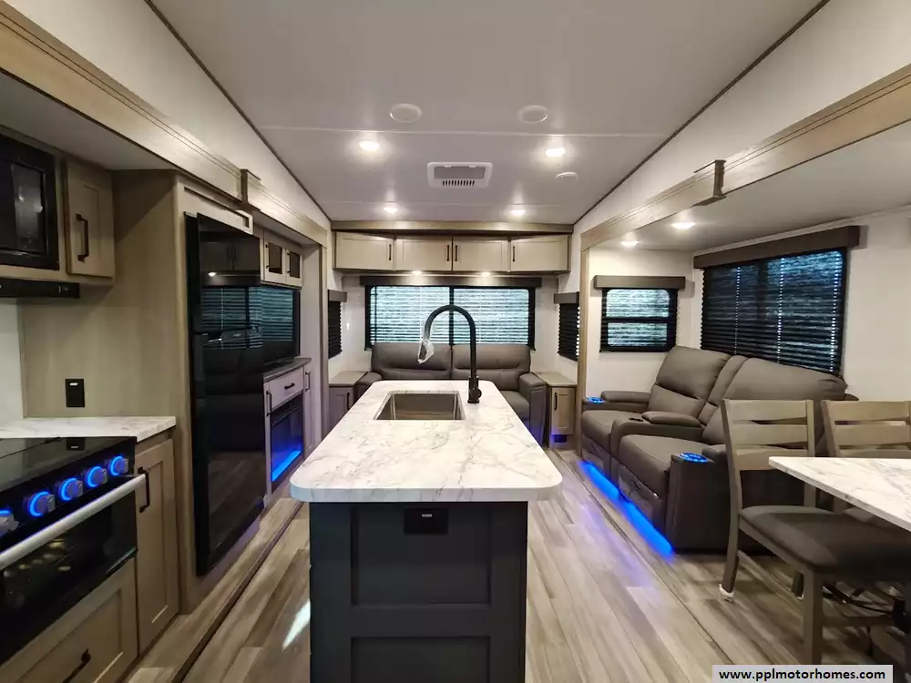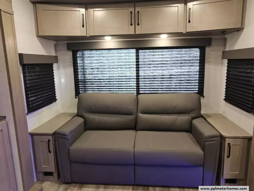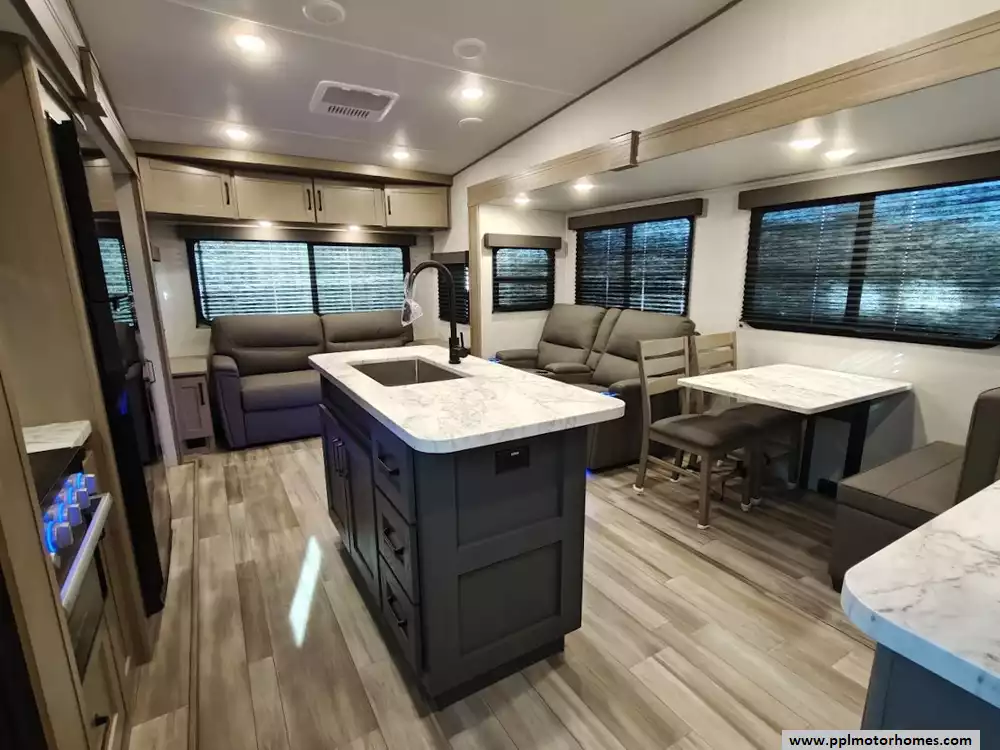 The 2024 Grand Design Reflection 100 Series 28RL is a lightweight, half-ton towable fifth wheel designed for affordable camping without sacrificing features. It features a rear living area with dual opposing slides, a kitchen island, and a front private bedroom. The highlight of the kitchen is the large central island, which offers ample counter space for food preparation and houses a deep-seated stainless steel sink. The sink features a high-rise faucet with a pullout sprayer head. The kitchen is equipped with modern appliances for extended camping a 2 door Furrion refridgerator, 3 burner range and microwave. The kitchen includes solid hardwood drawer fronts, storage options within the island itself and additional cabinetry along the walls. The living area is designed to maximize comfort and space through dual opposing slide-outs, providing a roomy and open feel for relaxation and entertaining guests. The bedroom is located in the very front of the RV and is separate for privacy. It houses a queen walkaround bed with overhead and bedside storage, as well as USB and USB-C charging ports. A large closet provides hanging space and drawers. The bathroom has a spacious residential walk-in shower provides plenty of elbow and headroom, and features a skylight for additional natural light.