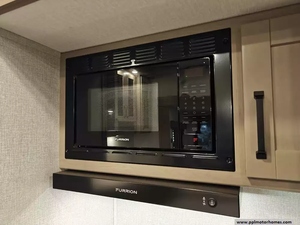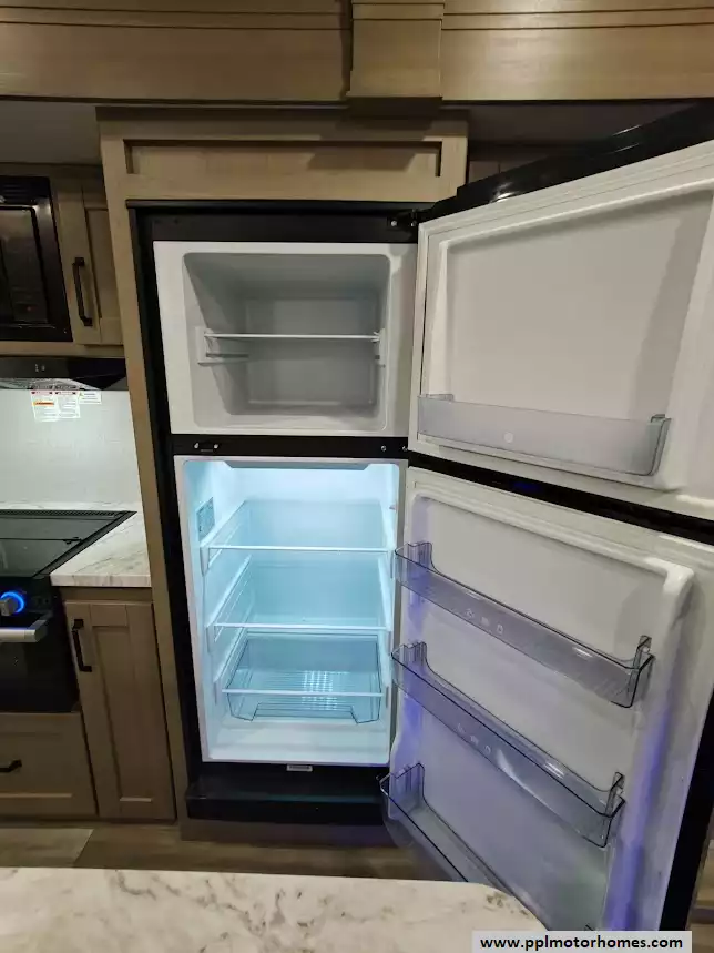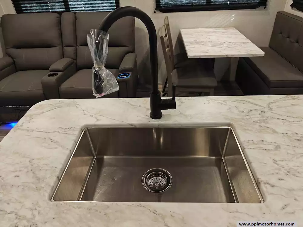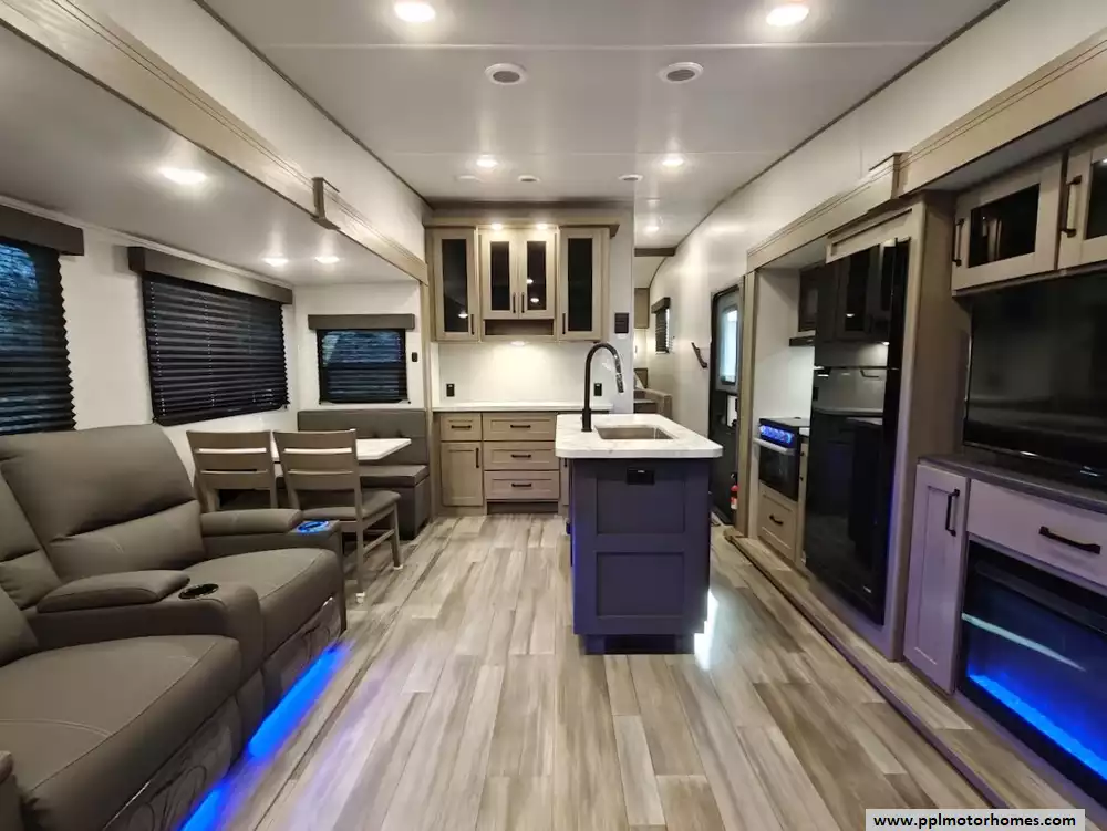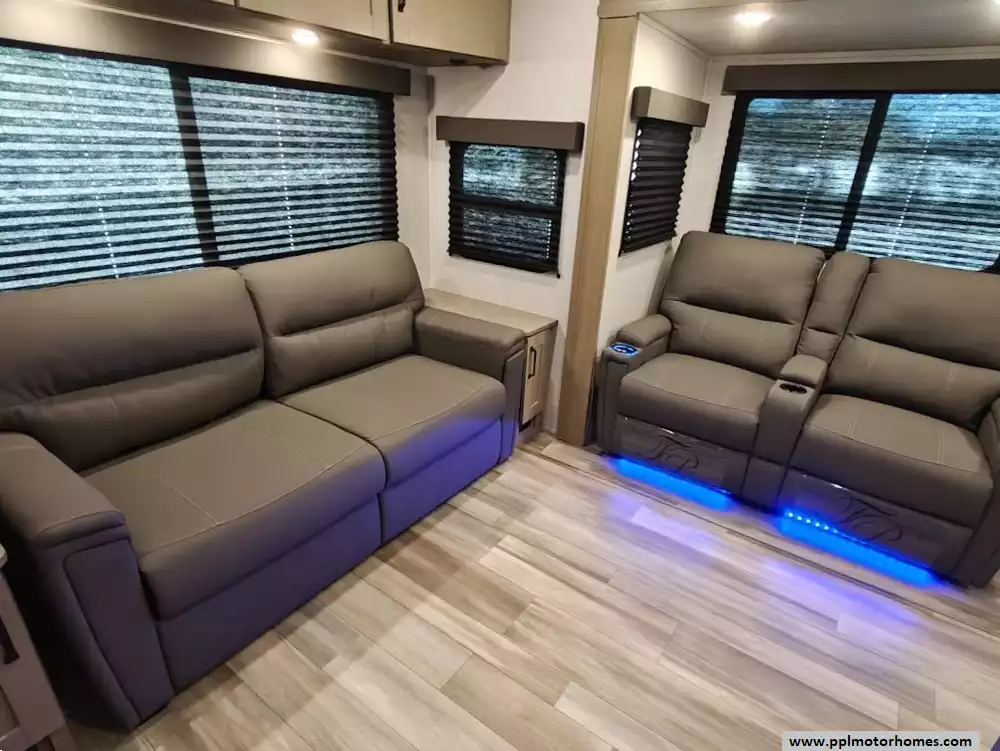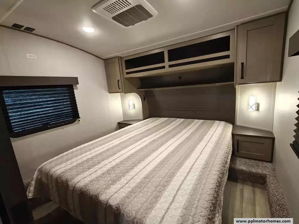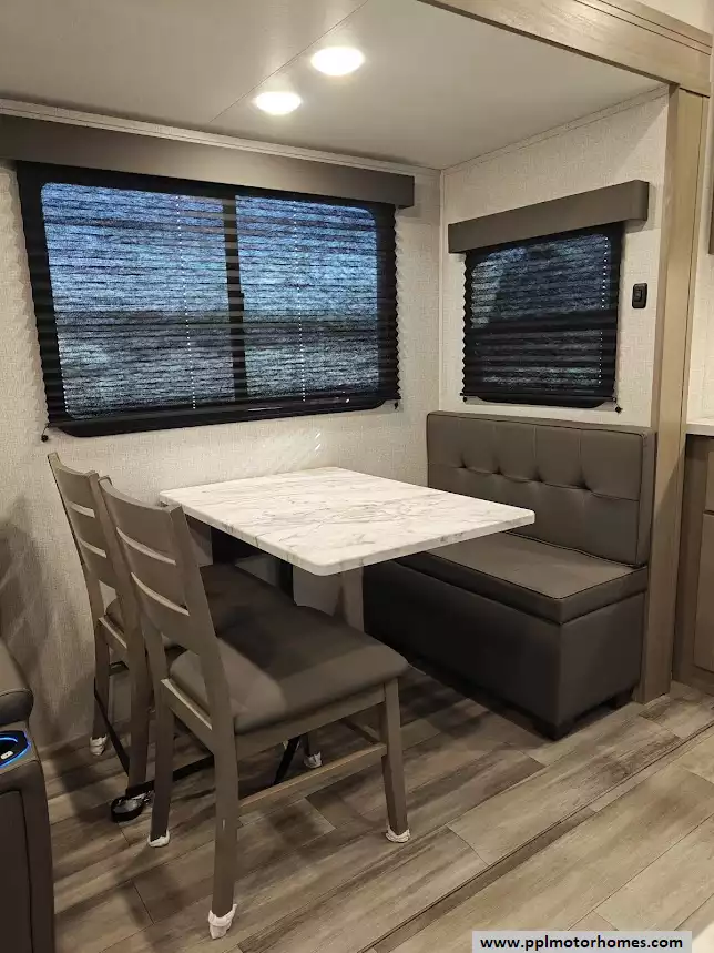 The 2024 Grand Design Reflection 100 Series 28RL is a lightweight, half-ton towable fifth wheel designed for affordable camping without sacrificing features. It features a rear living area with dual opposing slides, a kitchen island, and a front private bedroom. The highlight of the kitchen is the large central island, which offers ample counter space for food preparation and houses a deep-seated stainless steel sink. The sink features a high-rise faucet with a pullout sprayer head. The kitchen is equipped with modern appliances for extended camping a 2 door Furrion refridgerator, 3 burner range and microwave. The kitchen includes solid hardwood drawer fronts, storage options within the island itself and additional cabinetry along the walls. The living area is designed to maximize comfort and space through dual opposing slide-outs, providing a roomy and open feel for relaxation and entertaining guests. The bedroom is located in the very front of the RV and is separate for privacy. It houses a queen walkaround bed with overhead and bedside storage, as well as USB and USB-C charging ports. A large closet provides hanging space and drawers. The bathroom has a spacious residential walk-in shower provides plenty of elbow and headroom, and features a skylight for additional natural light.